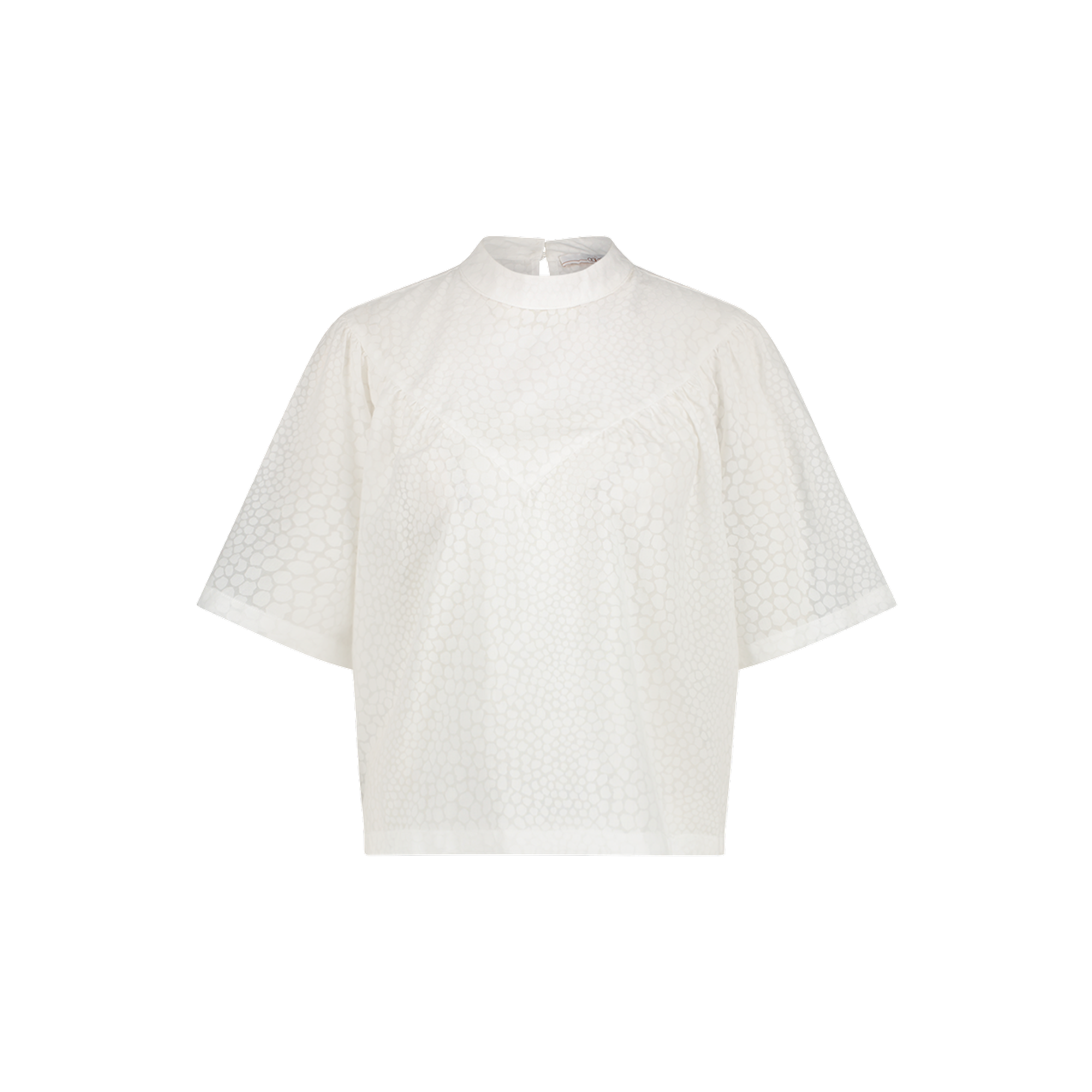Deze witte top van Aaiko heeft een all-over print, een hoge hals en driekwart mouwen. De top is losvallend en heeft een knoopsluiting achterin de nek.