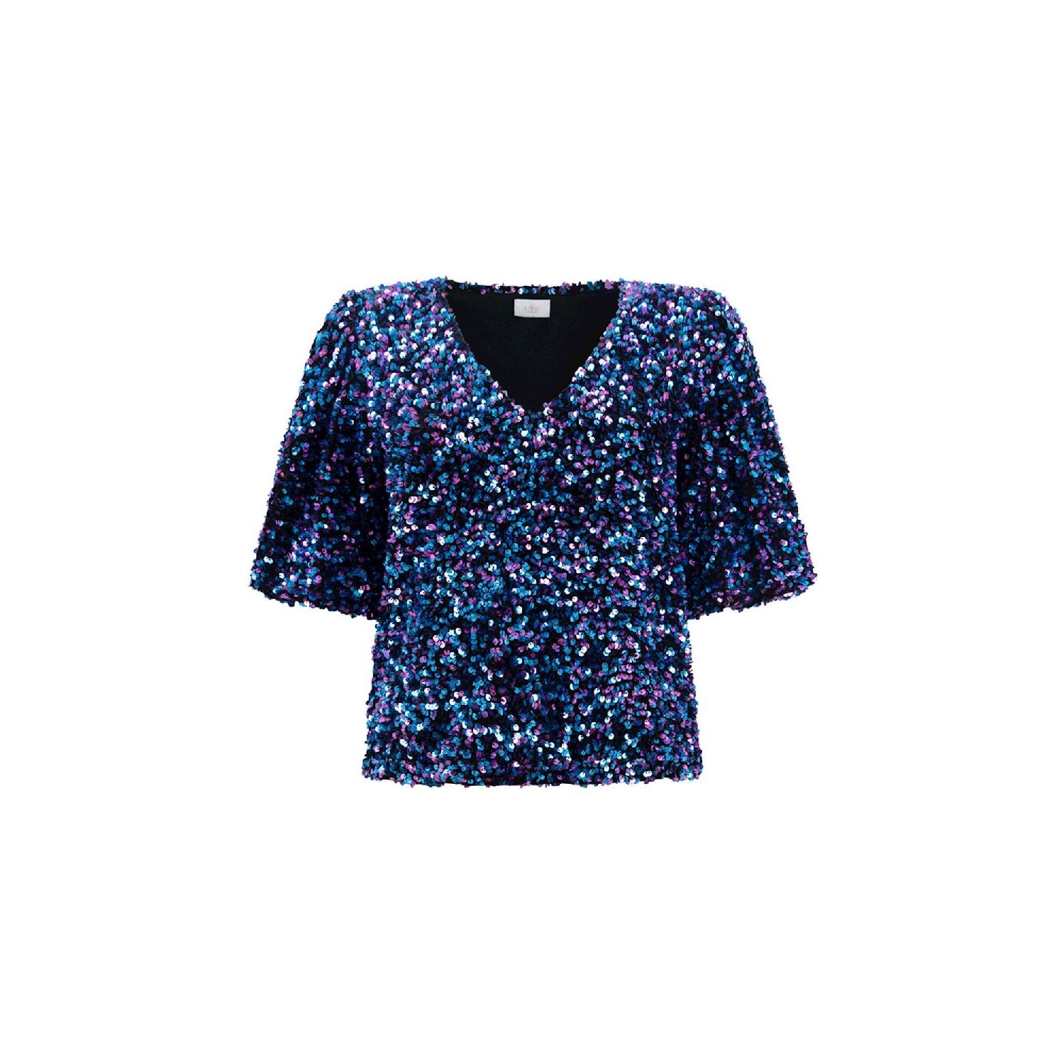 Deze Aaiko casy top is blauw en paars van kleur. Over de gehele top zitten gekleurde pailletten. De top heeft een v-hals en korte mouwen.