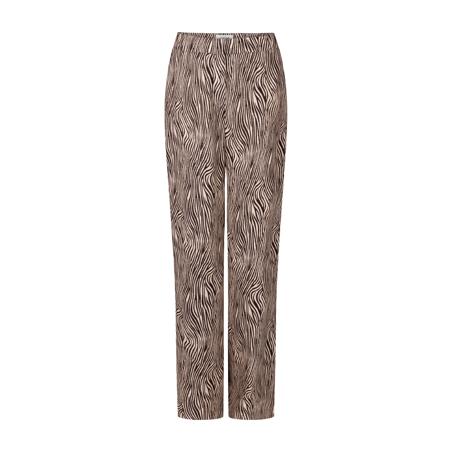 Deze Aaiko Cecilia Zebra Vis Trousers in de kleur Hazelnut is een echte statement-piece die wilde prints combineert met een warme, geraffineerde kleur. De zebra-print is uitgevoerd in een diepe hazelnootbruine tint op een lichtere basis, wat de broek een luxere en zachtere uitstraling geeft dan een traditionele zwart-witte dierenprint.