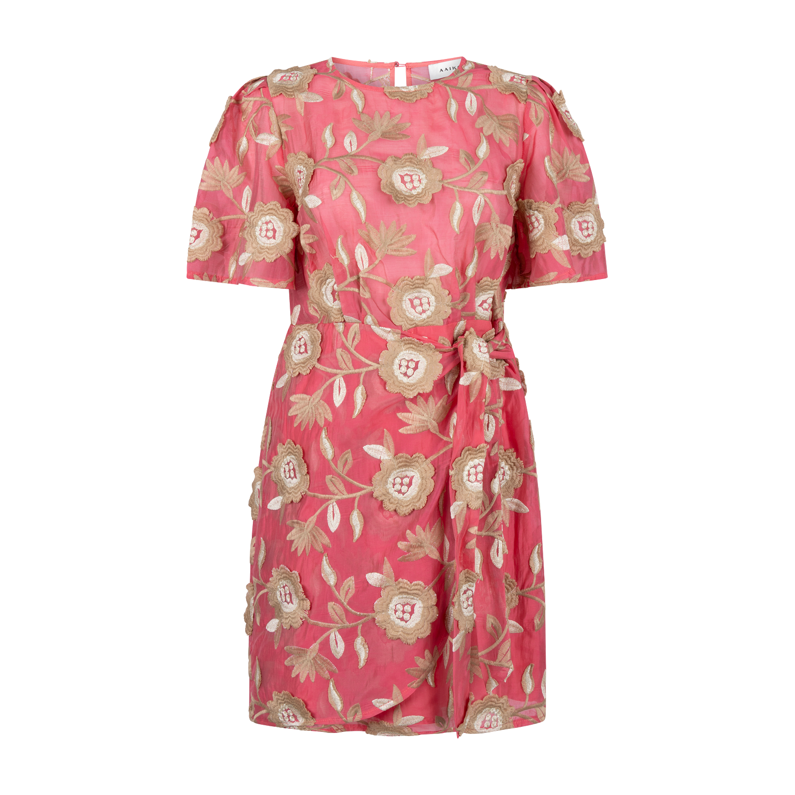 Het "3D"-aspect van de Celina jurk verwijst naar de textuur in de stof. Aaiko gebruikt vaak technieken zoals een jacquard-weving of een subtiel reliëf-patroon om de jurk diepte te geven. Hierdoor is het niet zomaar een rode jurk, maar een item met een luxe, tactiele uitstraling die minder snel kreukt en heel mooi in model blijft.