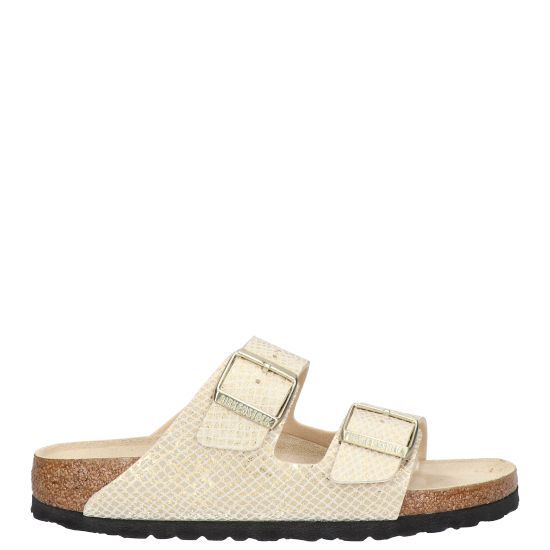 De slipper is beige van kleur met een gouden glinster erin het heeft 2 brede banden met gouden gespen en de binnenzool is van licht kurk.