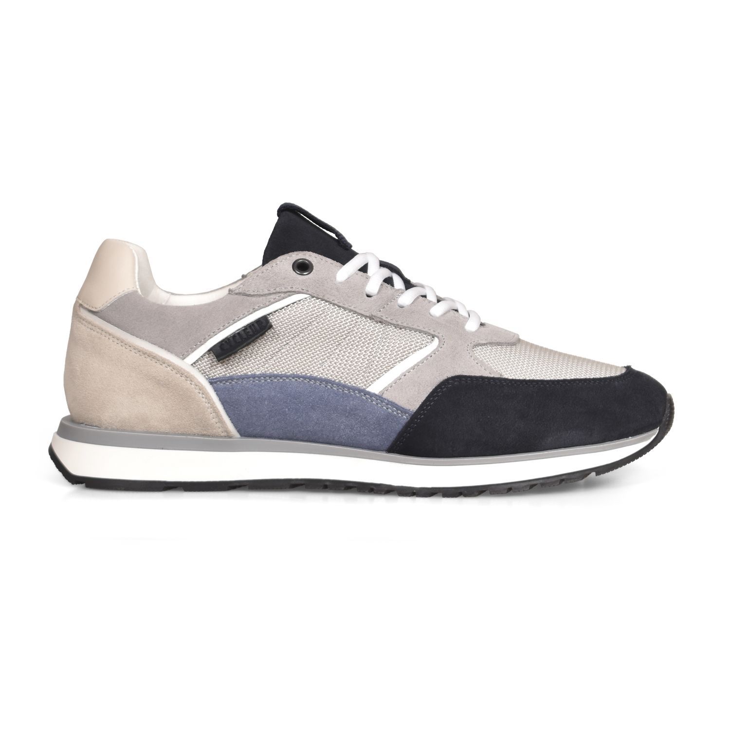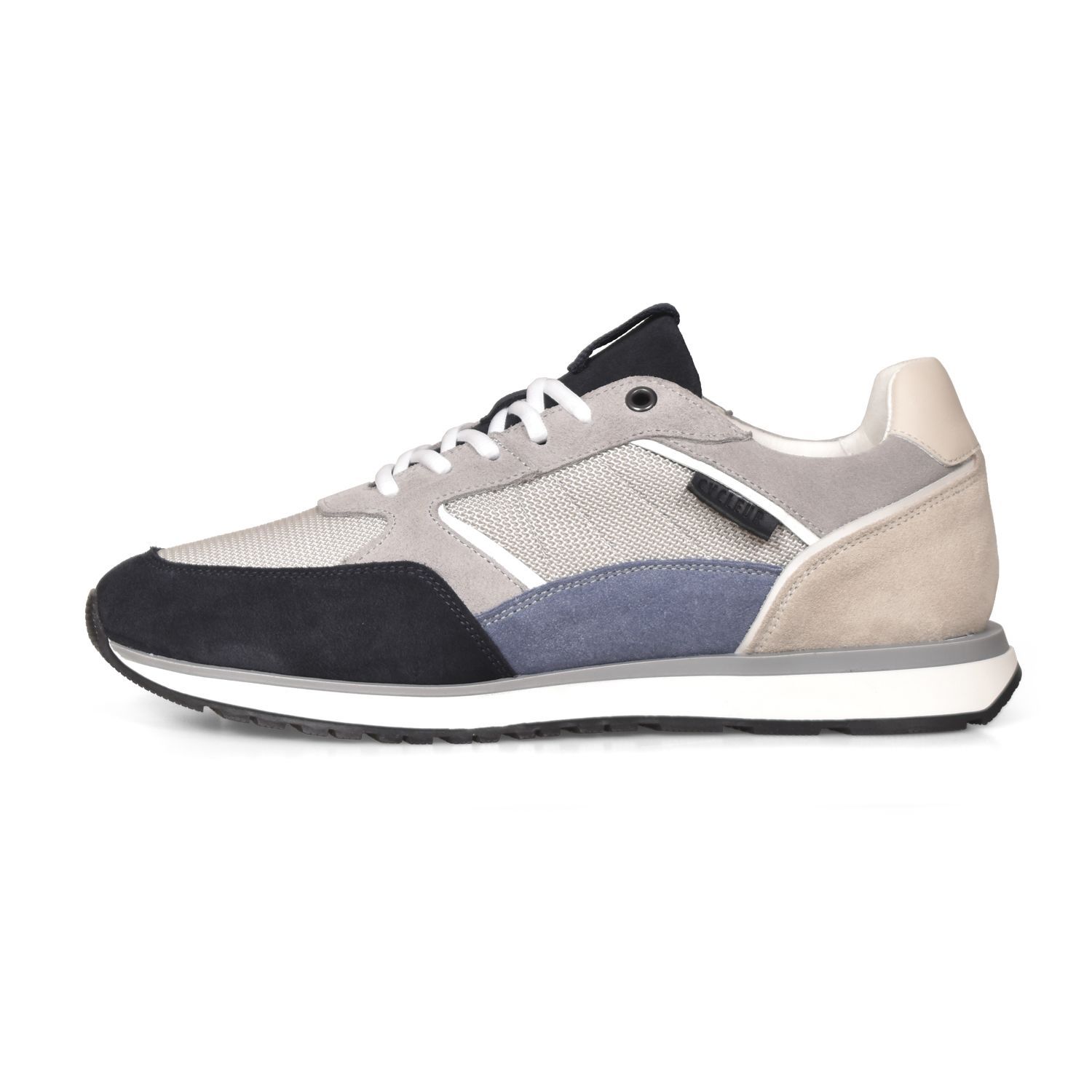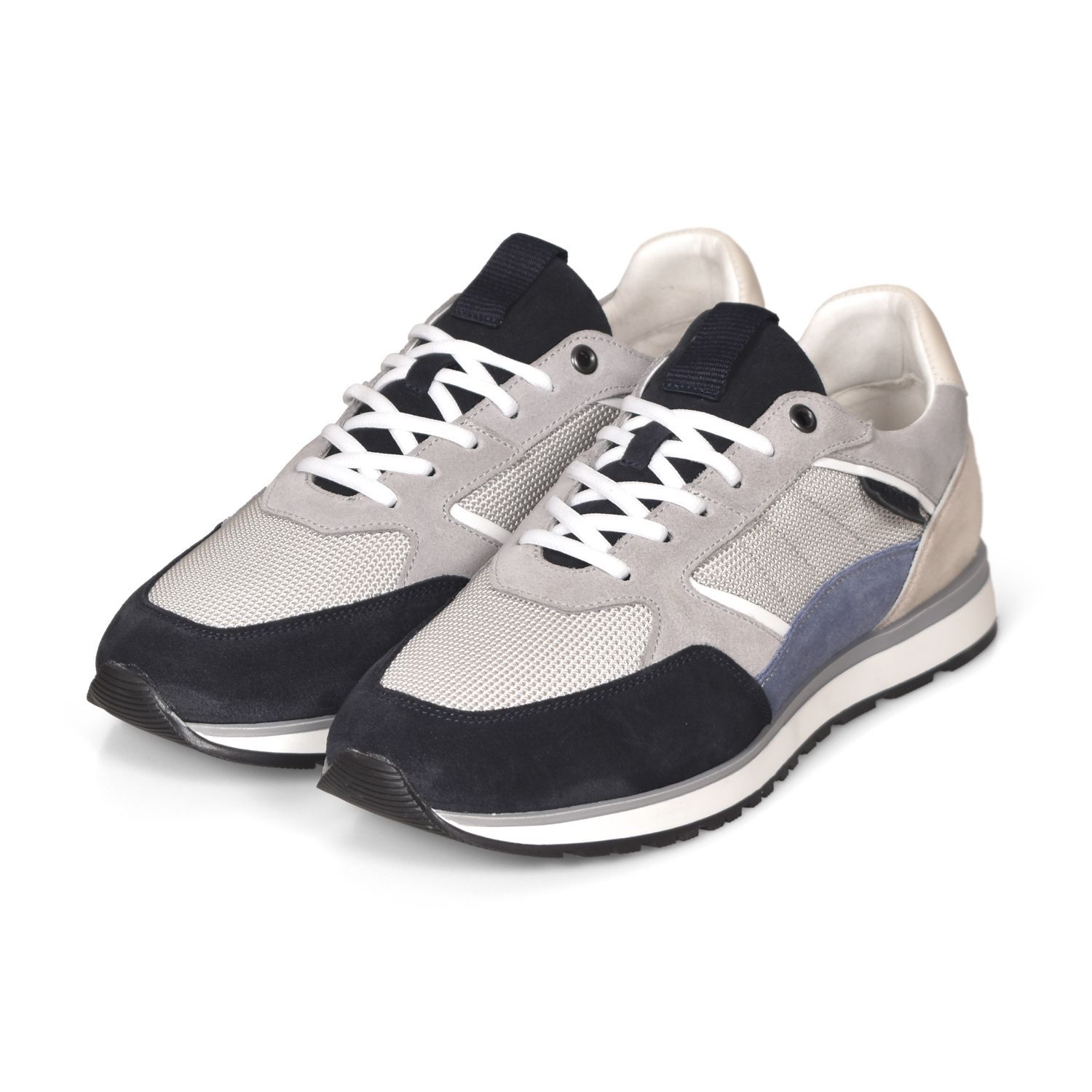 De Runoff is een stijlvolle sneaker voor heren gemaakt van een combi van zacht suede in de kleuren donkerblauw en lichtgrijs en lichtgrijs mesh voor een sportieve uitstraling. De binnenvoering van zacht leer en het leren uitneembare voetbed zorgen voor een comfortabel gevoel gedurende de dag. De witte runningzool met zwart loopvlak geeft goede grip en comfort. Match deze sportieve veterschoen voor heren bij een casual of semi-geklede outfit en je look is compleet.