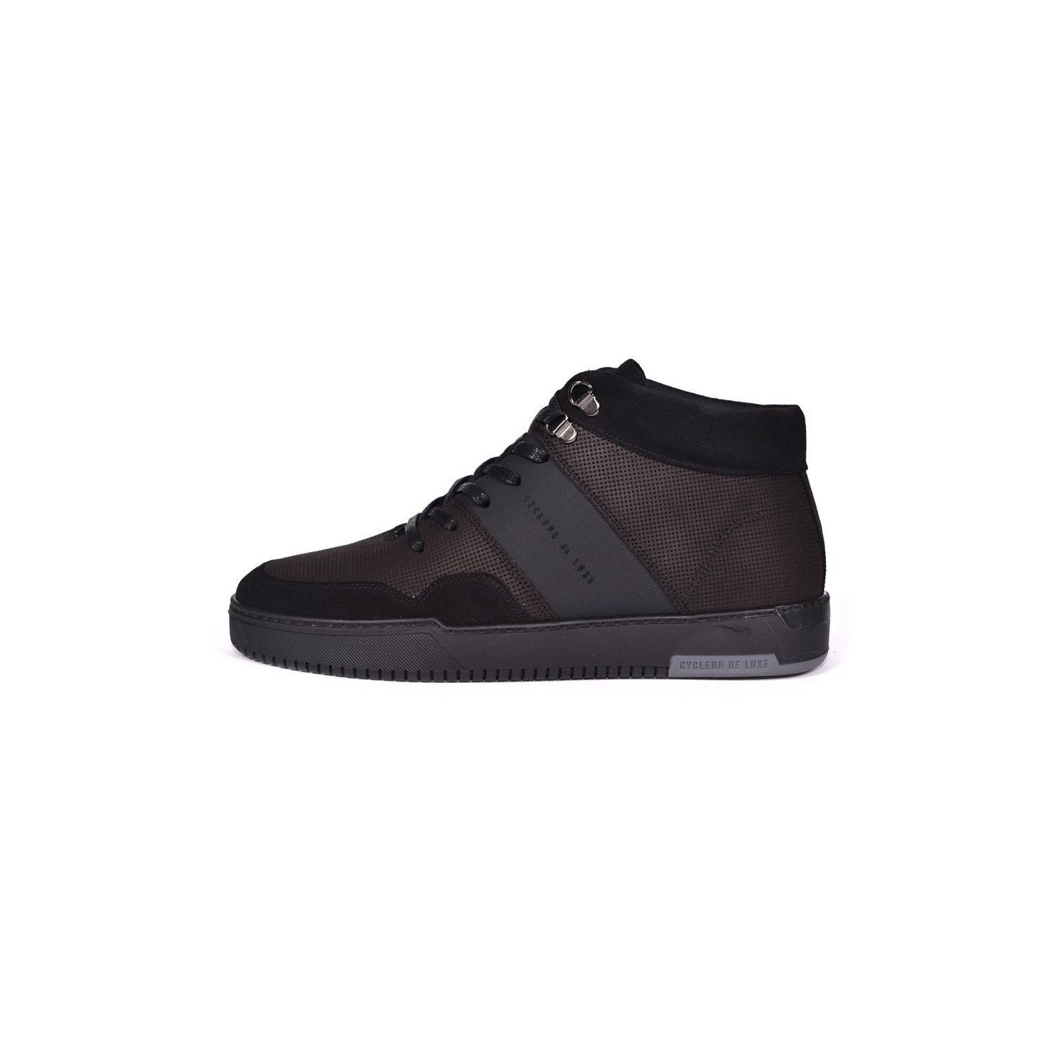 Cycluer de Luxe Sequoia is een halfhoge zwart leren sneaker met gaatjes print gecombineerd met nubuck op een zwarte cupzool. Op de zijkant van de schoen staat in zwart het Cycleur de Luxe logo. De binnenvoering en uitneembare voetbed zijn van leer. De twee bovenste vetergaten zijn voorzien van stoere hiking ringen.