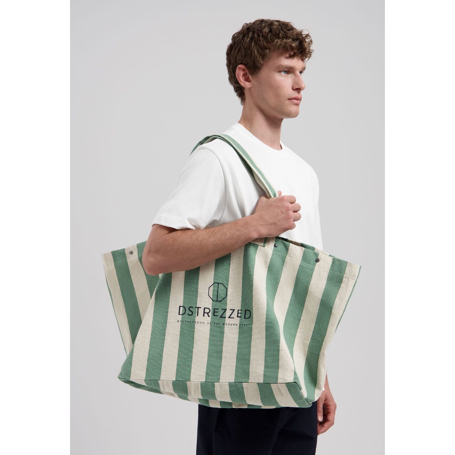 Het is een ruime shopper, meestal gemaakt van een stevige katoenen twill of een robuust canvas, waardoor hij tegen een stootje kan (en tegen een beetje zand). De tas is vaak voorzien van het herkenbare Dstrezzed-logo of een subtiele "No Strezz" print, wat hem net dat beetje extra karakter geeft.