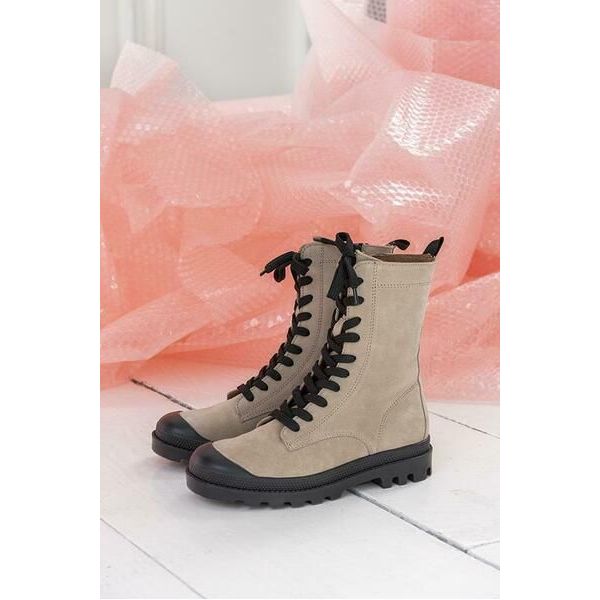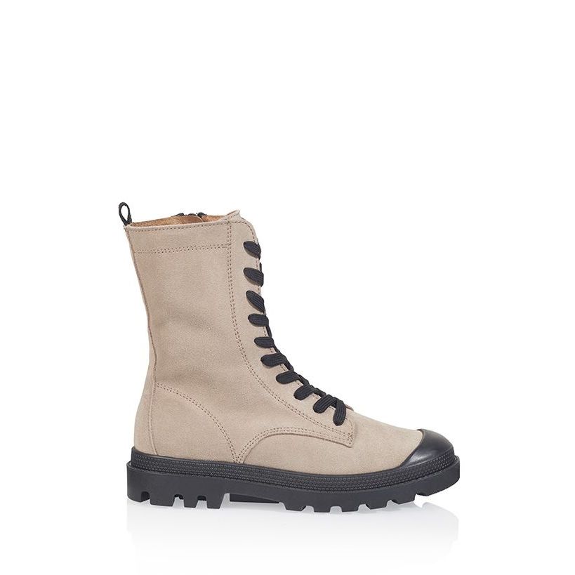 Sportieve veterboot uitgevoerd in beige suede. De stoere rubberzool in de kleur zwart is in mooi contrast met de lichte kleur van de laars. De binnenvoering is van leer en voelt zacht en comfortabel. Deze laarzen zijn iets kleiner dan normaal.