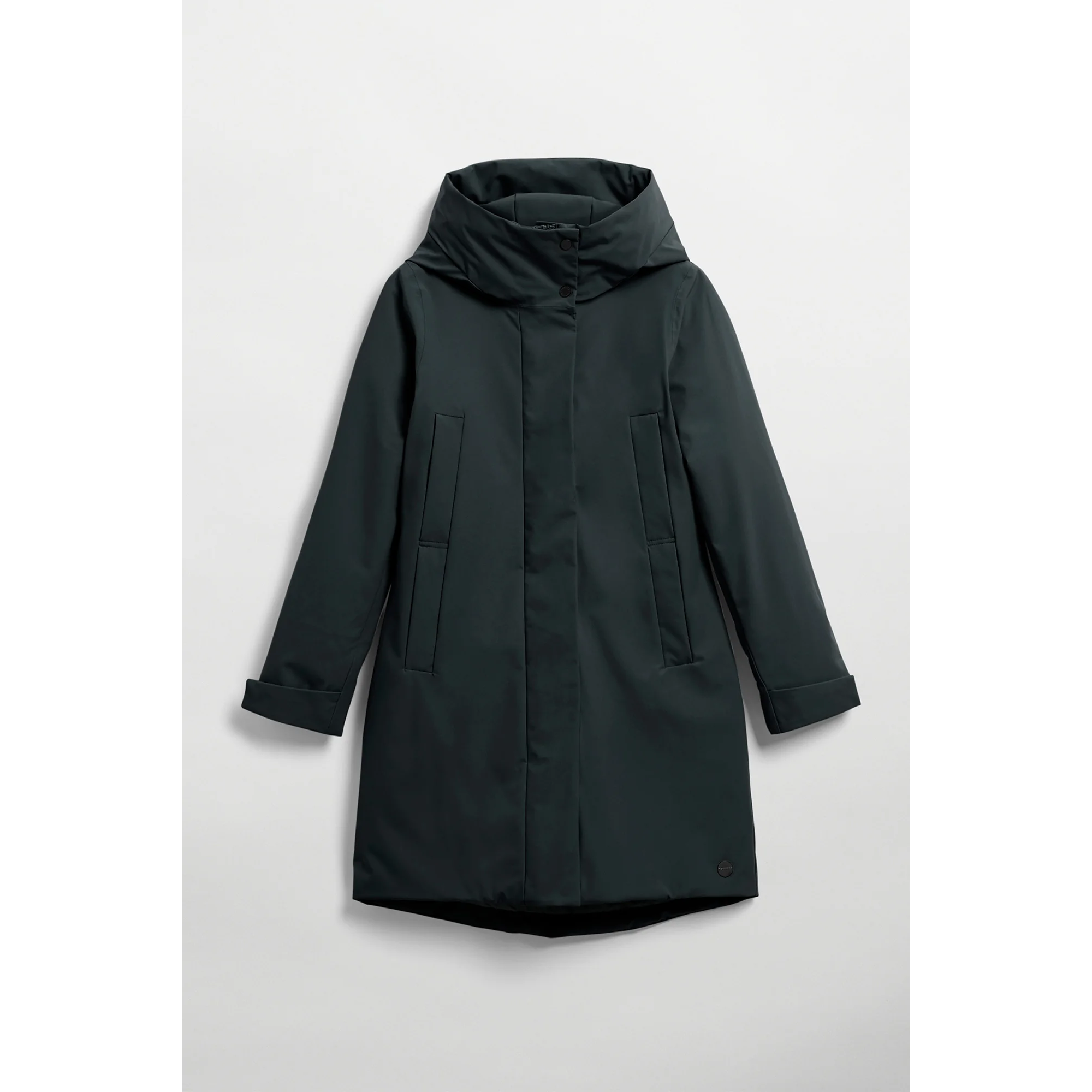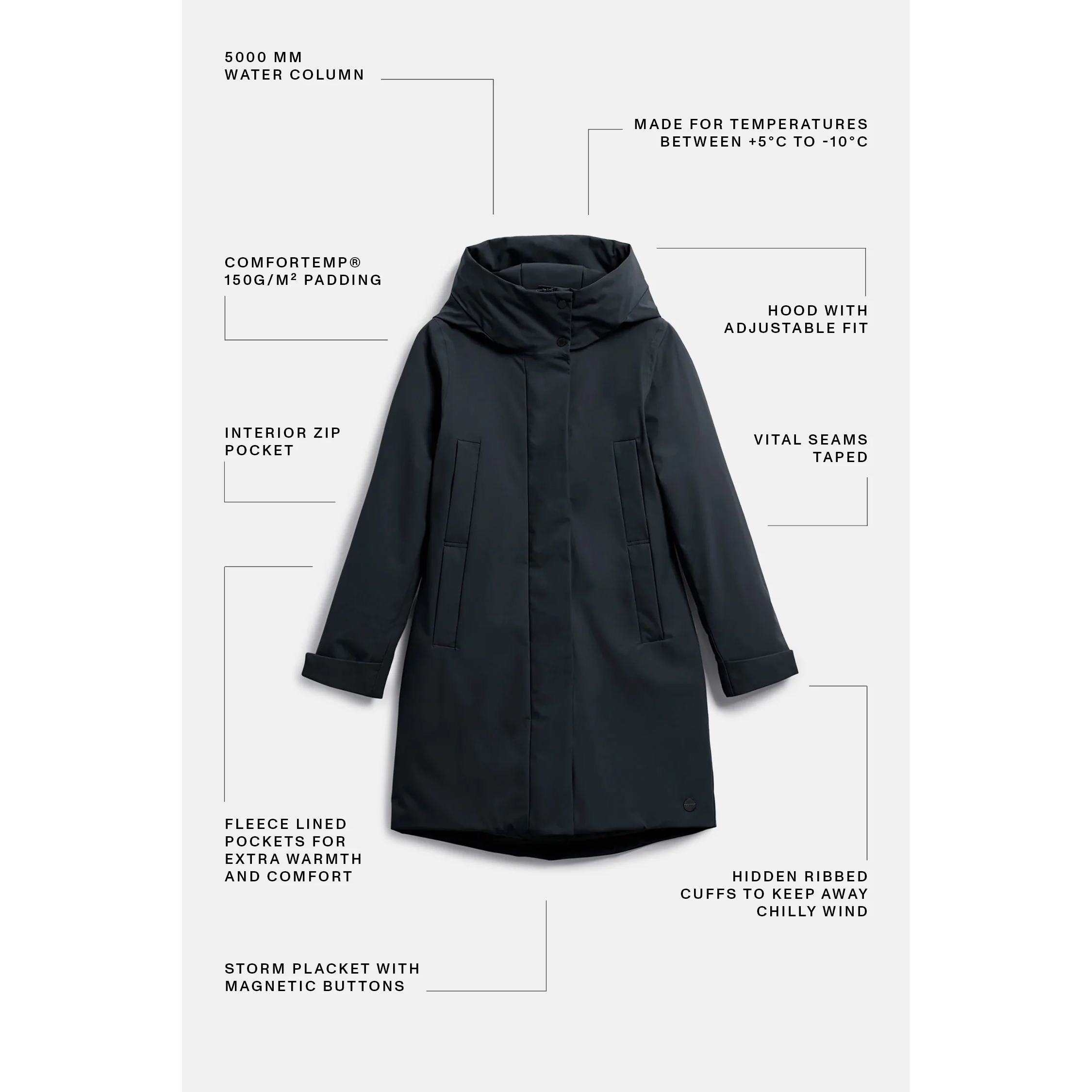 De jas, gemaakt van 100% gerecycled polyester, is duurzaam, waterafstotend (5000 mm waterkolom) en veganistisch