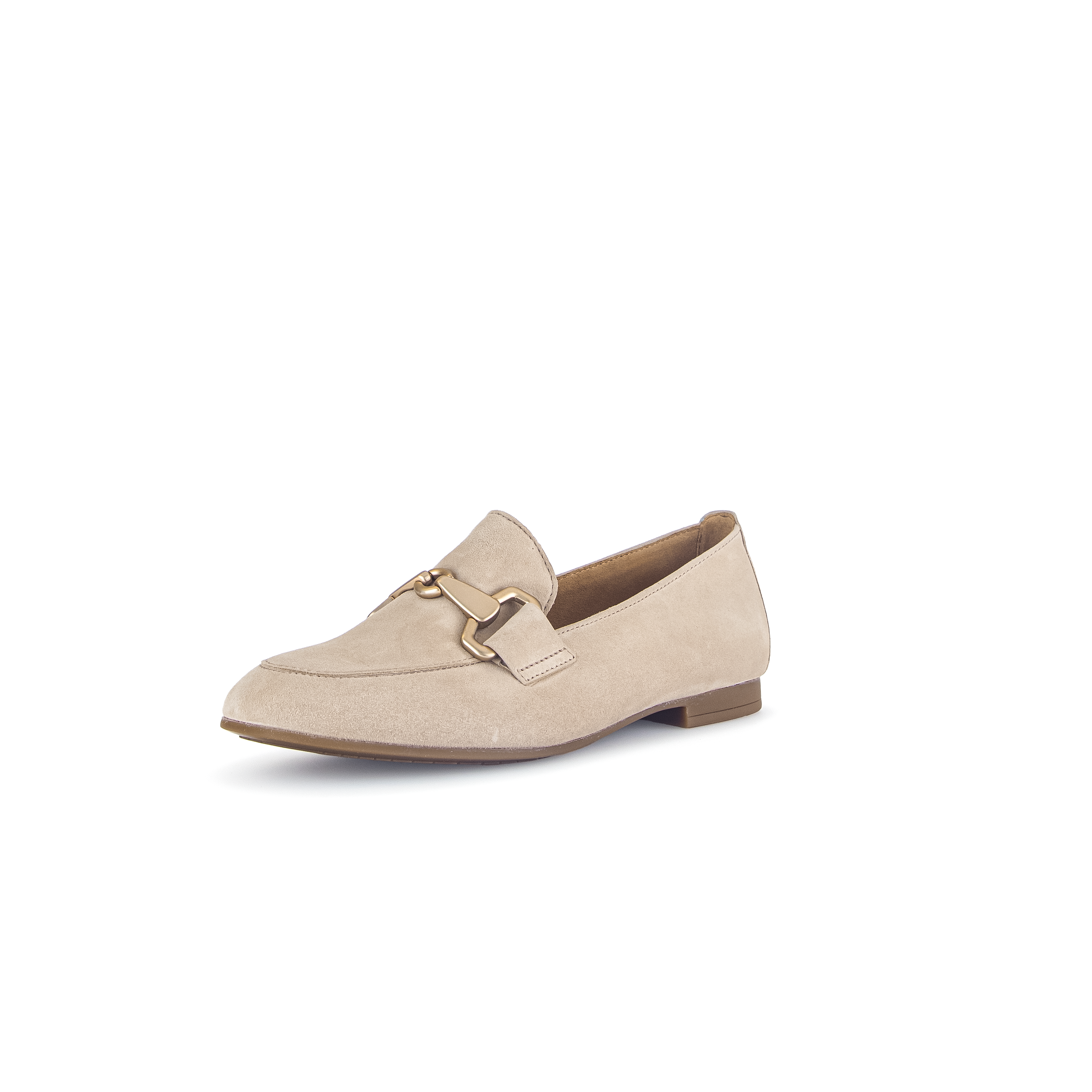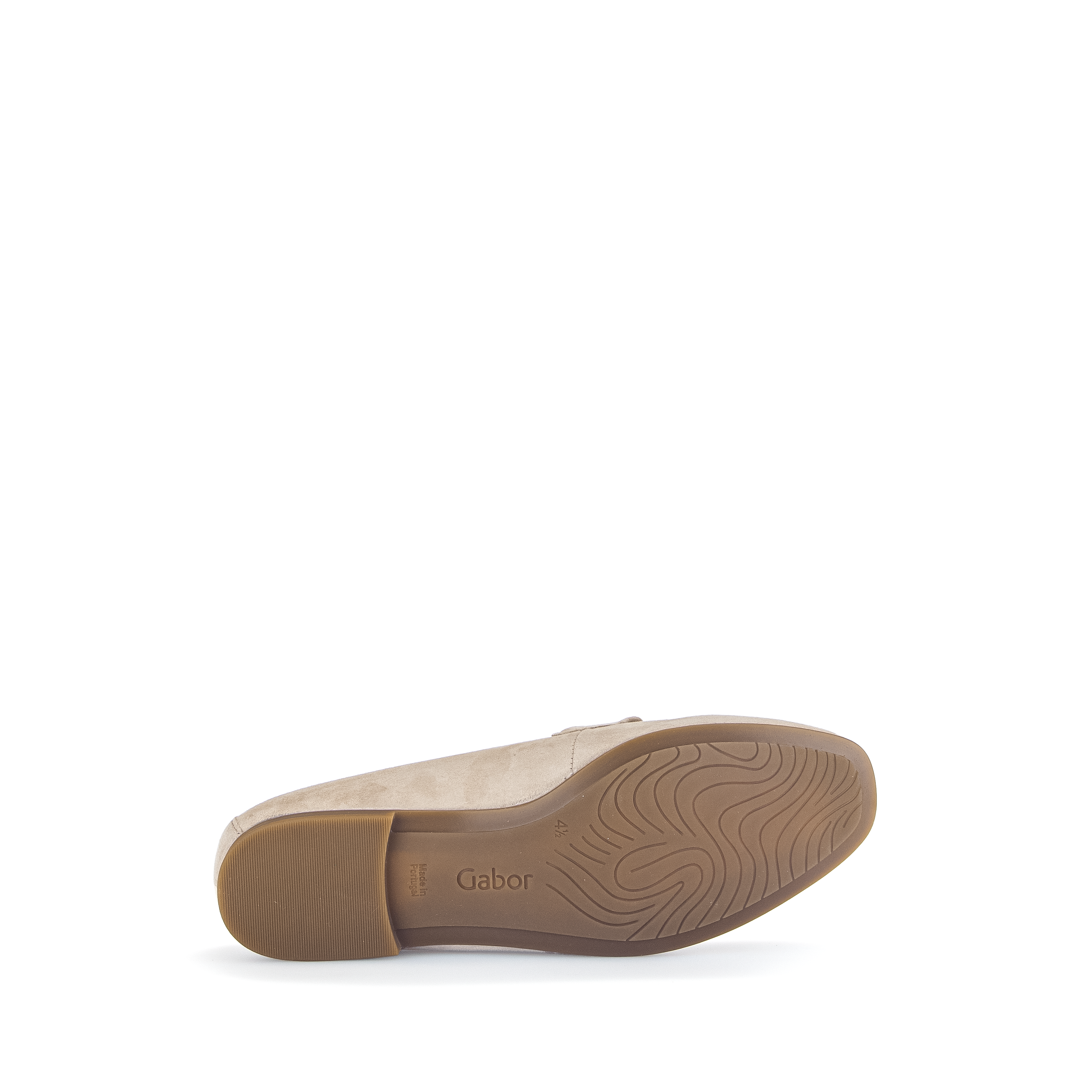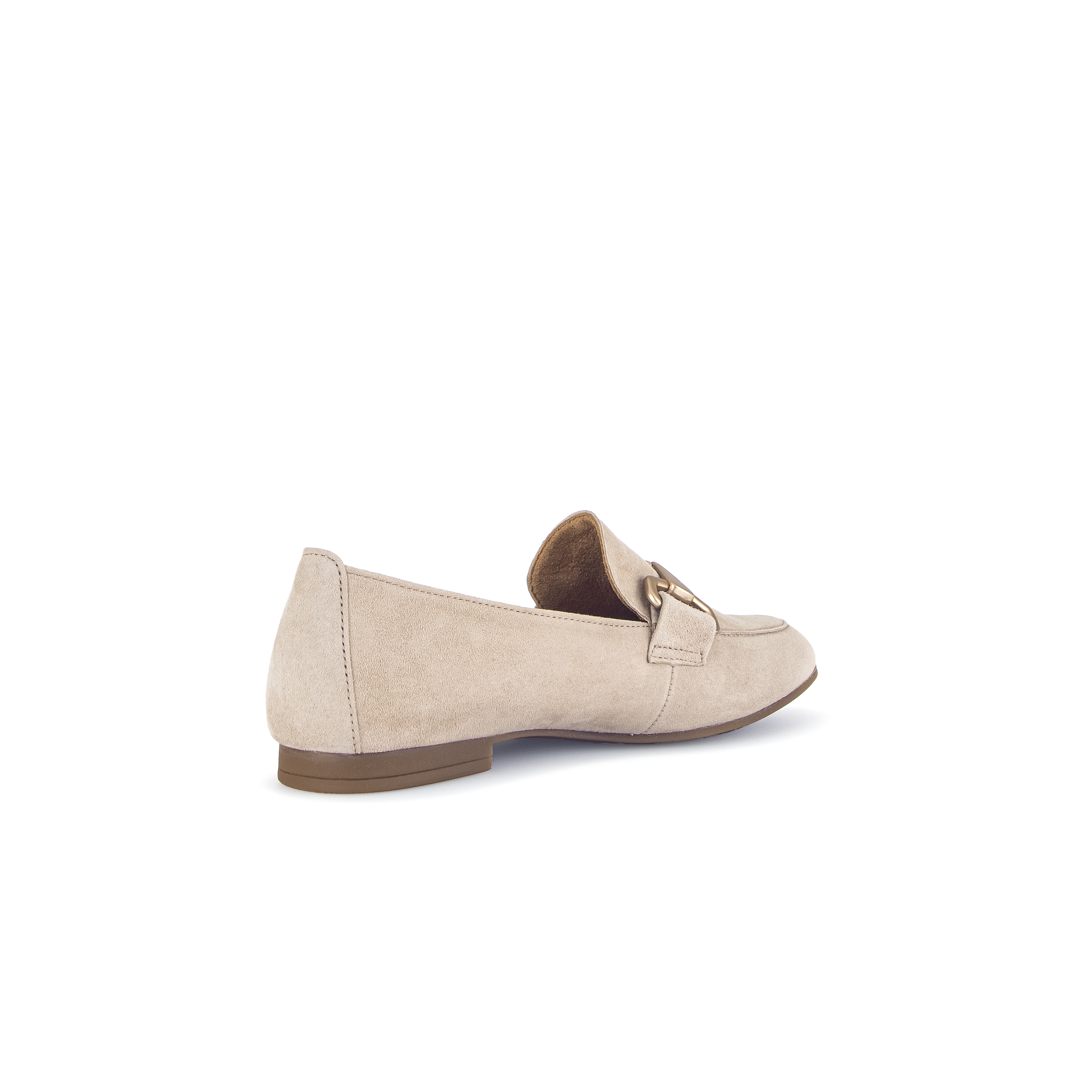Deze elegante beige loafer voor dames heeft een matgouden bitje op de wreef. De loafer is gemaakt van comfortabel soepel suede, heeft een zachte binnenvoering en leren voetbed met een verende foamlaag. Het rubberen zooltje is soepel en geeft grip.