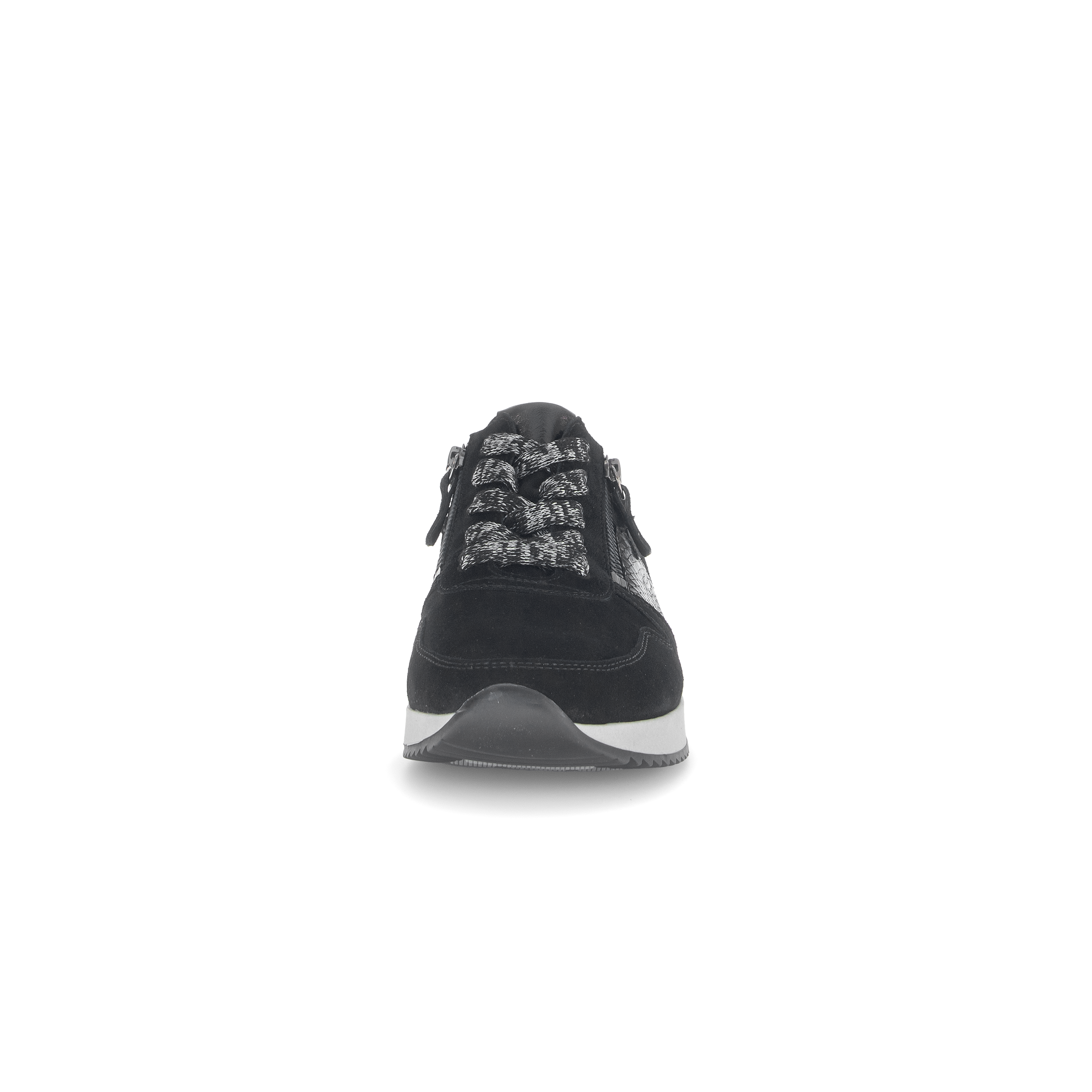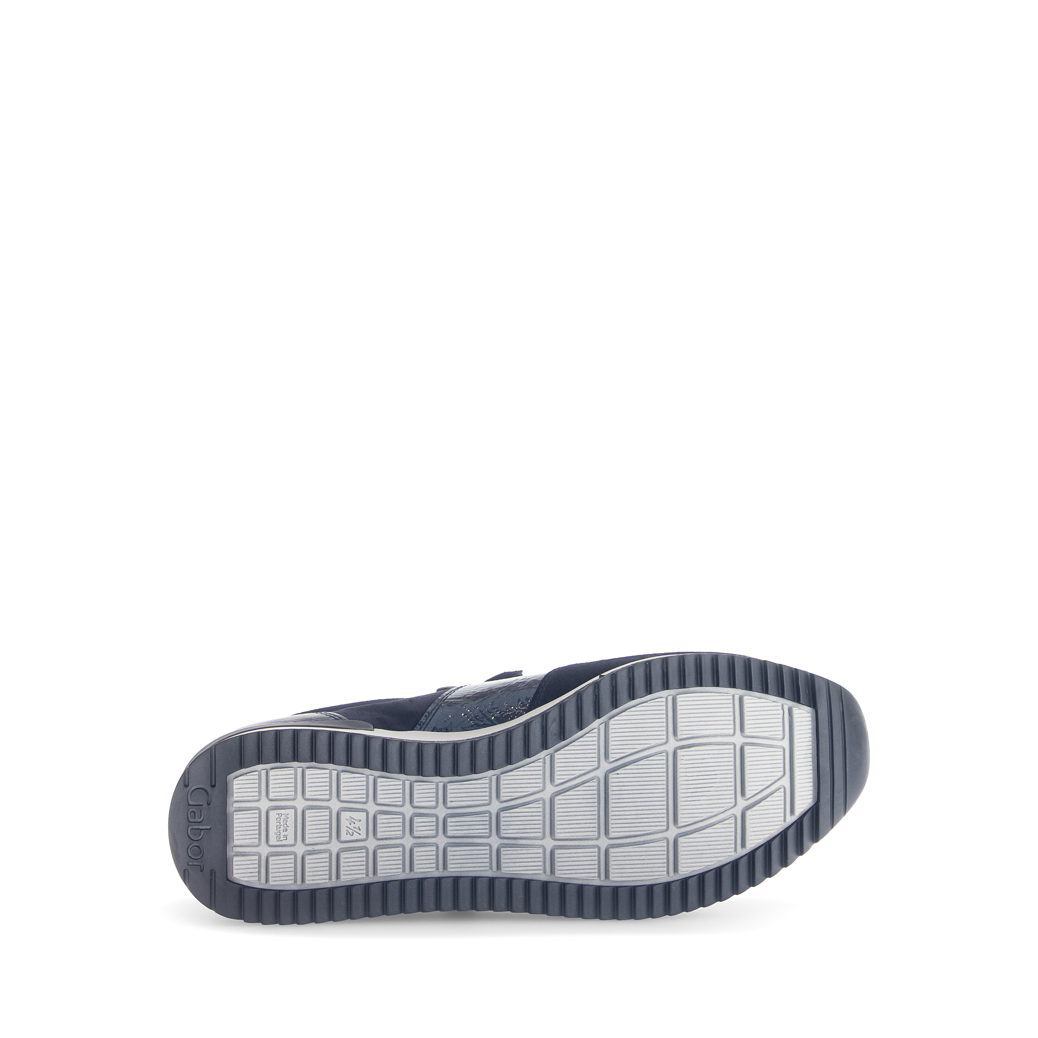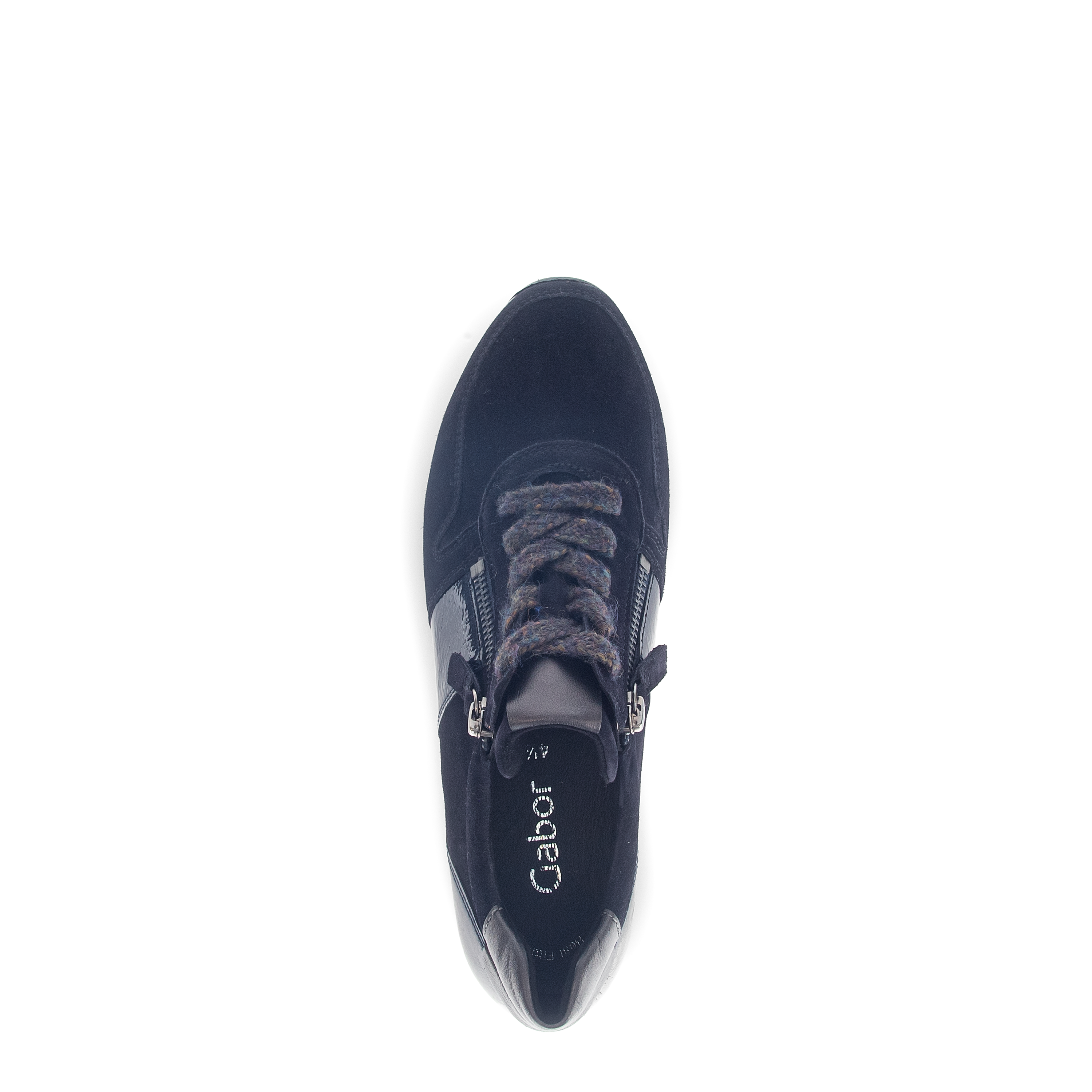 Deze slanke donkerblauwe sneaker voor dames uit de Gabor Fashion collectie is gemaakt van soepel suede met leren accenten op de zijkant en de hiel. De binnenvoering is gemaakt van zachte stof en leer en het leren voetbed is uitneembaar zodat ook een eigen voetbed gebruikt kan worden. Naast de vetersluiting heeft deze elegante sneaker ook een gemakkelijk ritsje. De grijze rubberzool is soepel en geeft grip.