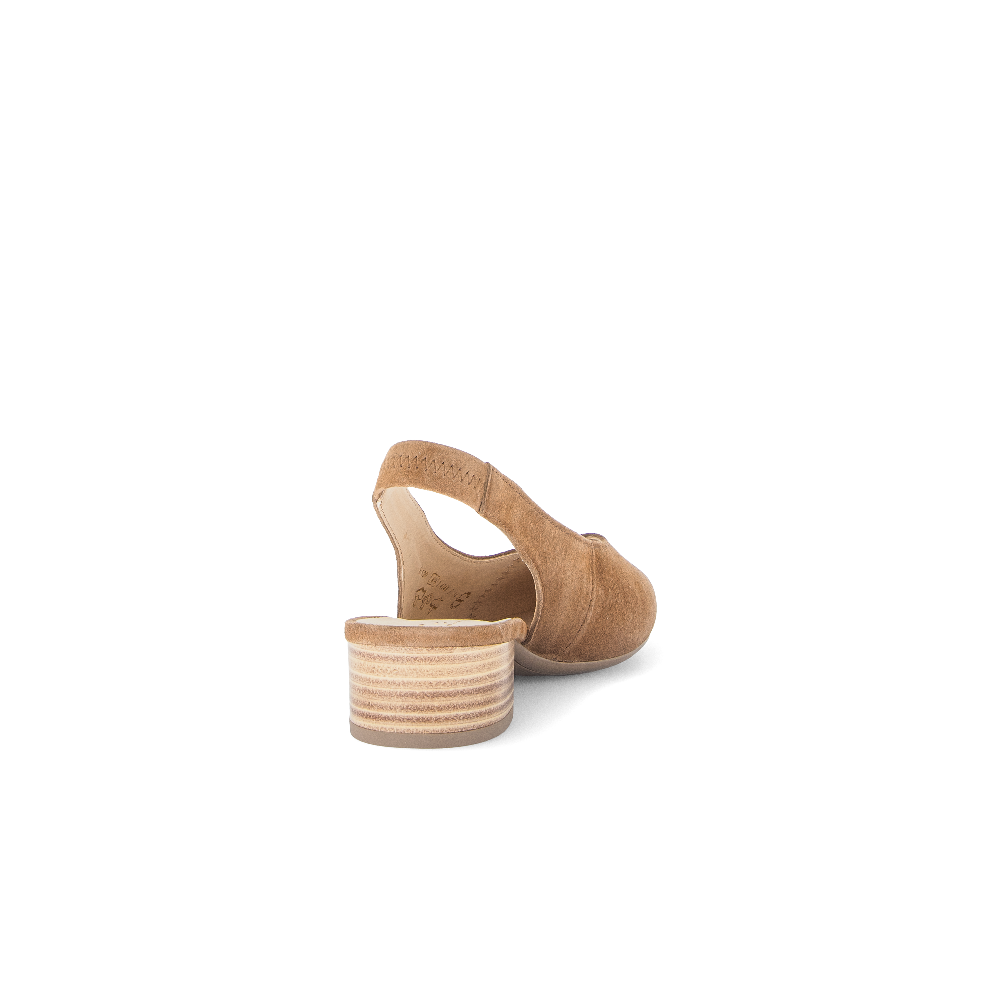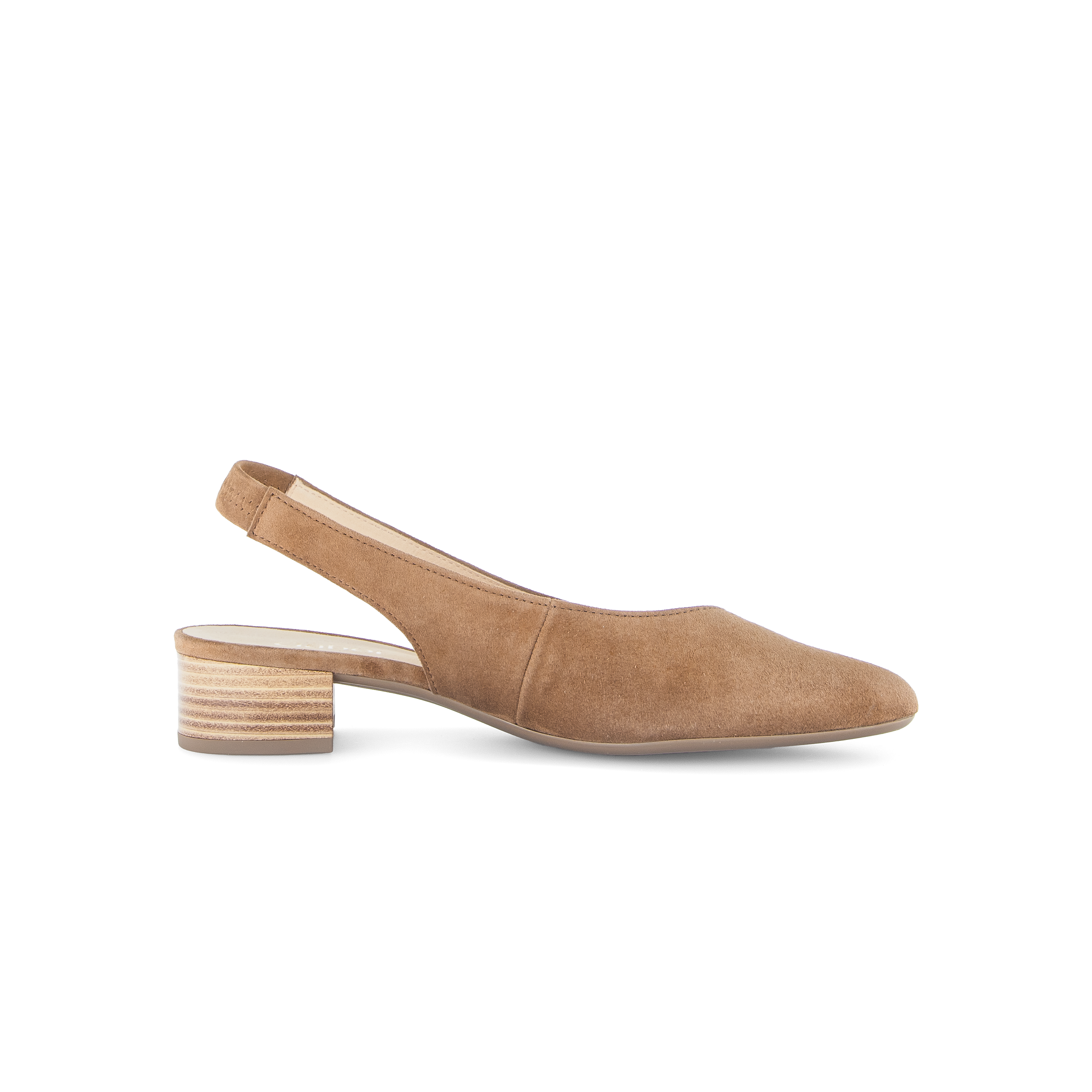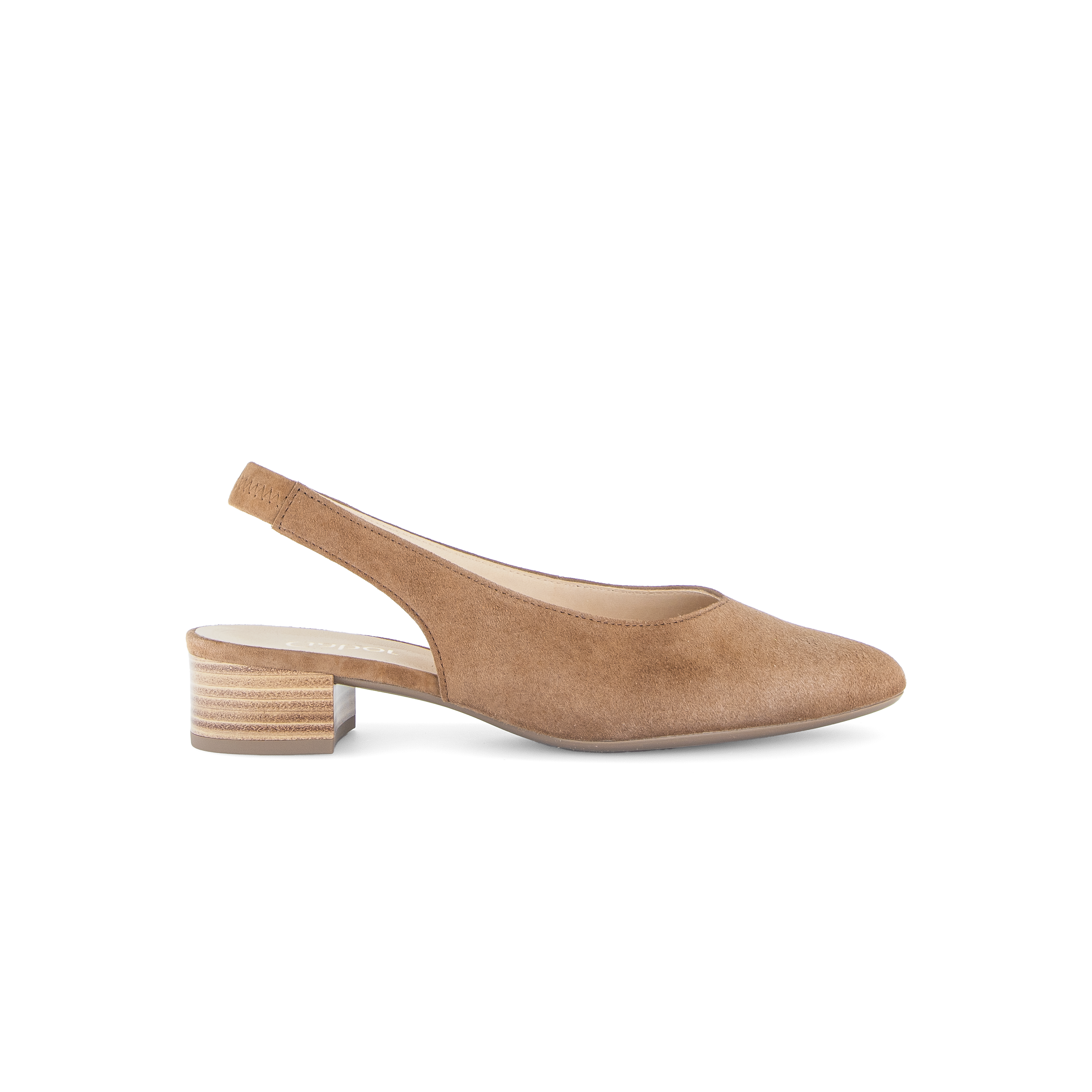 Deze beige slingback van Gabor is gemaakt van zacht suede in de kleur peanut. Met de elastieke band in de hiel is de schoen makkelijk aan te trekken en blijft goed zitten tijdens het lopen. Het 30mm hakje loopt comfortabel en staat elegant in combinatie met het slanke leestje.