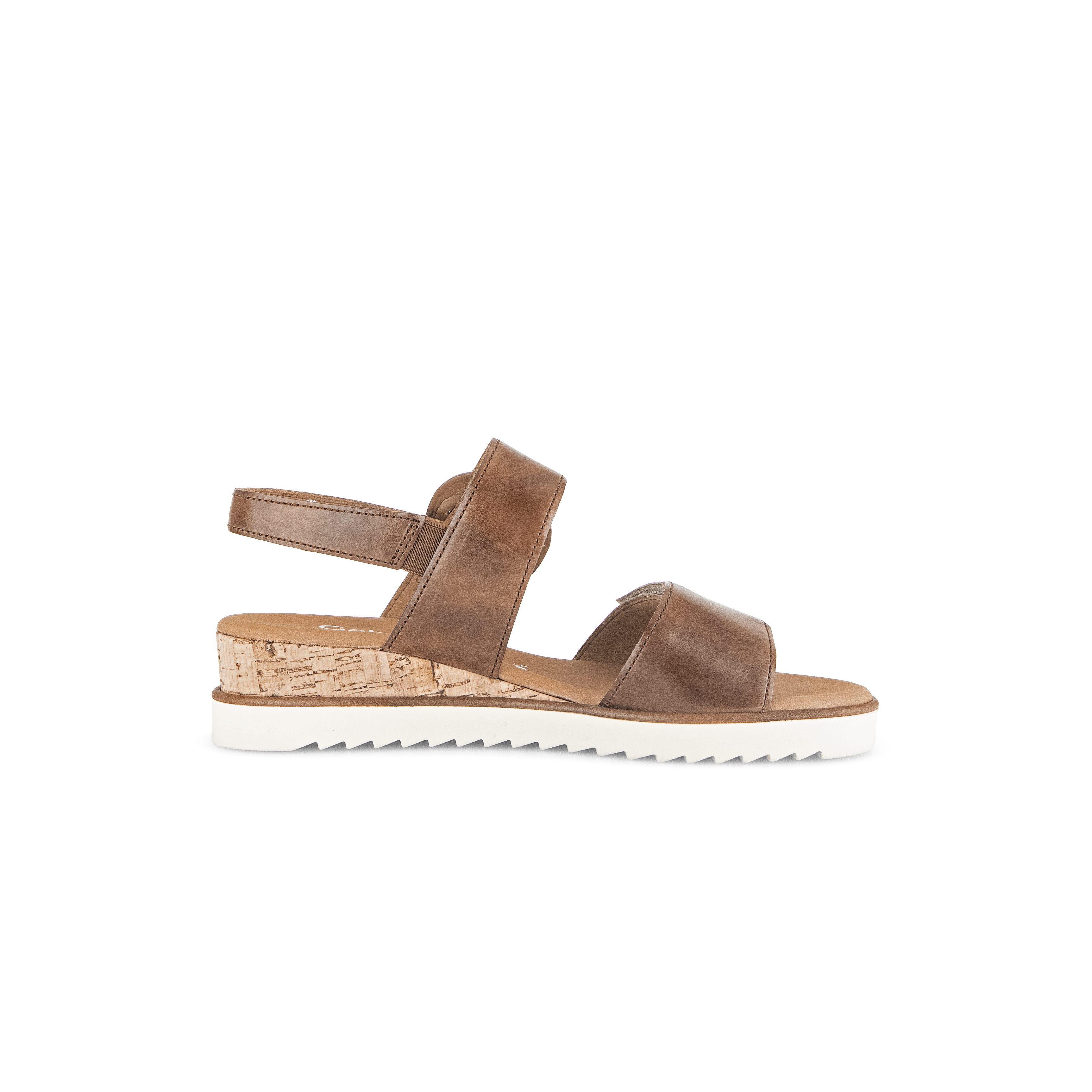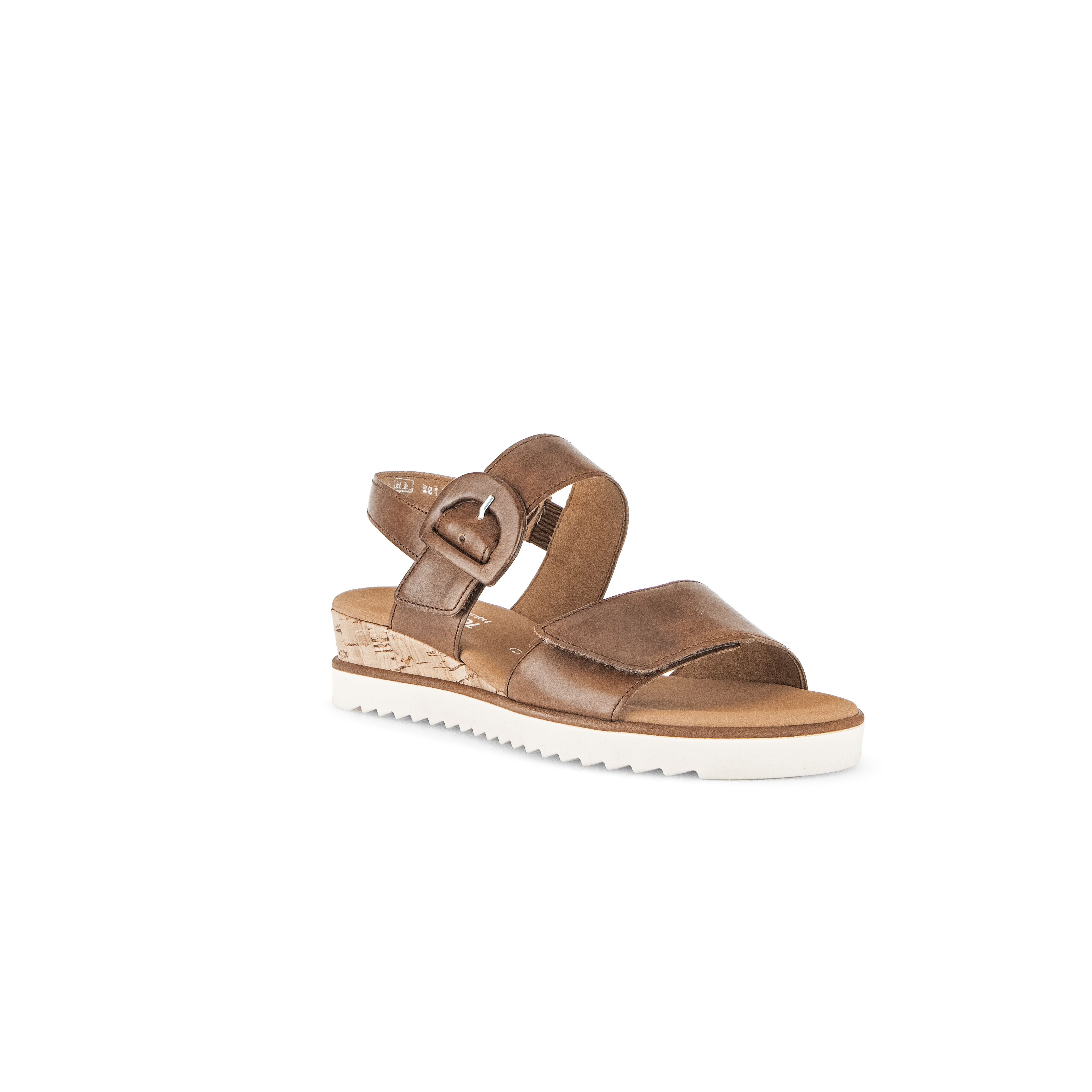 Deze comfortabele leren sandaal voor dames is gemaakt van mooie kwaliteit leer in de kleur camel. De sandaal heeft een zacht leren band over de voorvoet en een subtiele klitteband sluitingen met siergesp over de wreef. Dankzij het zachte voetbed en de soepele rubberzool loopt deze sandaal super comfortabel. De lichte sleehak van kurk geeft de sandaal net wat meer elegantie en een casual look.