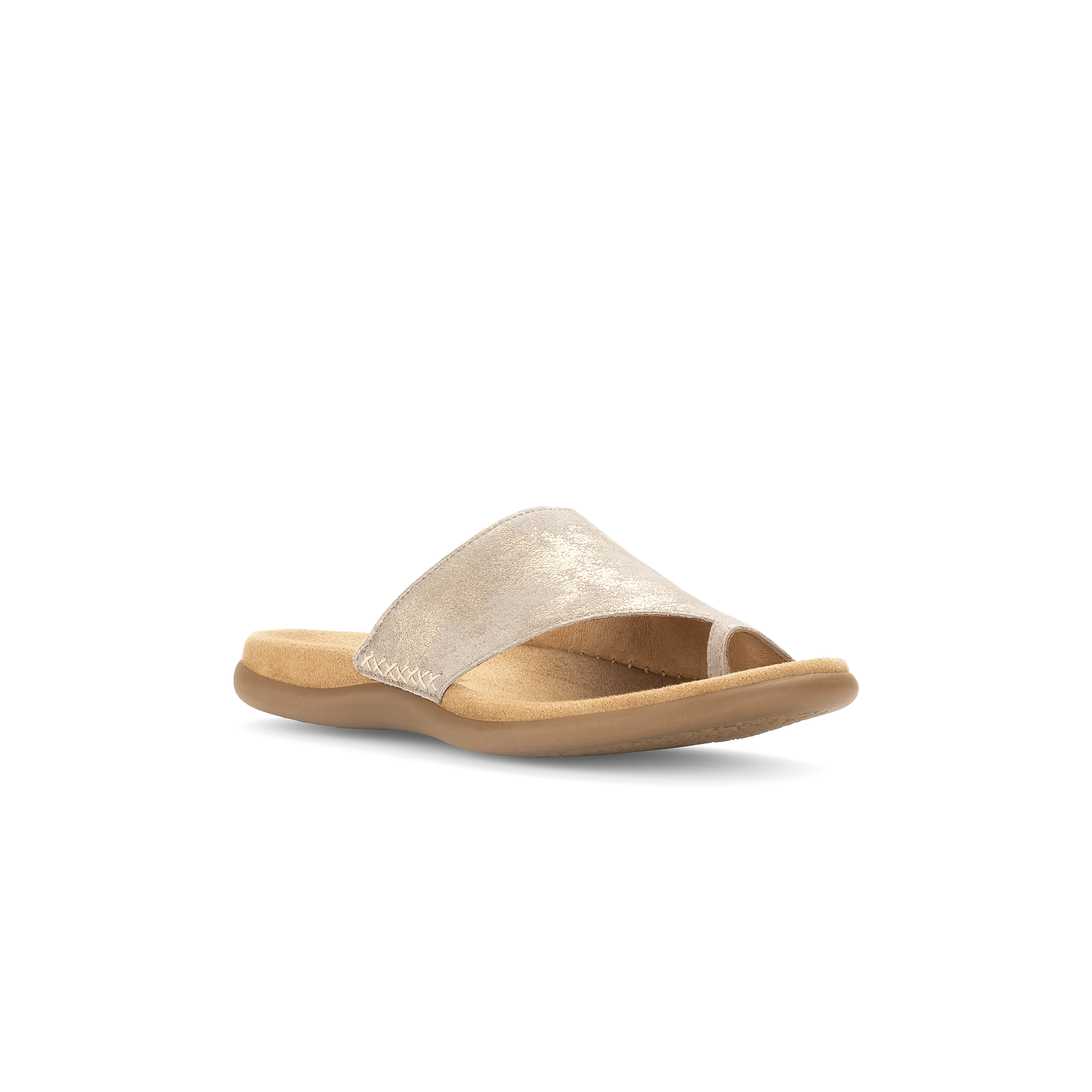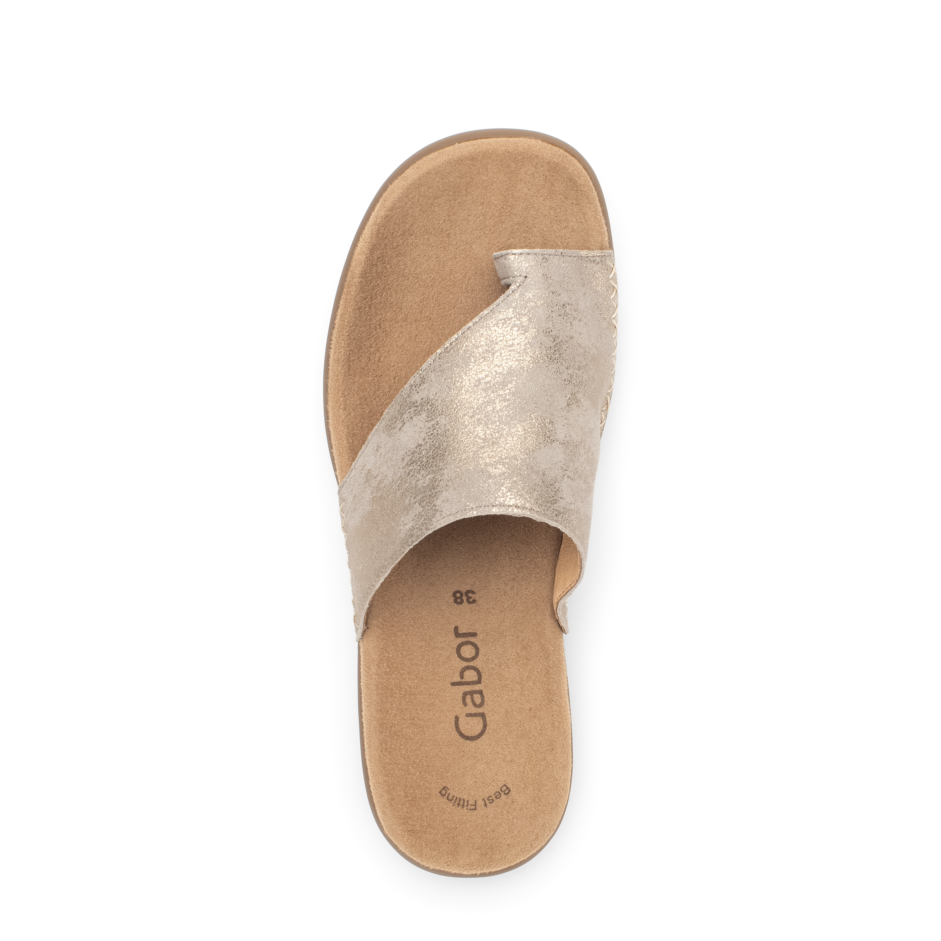 Deze Gabor teenslipper voor dames heeft een brede beige metallic band over de wreef met een uitsparing bij de grote teen. Doordat de band hoog sluit, zit de voet stevig in de slipper. Het voorgevormde voetbed en de soepele rubberzool geeft grip en steun voor een hoog loopcomfort.