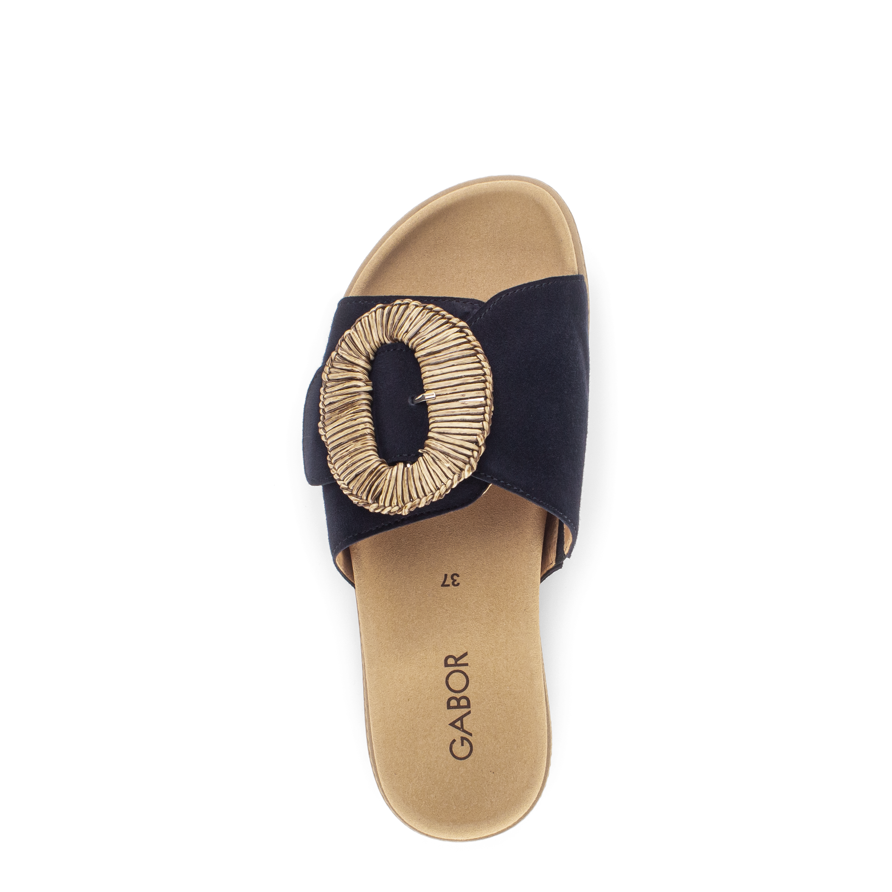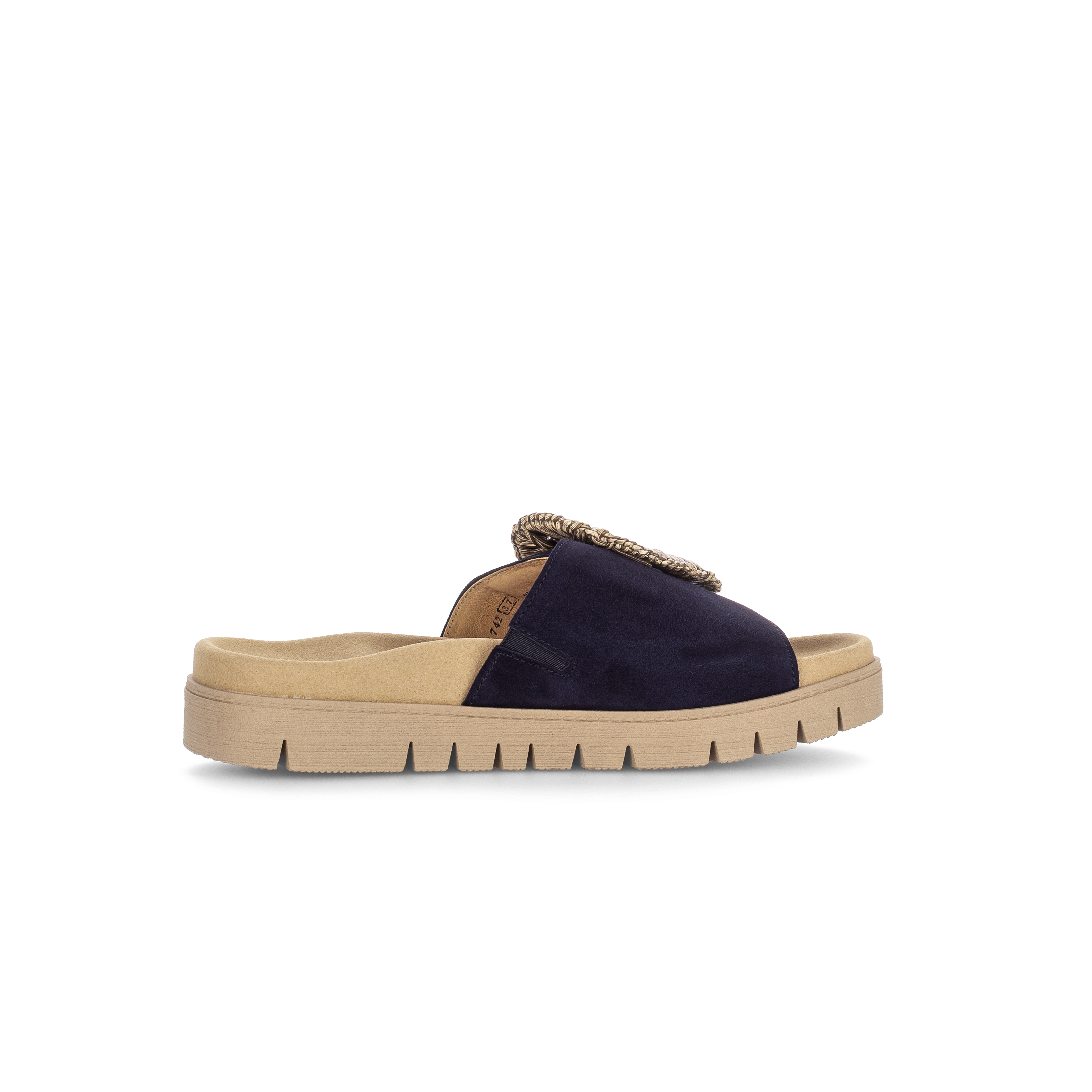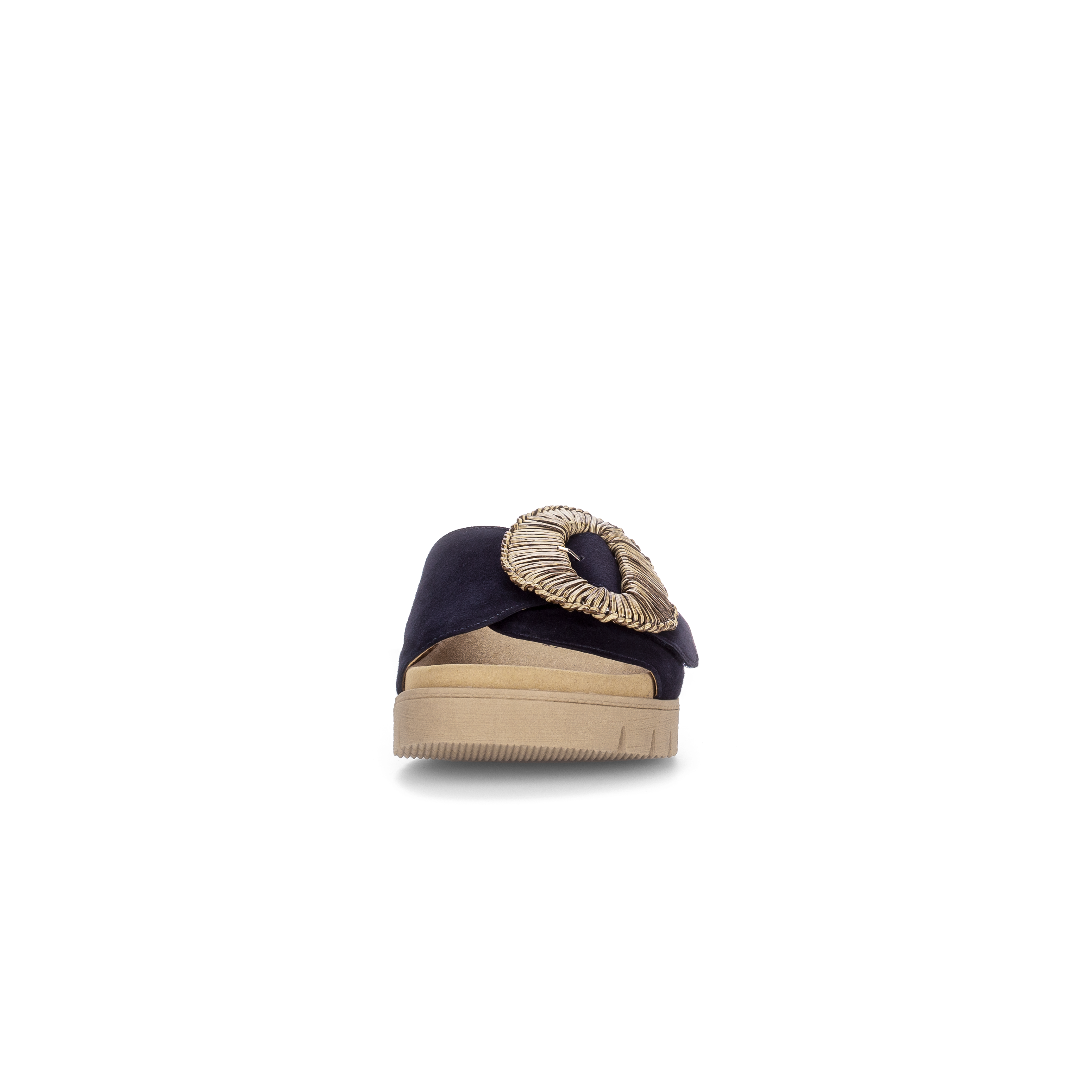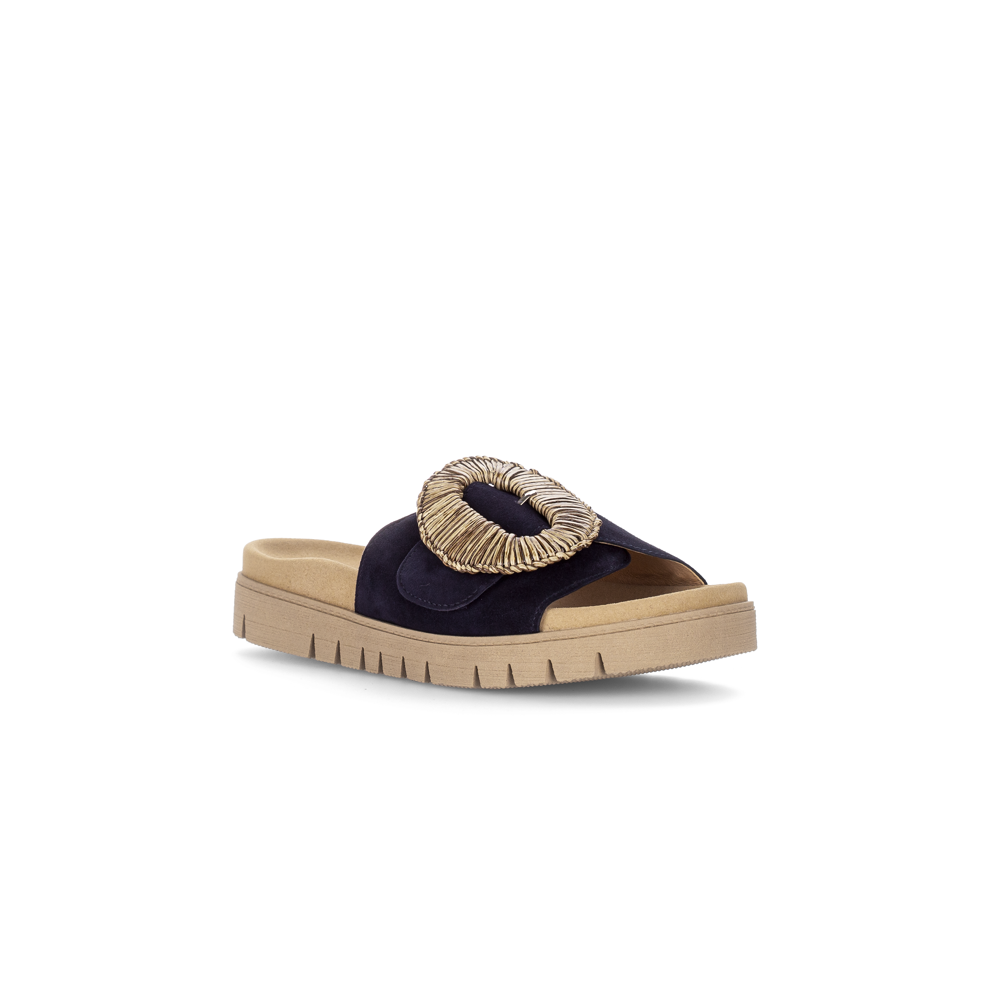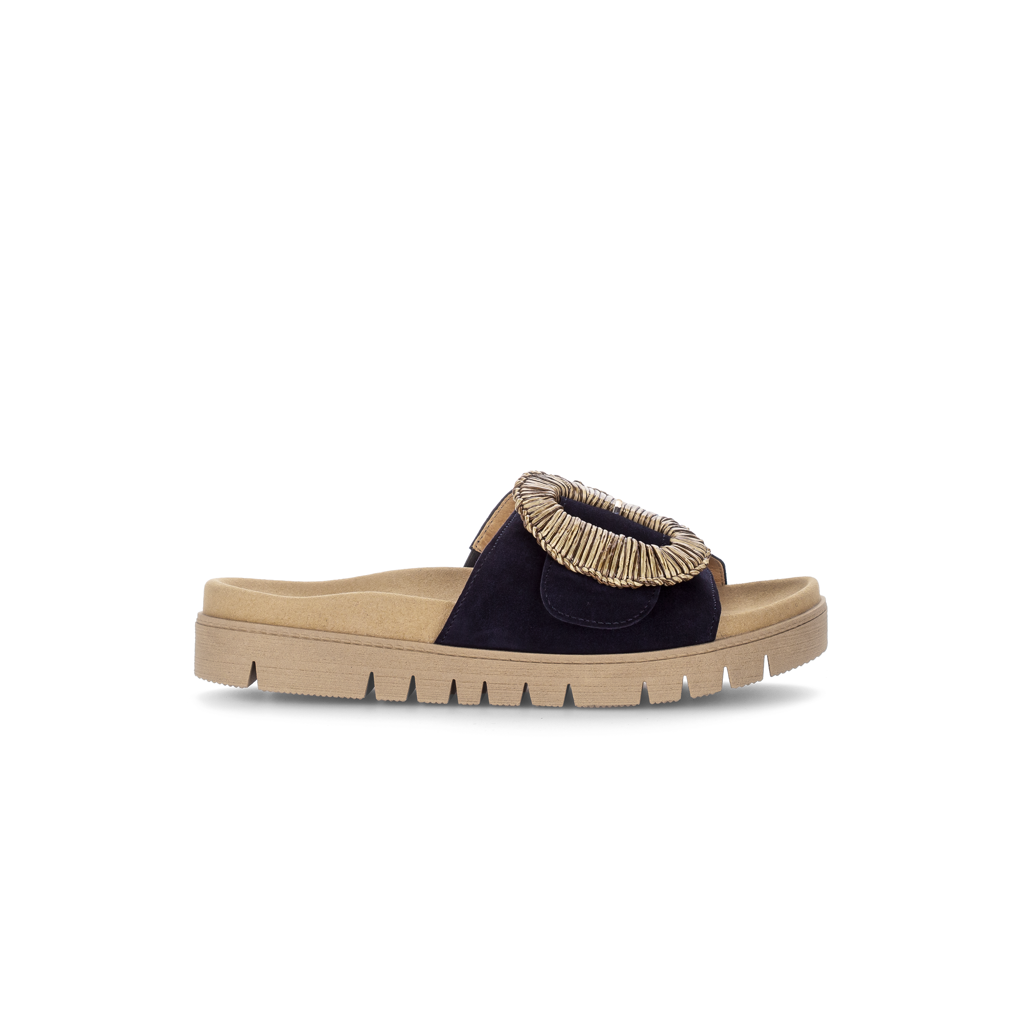Luxe wreefband slipper 83.742 voor dames van Gabor. De slipper is gemaakt van soepel donkerblauw suede met een grote ronde siergesp op een klittebandsluiting die perfekt rond de voet sluit. Het voorgevormde voetbed en de soepele rubber plateauzool zorgen voor een geweldig loopcomfort de hele dag. Match deze fashion slipper bij je casual of zelfs geklede outfit en je look is compleet.