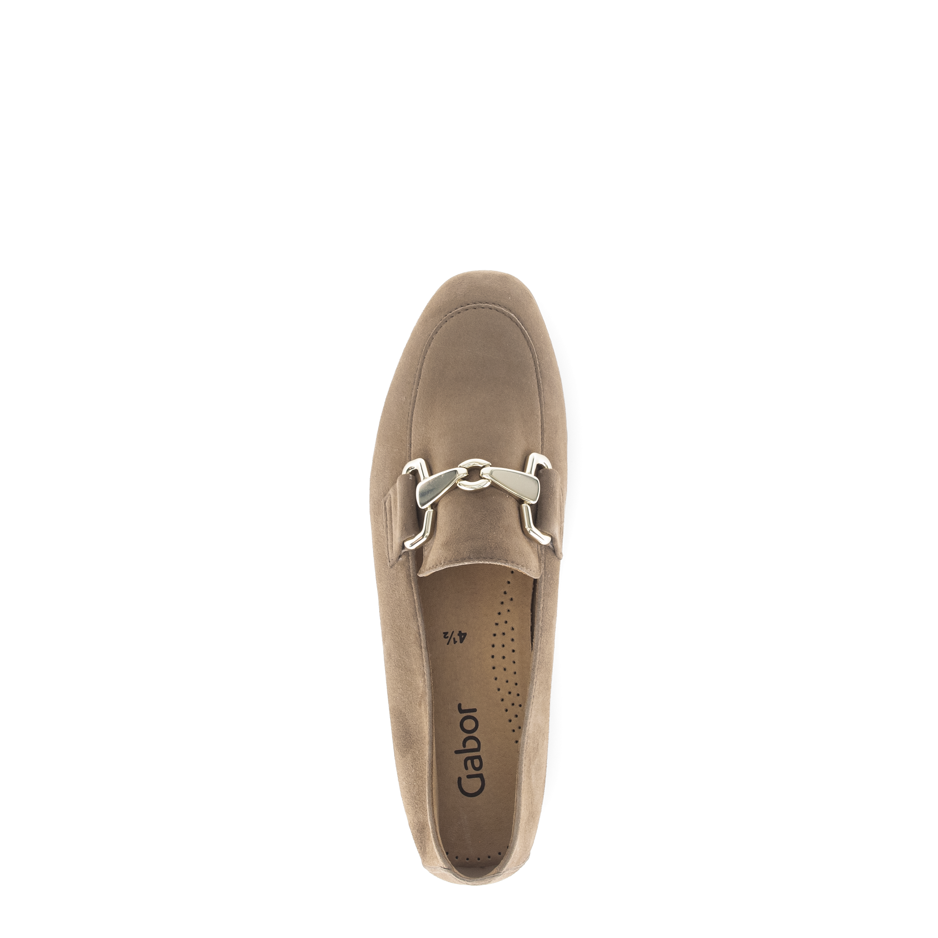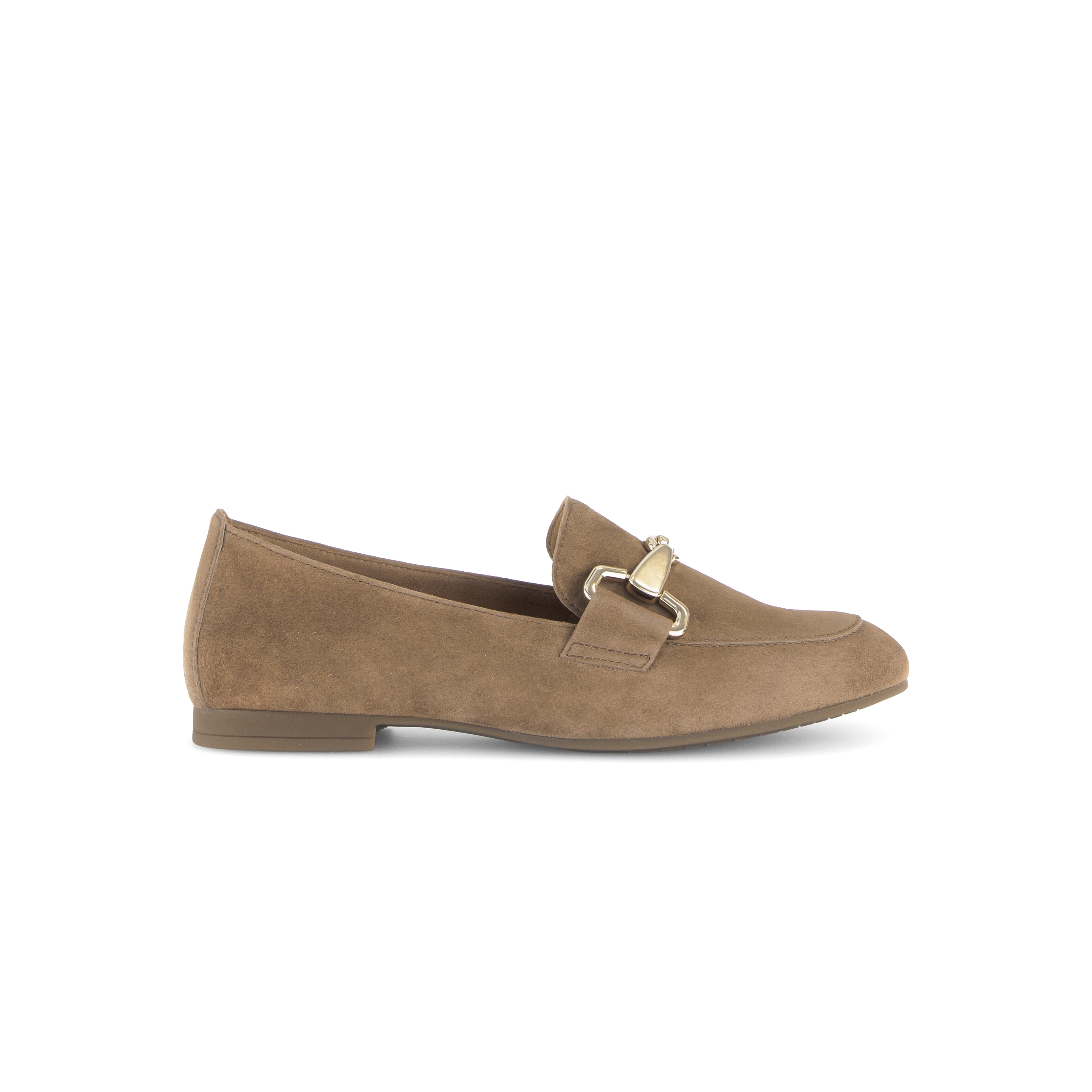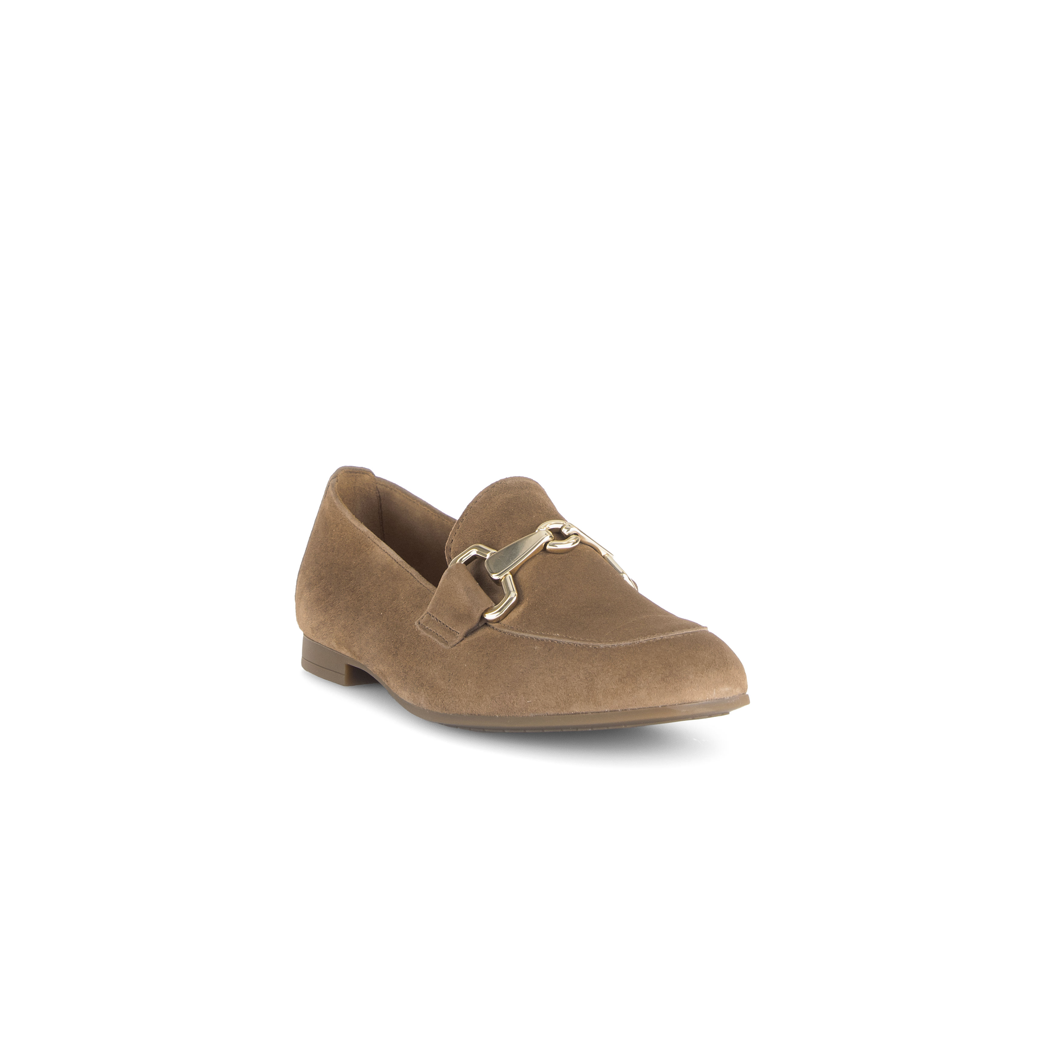 De 85.211.18 is een elegante lichtbruine loafer voor dames en heeft een goudkleurig bitje op de wreef. De loafer is gemaakt van comfortabel soepel suede in de kleur peanut, heeft een zachte binnenvoering en leren voetbed met een verende foamlaag. Het rubberen zooltje is soepel en geeft grip.