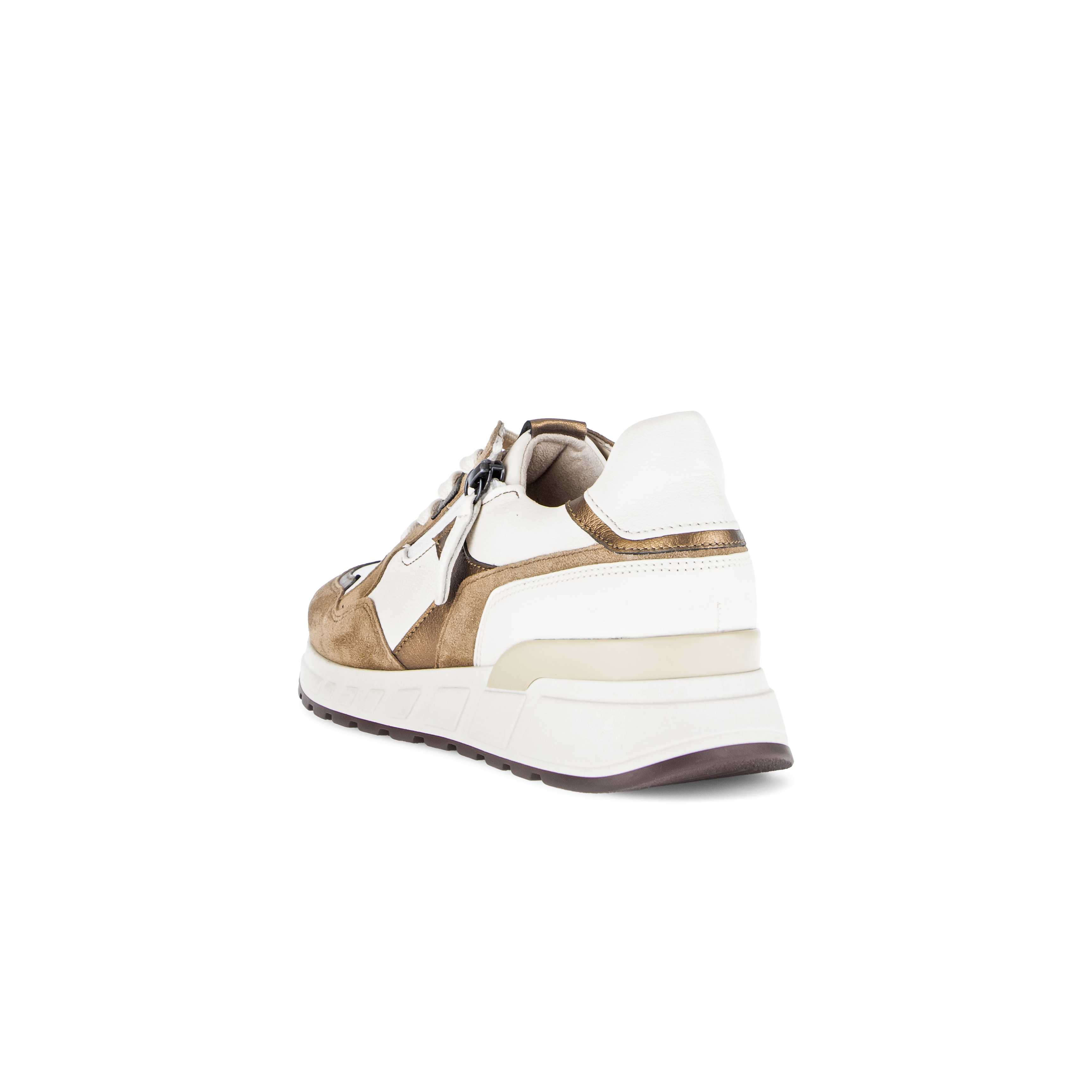 Beige sneaker voor dames uit de Gabor Comfort collectie. De sneaker is gemaakt van een mix van materialen zoals beige suede, creme leer en bronze accenten. De binnenvoering is van comfortabel zachte stof en een suede hiel voor optimaal comfort. Het leren voetbed is uitneembaar zodat het gebruik van een eigen zooltje ook mogelijk is. De wijdte H is geschikt voor een brede voet. De witte rubberzool is stevig, geeft goede grip en benadrukt het sportieve karakter van deze luxe veterschoen voor dames. Voor het gemak heeft deze sneaker een handige rits naast de vetersluiting.