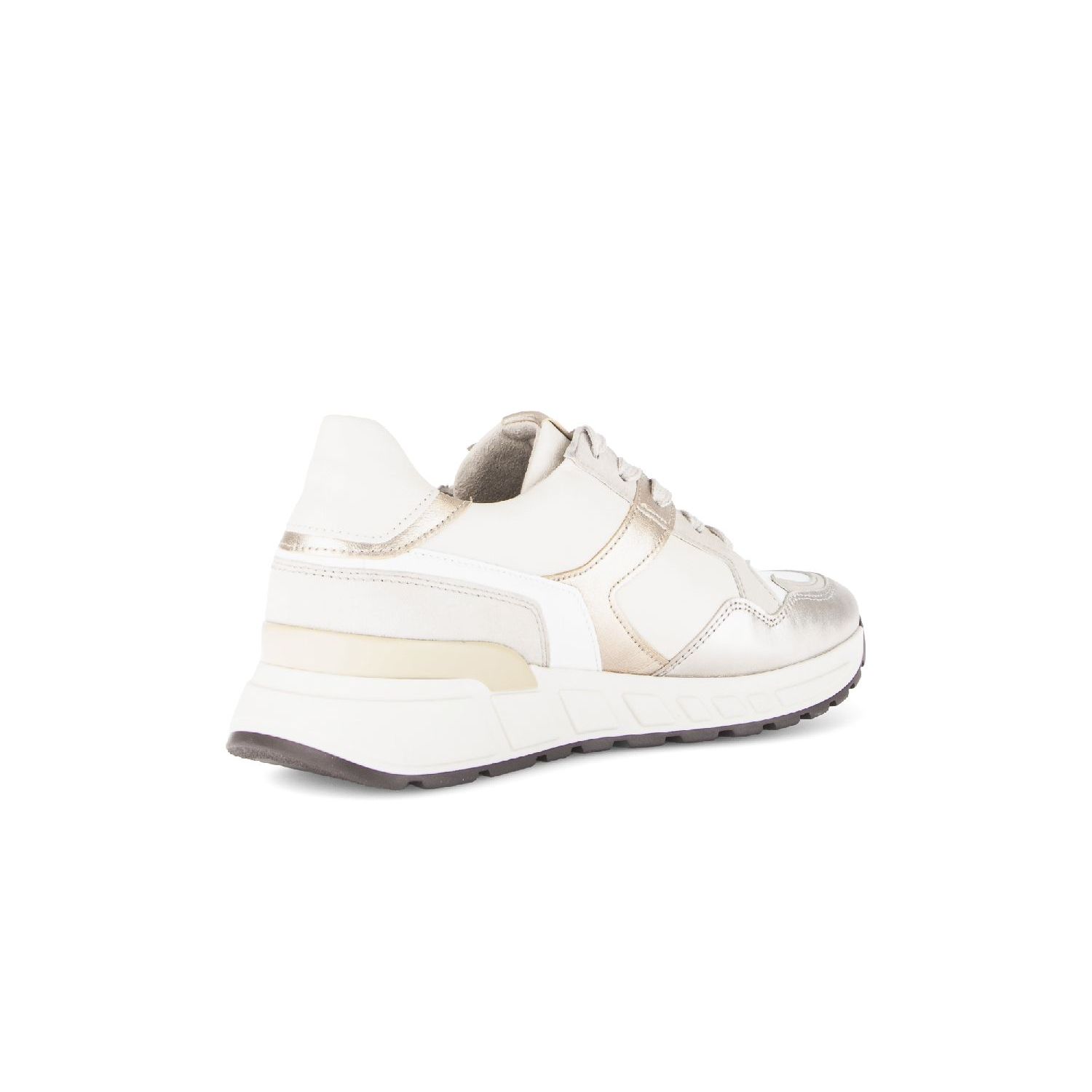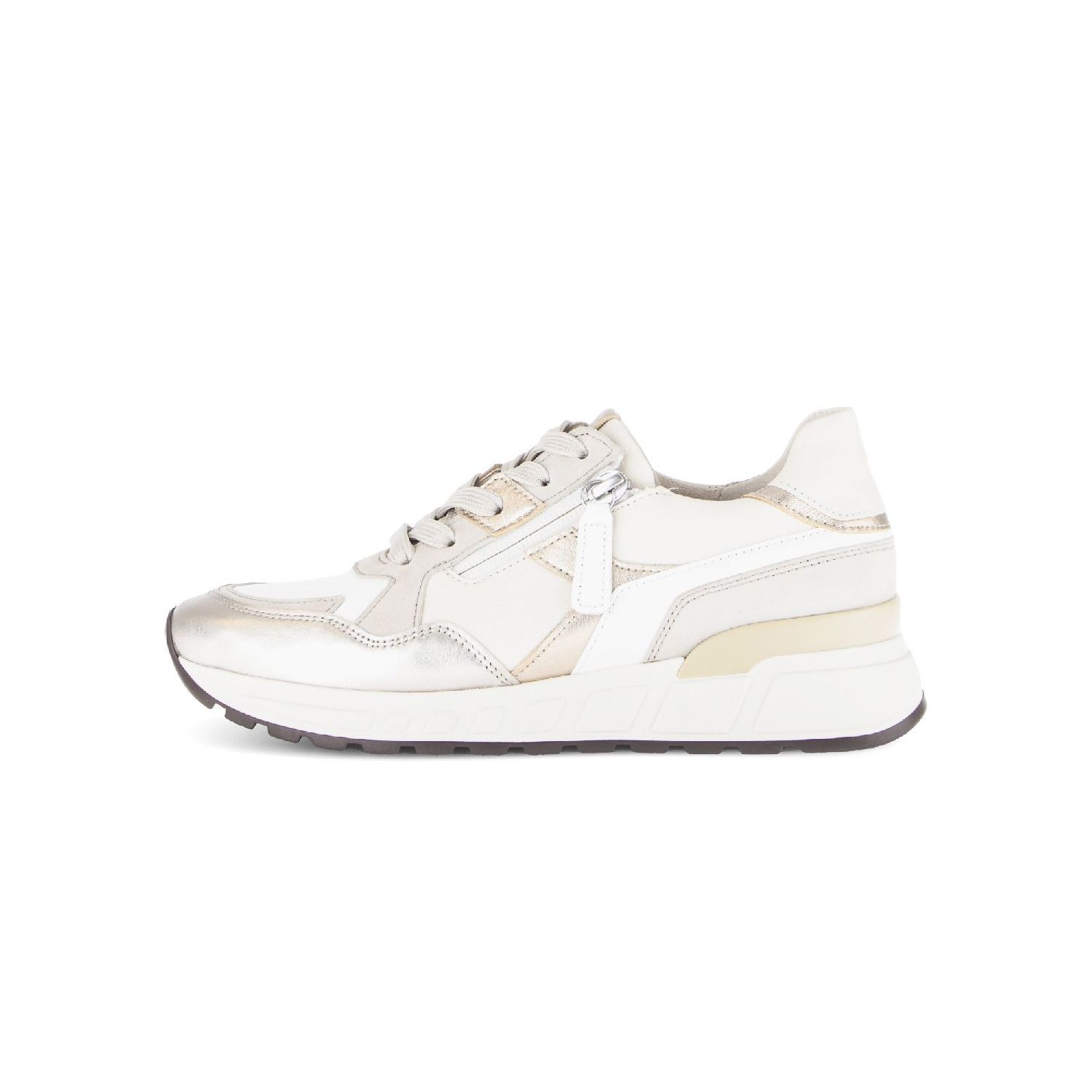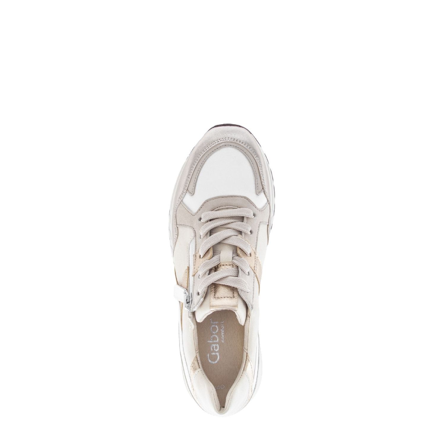 Latte Puder sneaker voor dames uit de Gabor Comfort collectie. De sneaker is gemaakt van een mix van materialen in verschillende kleuren offwhite en creme leer, beige suede en oak metallic accenten. De binnenvoering is van comfortabel zachte stof en een suede hiel voor optimaal comfort. Het leren voetbed is uitneembaar zodat het gebruik van een eigen zooltje ook mogelijk is. De wijdte H is geschikt voor een brede voet. De witte rubberzool is stevig, geeft goede grip en benadrukt het sportieve karakter van deze luxe veterschoen voor dames. Voor het gemak heeft deze sneaker een handige rits naast de vetersluiting.