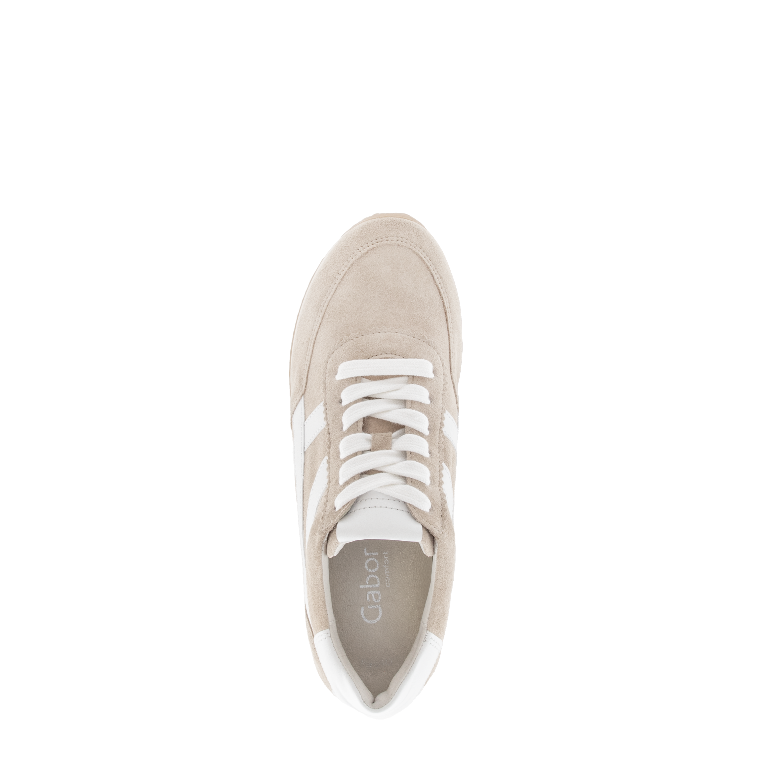 Deze beige suede sneakers voor dames uit de Gabor Comfort collectie zijn gemaakt van soepel en zacht suede met sportieve witte accenten. De vintage sneaker heeft een comfortabele leren binnenvoering en een verende binnenzool die ook uitneembaar is zodat ook een eigen voetbed gebruikt kan worden. De wijdte H past prima bij de bredere voet. De soepele rubberzool geeft goede grip en comfort bij elke stap. Match deze chique suede sneaker bij je casual outfit en je look is compleet.