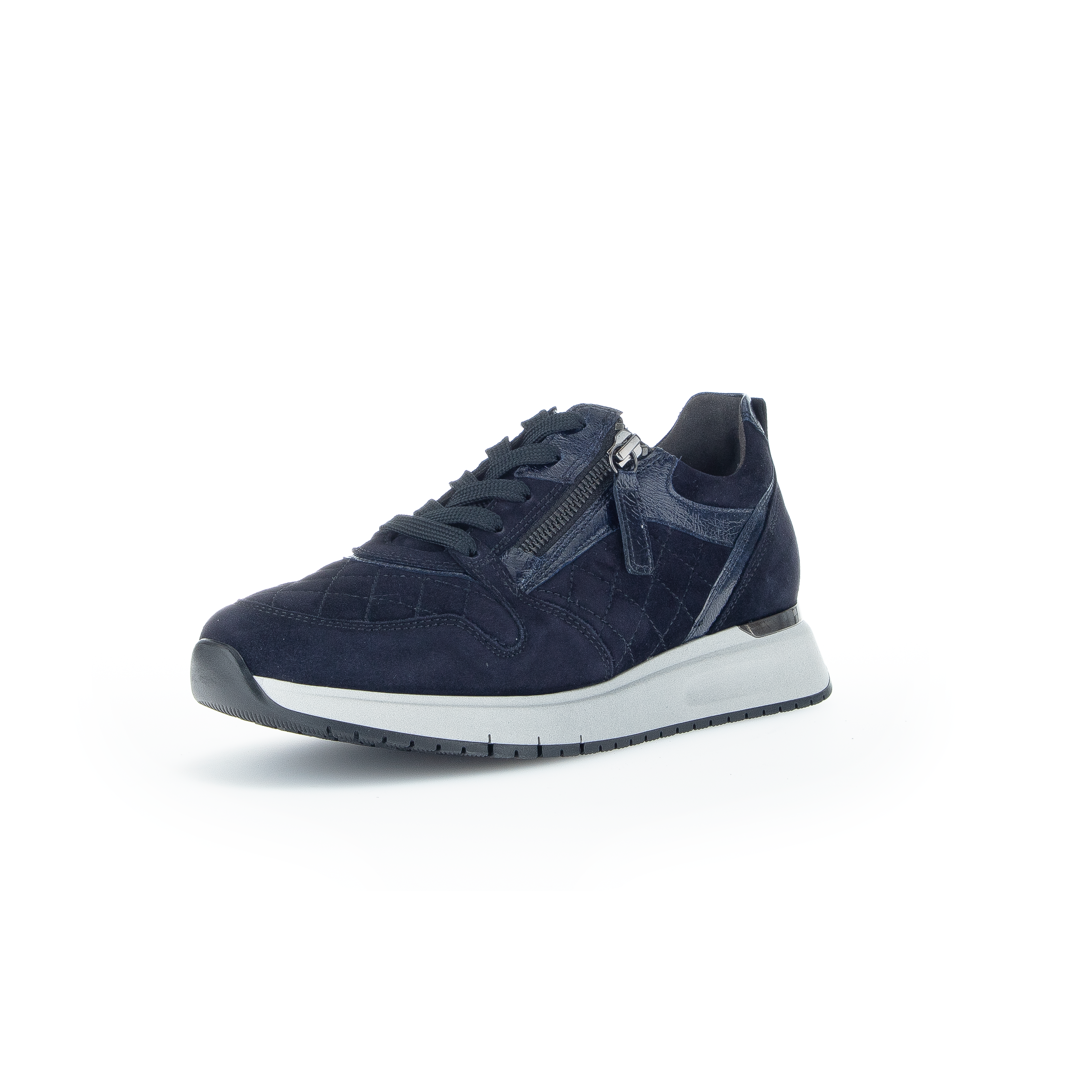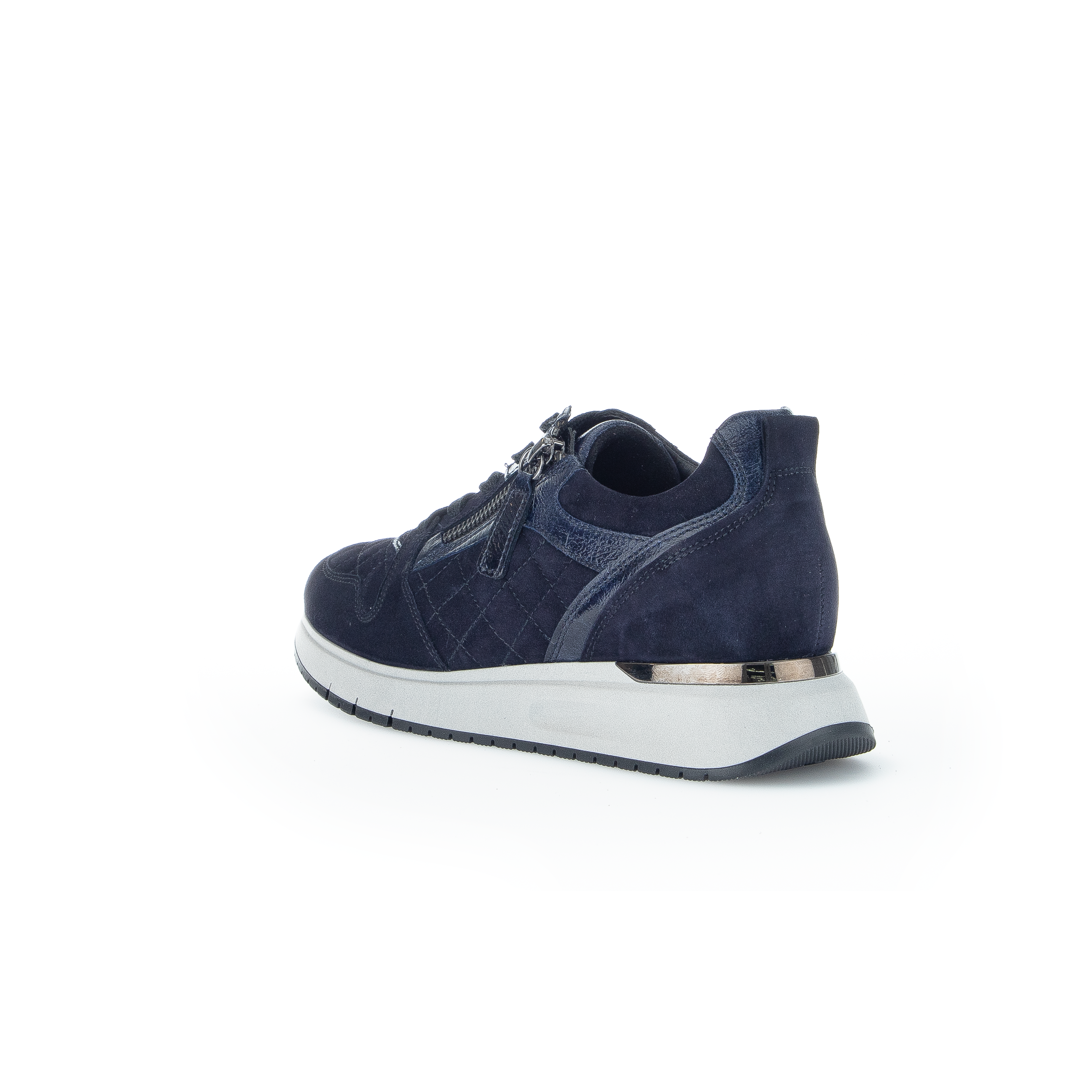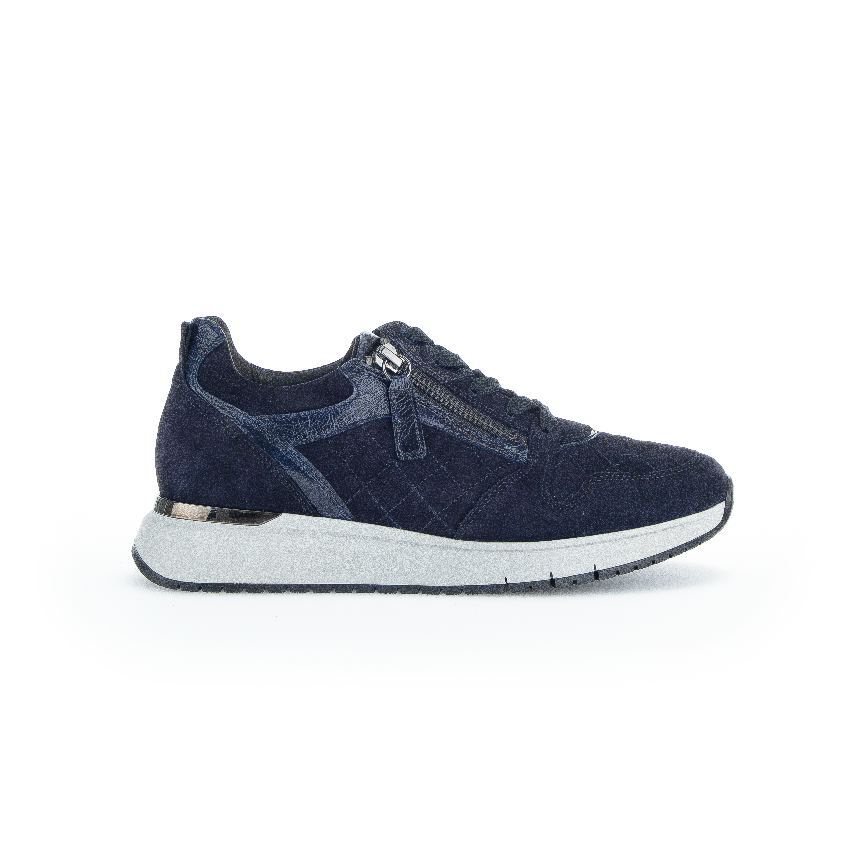 Deze luxe sneaker voor dames is gemaakt van donkerblauw suede met een ruitmotief. Naast de vetersluiting heeft deze Gabor ook een ritssluiting. De leren binnenvoering en het uitneembaar voetbed gecombineerd met de wijdte H maken deze sneaker geschikt voor een bredere voet en/of een eigen zooltje. De grijze tussenzool past goed bij het blauw van de schoen.