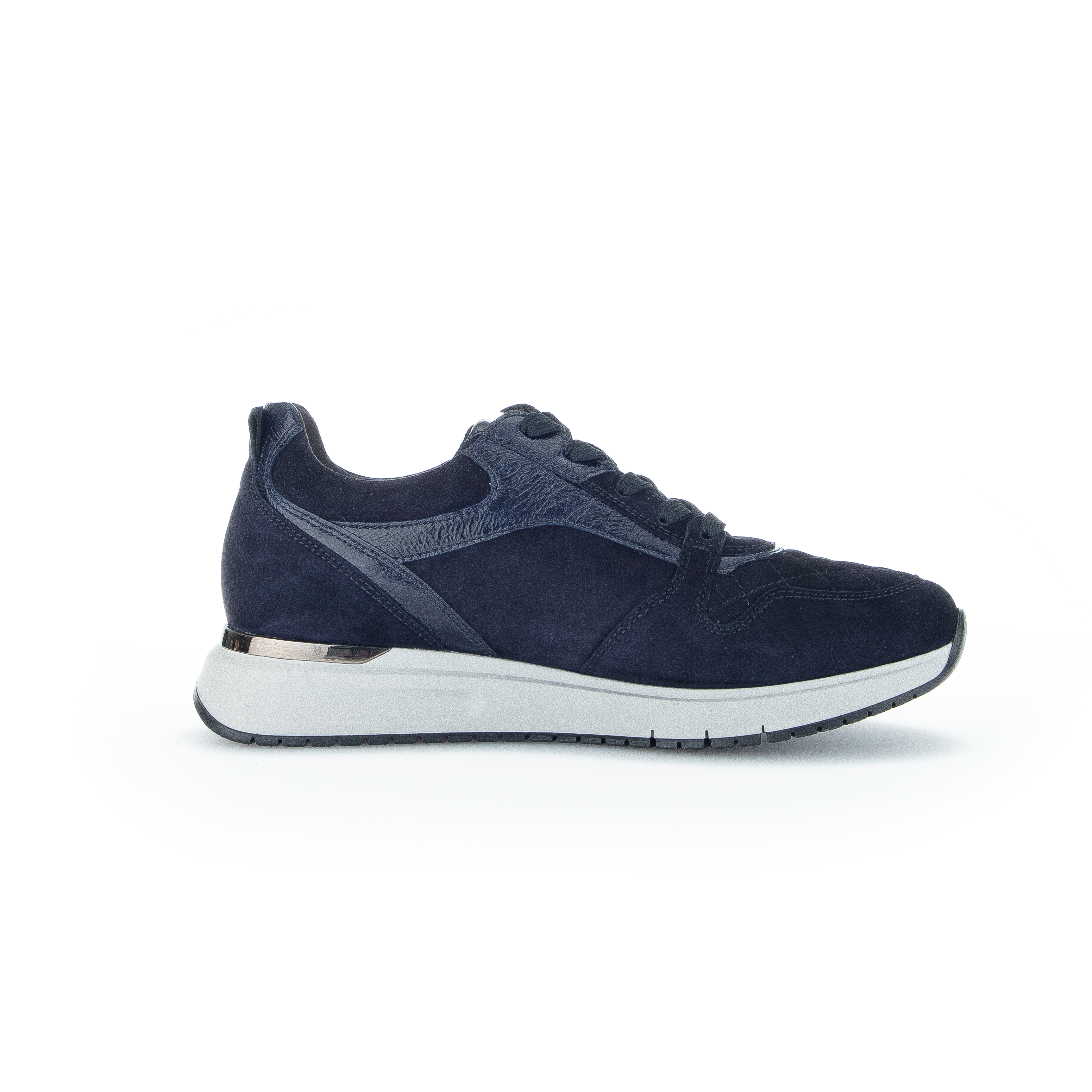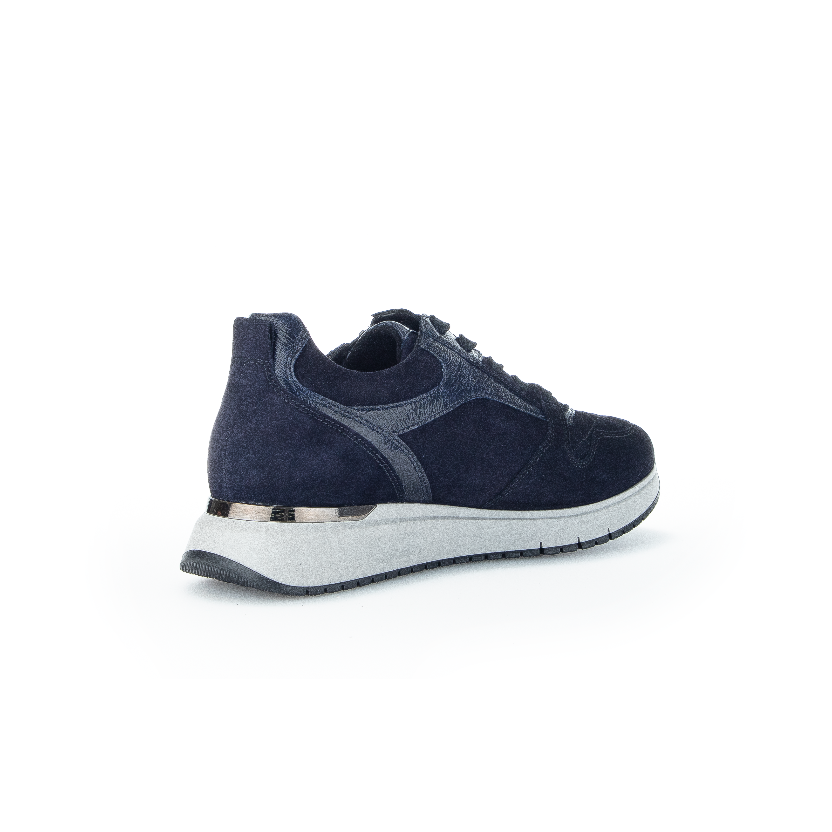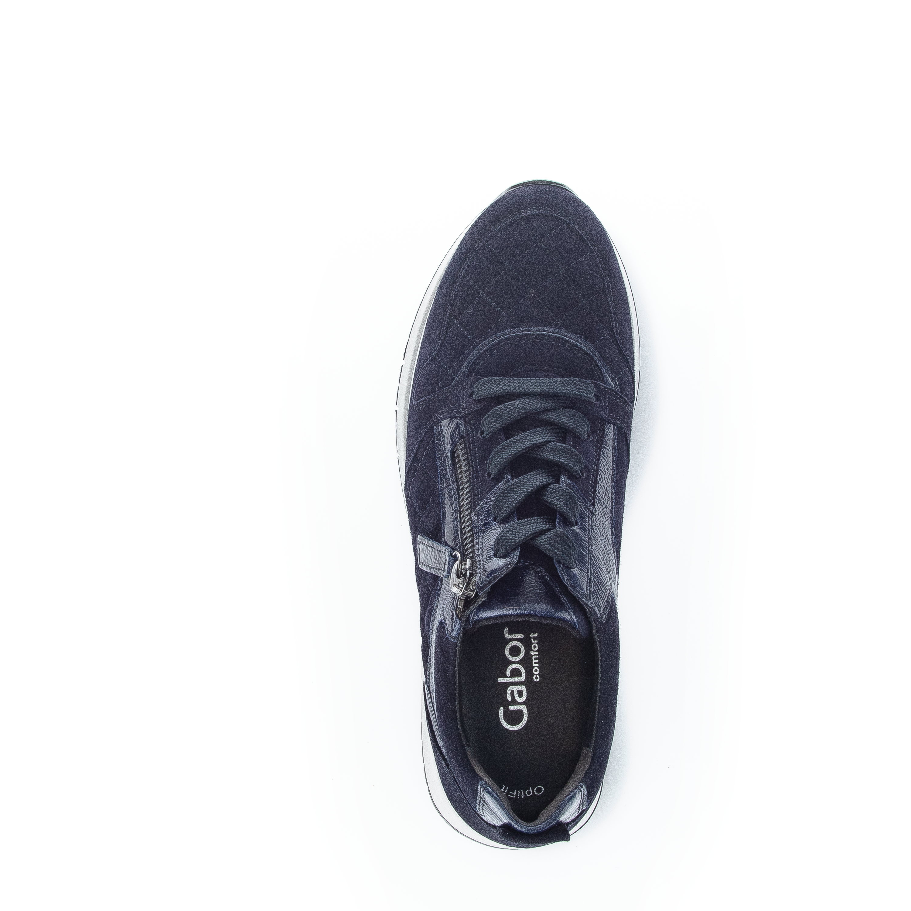 Deze luxe sneaker voor dames is gemaakt van donkerblauw suede met een ruitmotief. Naast de vetersluiting heeft deze Gabor ook een ritssluiting. De leren binnenvoering en het uitneembaar voetbed gecombineerd met de wijdte H maken deze sneaker geschikt voor een bredere voet en/of een eigen zooltje. De grijze tussenzool past goed bij het blauw van de schoen.