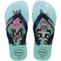 De Minecraft slipper voor jongens heeft een licht blauwe zool met Minecraft afbeelding en donkerblauwe bandjes met witte Havaianas logo.