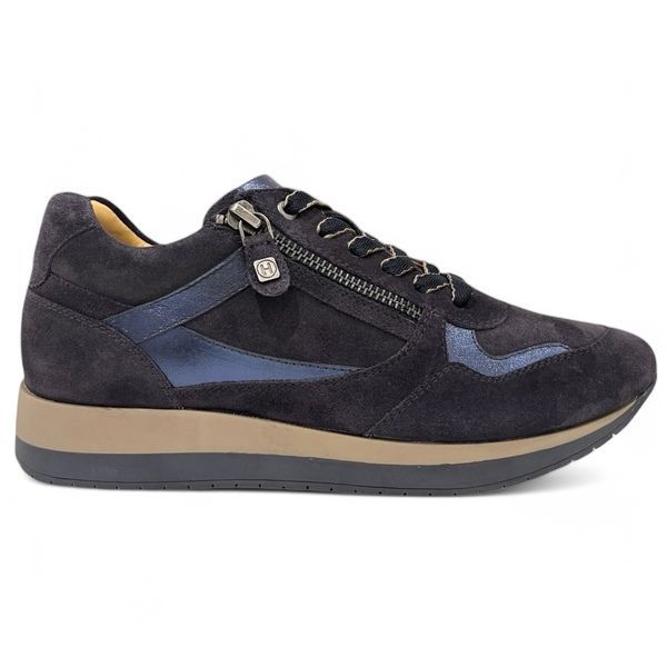Donkerblauw suede sneaker voor dames met blauw metallic accenten. De binnenvoering is van comfortabel zachte textiel en een uitneembaar voetbed van leer zodat deze sneaker ook met een eigen voetbed gedragen kan worden. Naast de sportieve vetersluiting heeft deze blauwe sneaker ook een gemakkelijk ritsje. De stevige rubberzool heeft een lichtgewicht beige tussenzool en een slijtvaste blauwe loopzool met een goede afwikkeling en grip. Dankzij de wijdte H is deze rustige sneaker prima geschikt voor de brede voet.