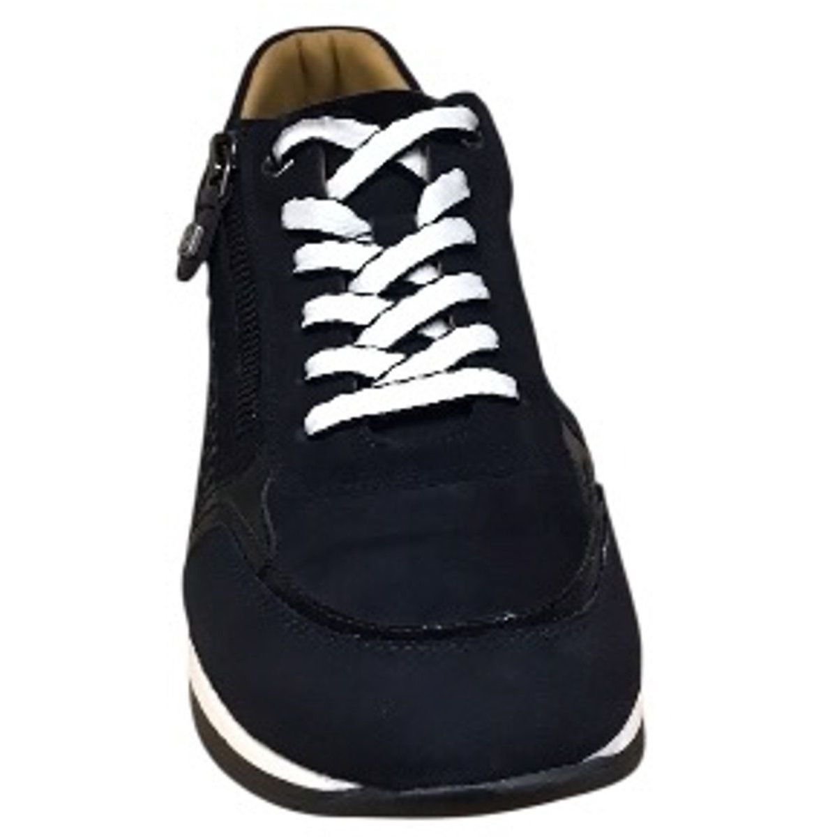 Donkerblauwe Helioform sneaker voor dames gemaakt van zacht blauw(kleurnummer 00405) suede met lak hielstuk en een subtiel printje op de zijkant. De binnenvoering is van comfortabel zachte textiel en een uitneembaar voetbed van leer zodat deze sneaker ook met een eigen voetbed gedragen kan worden. Naast de sportieve vetersluiting heeft deze beige sneaker ook een gemakkelijk ritsje. De stevige rubberzool heeft een lichtgewicht witte tussenzool en een slijtvaste blauwe loopzool met een goede afwikkeling en grip. Dankzij de wijdte H is deze cleane sneaker prima geschikt voor de brede voet.