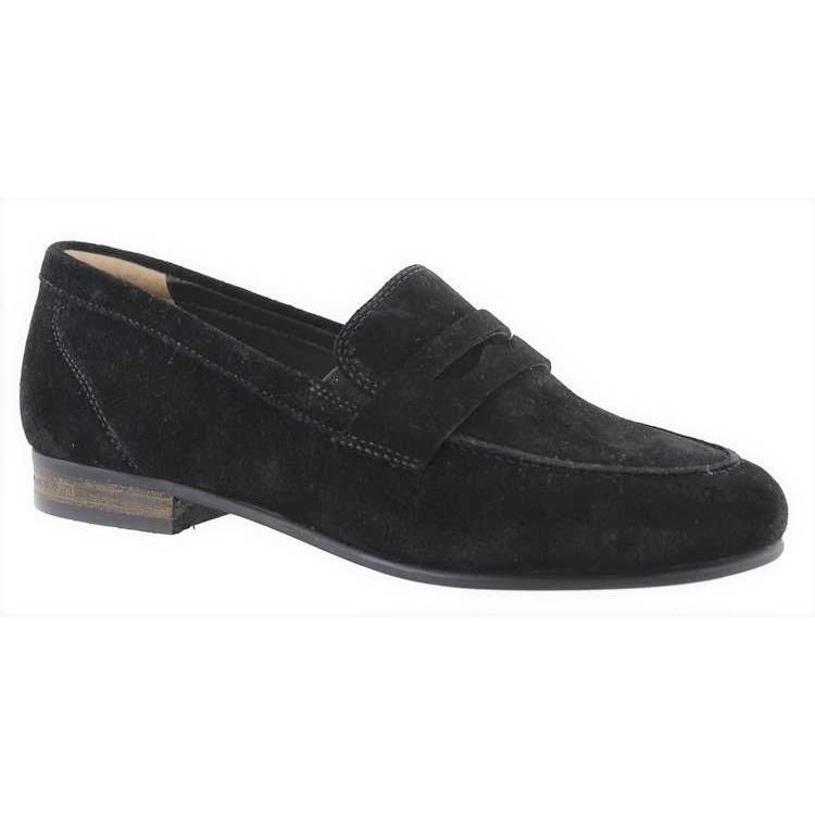 Deze zwarte suede loafer voor dames heeft een stevige rubberzool die goede grip en comfort geeft. De leren binnenvoering en het uitneembare voetbed zorgen voor een prettige pasvorm. De wijdte van deze instapper is H dus er is voldoende ruimte voor een bredere voet.