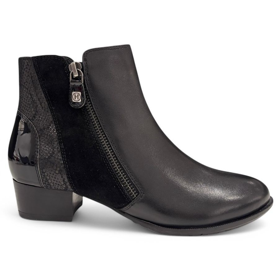 De 560.016 is een enkellaarsje voor dames gemaakt van zwart leer met accenten van zwart suede en een subtiele print. Dit suede laarsje heeft twee handige ritsjes voor een makkelijke instap. De wijdte H en het uitneembare voetbed zorgt voor voldoende ruimte voor de bredere voet. De rubberzool met licht profiel en het makkelijk loopbare hakje zorgen voor een optimaal loopcomfort.