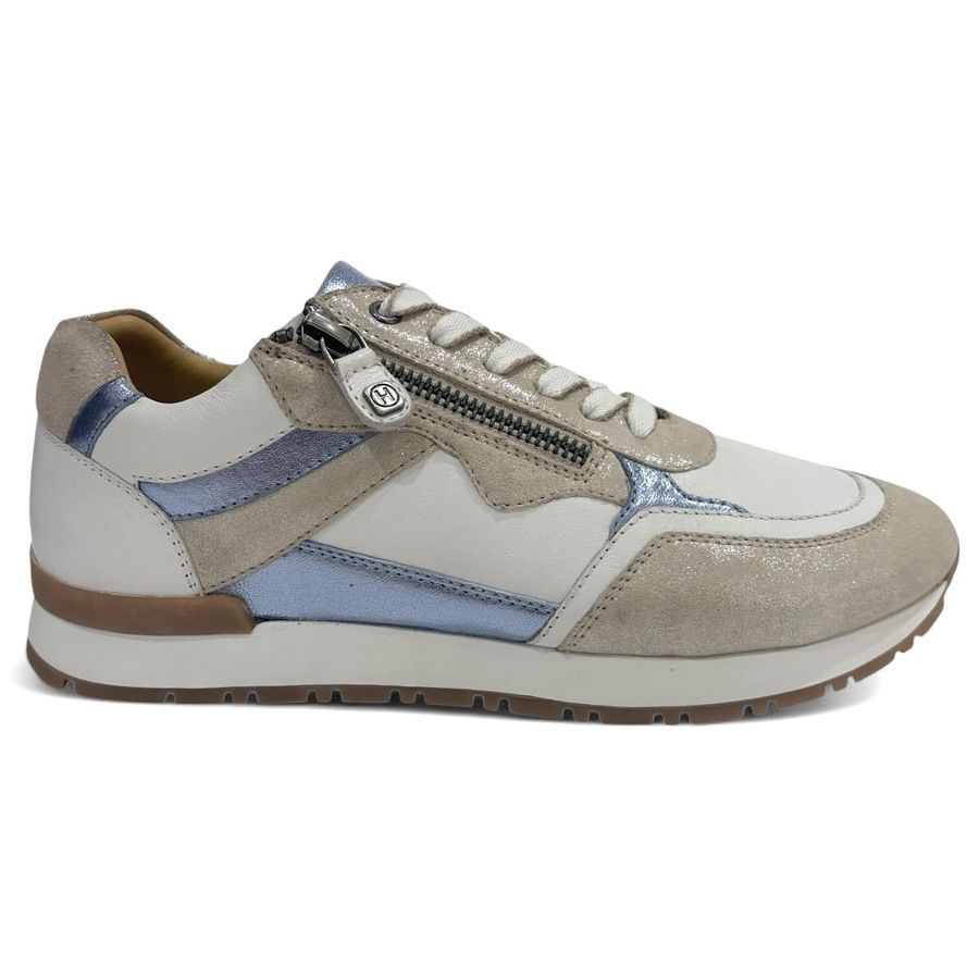 Beige sneaker voor dames gemaakt van beige suede met metallic finish en wit leer met blauw metallic accenten. De binnenvoering is van comfortabel zachte textiel en een uitneembaar voetbed van leer zodat deze sneaker ook met een eigen voetbed gedragen kan worden. Naast de vetersluiting heeft deze sneaker ook een handige ritssluting. De sportieve rubberzool heeft een lichtgewicht witte tussenzool en een slijtvaste beige loopzool met een goede afwikkeling en grip. Dankzij de wijdte K is deze frisse sneaker prima geschikt voor de brede voet.