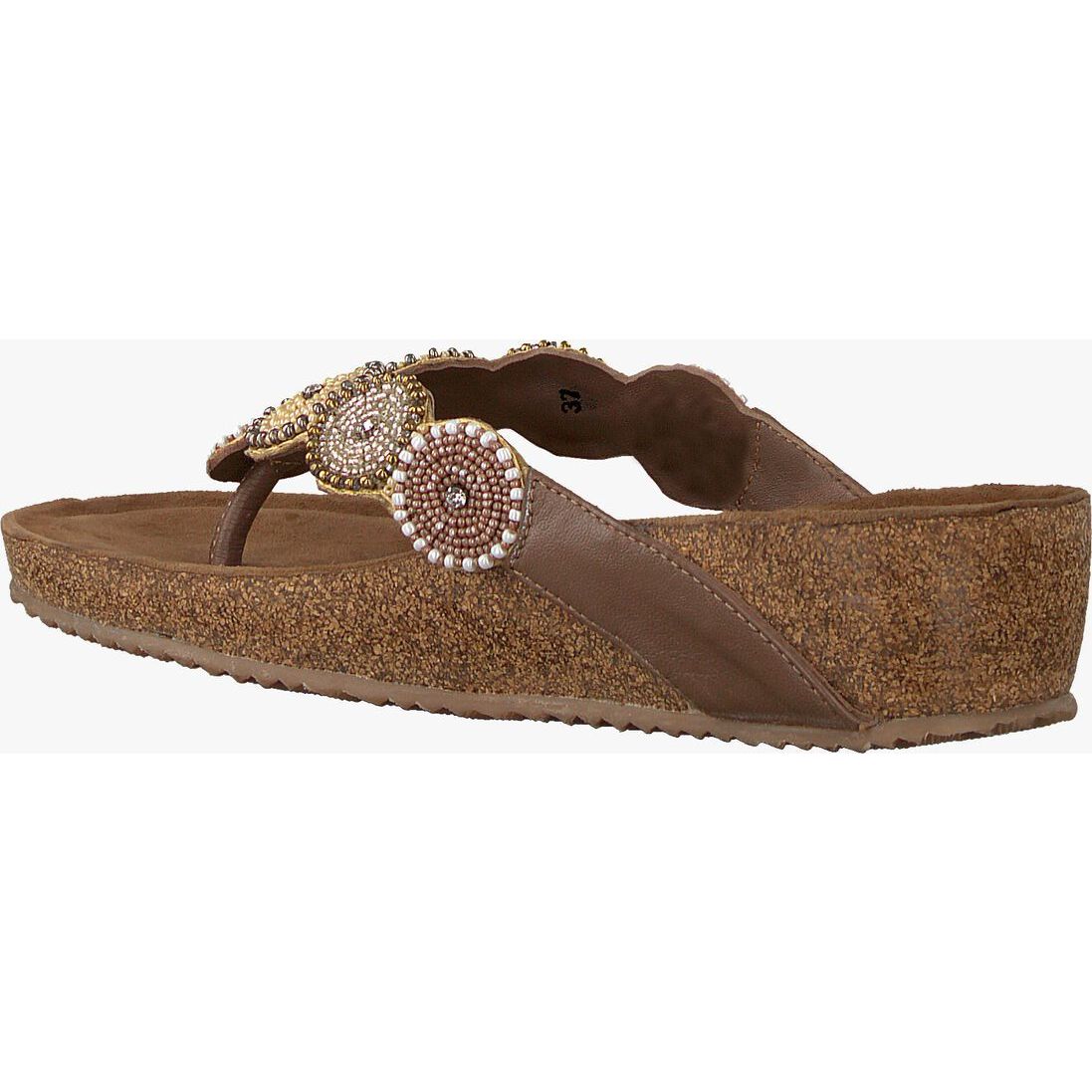 De teenslipper van Lazamani in Beige/Goud leer is uitgevoerd met kralen op de banden. Door de sleehak en het verende suede voetbed heeft de slipper een fijn loopcomfort.