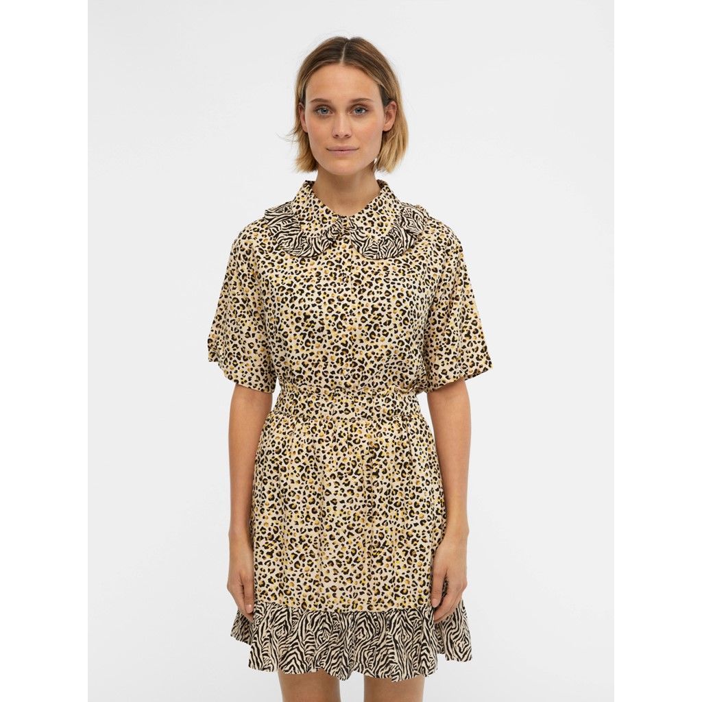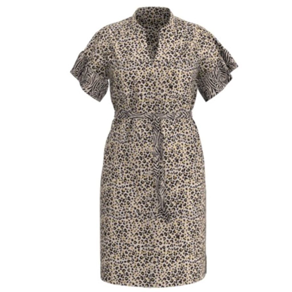 Deze jurk van Object is beige van kleur. De jurk heeft een all-over panter print met op de mouwen een zebra print. De jurk heeft een v-hals en een strikceintuur.