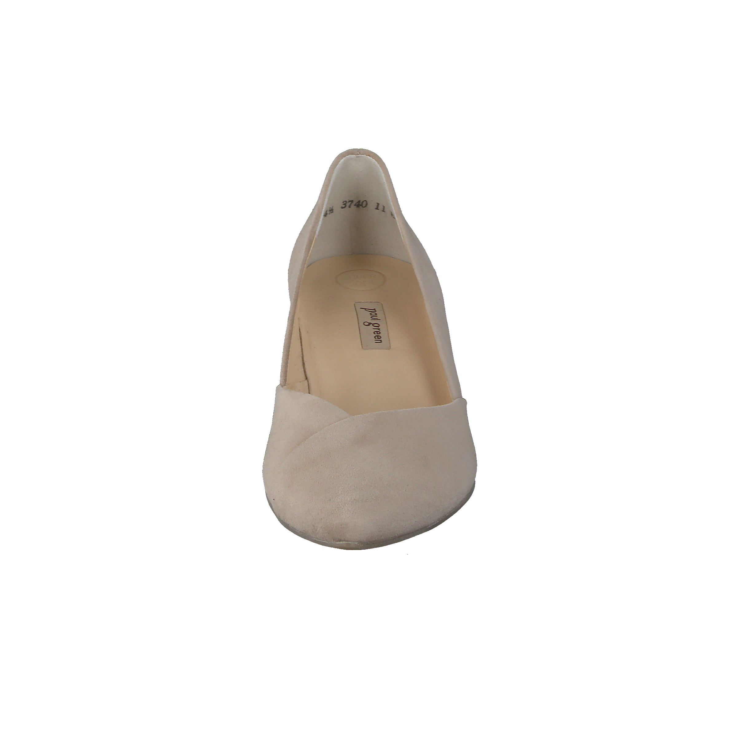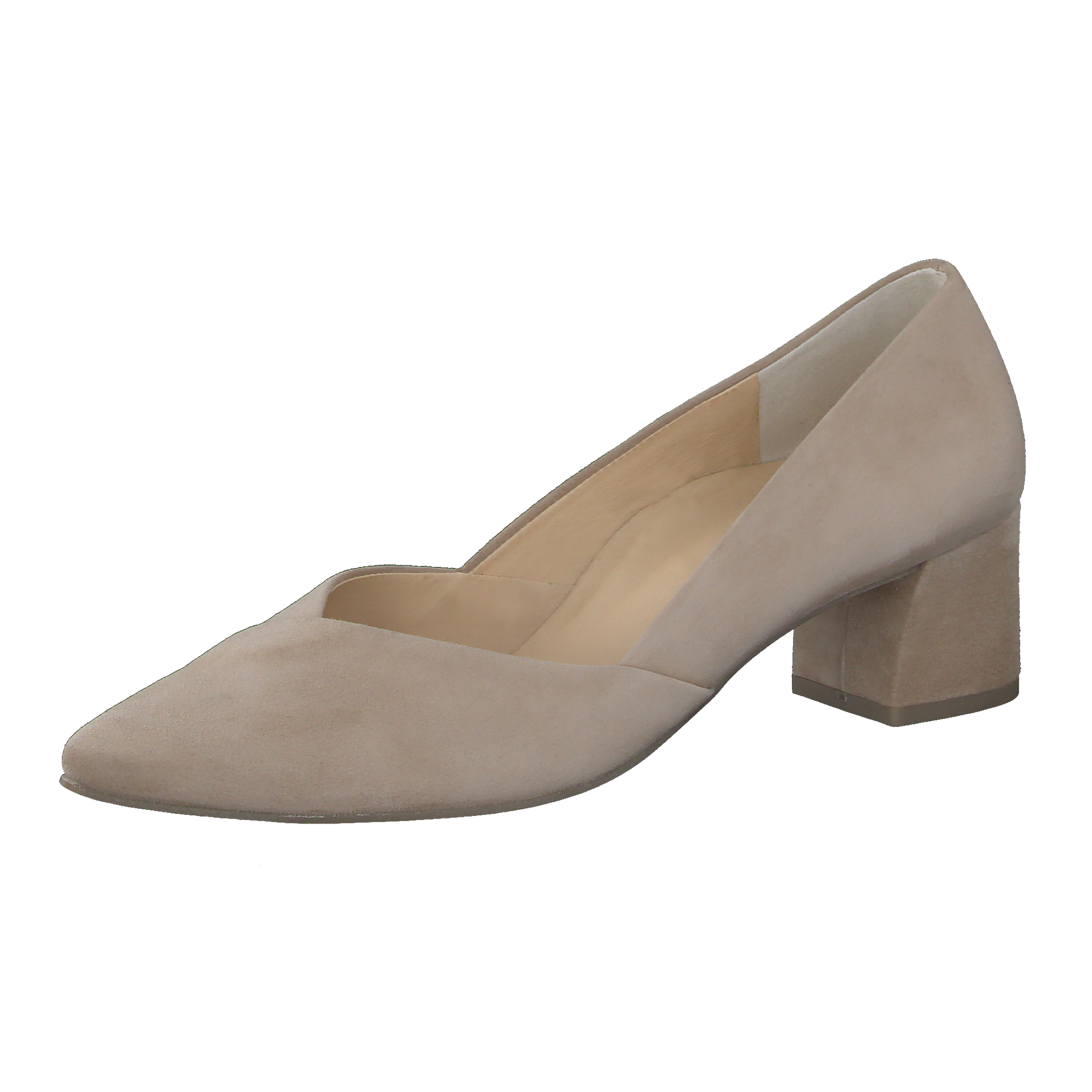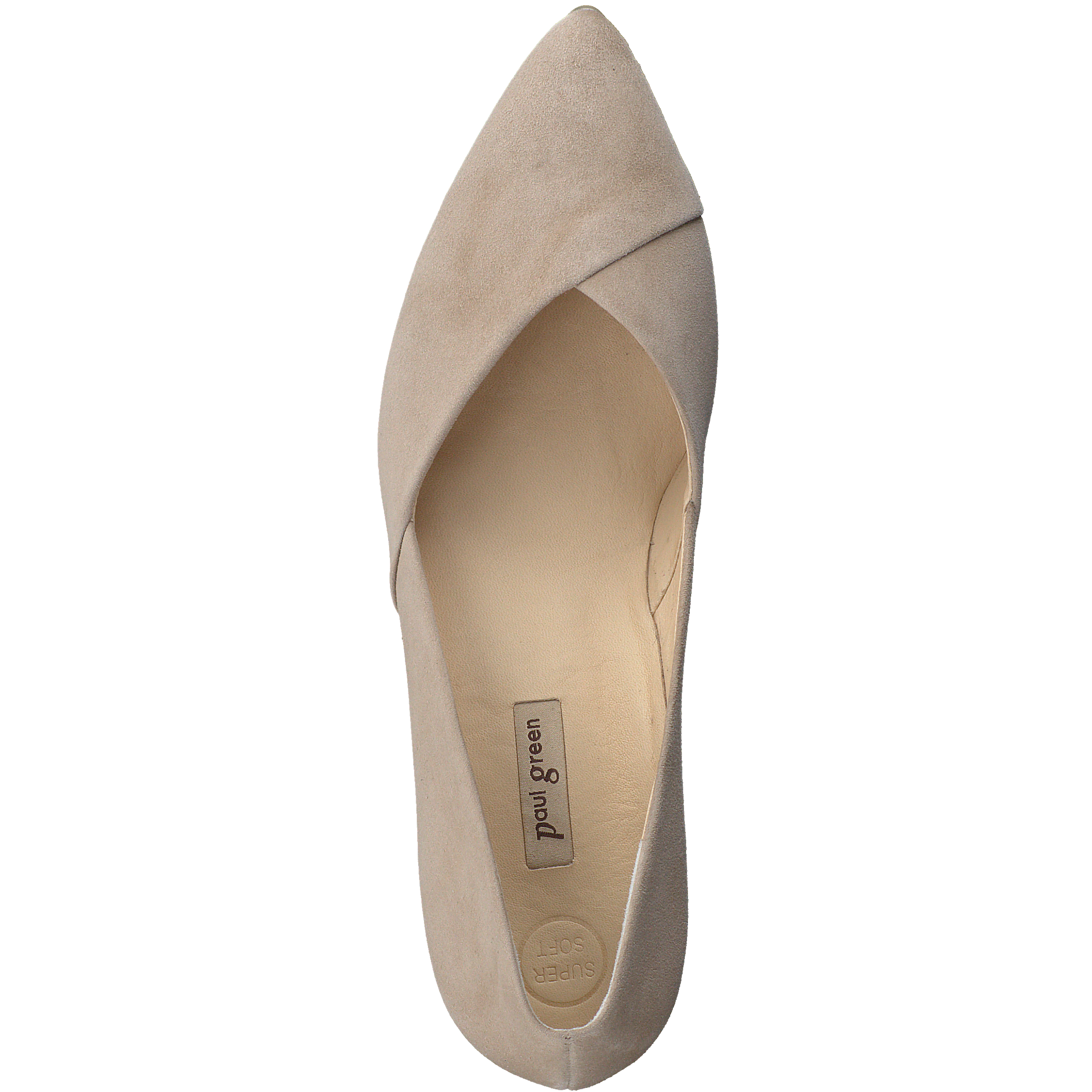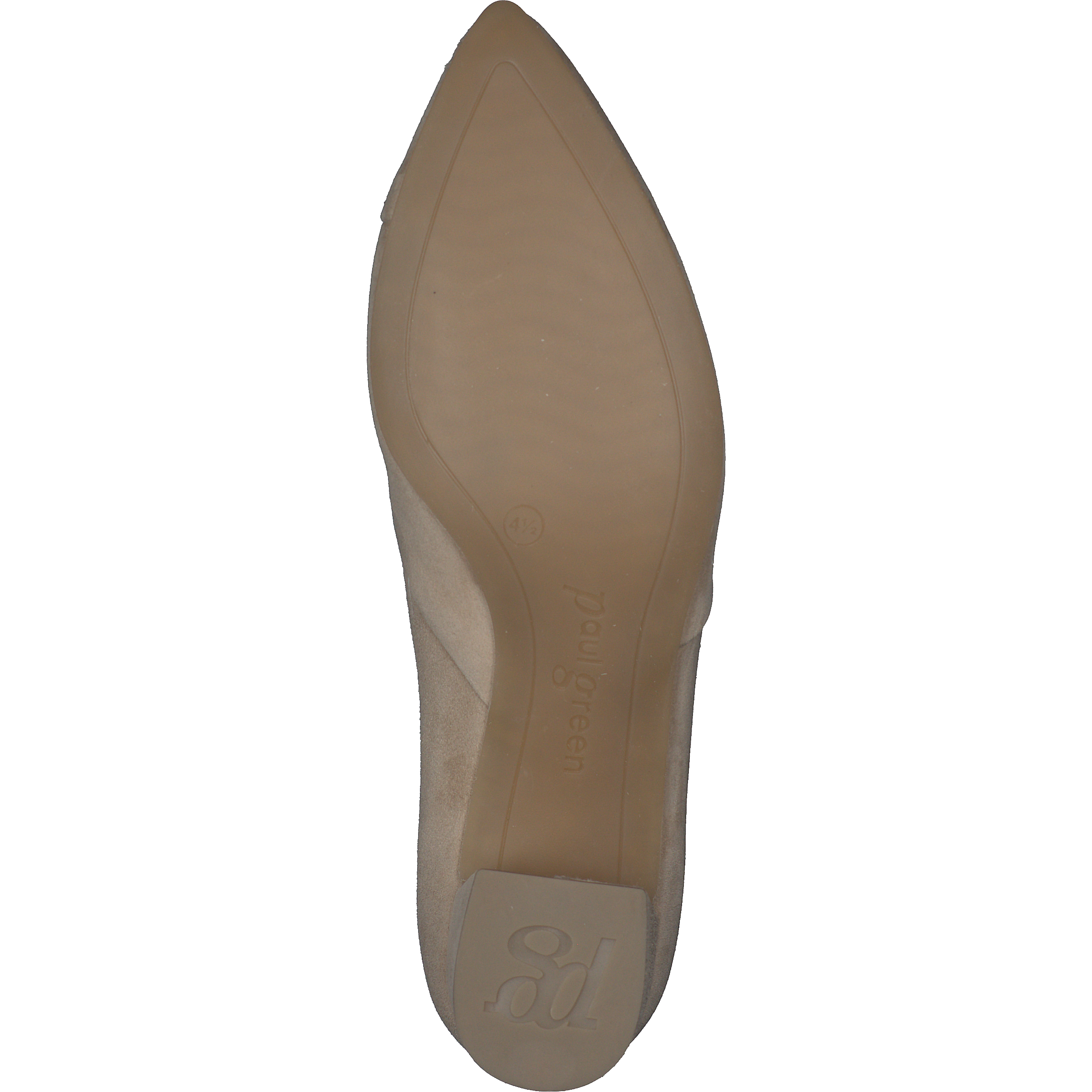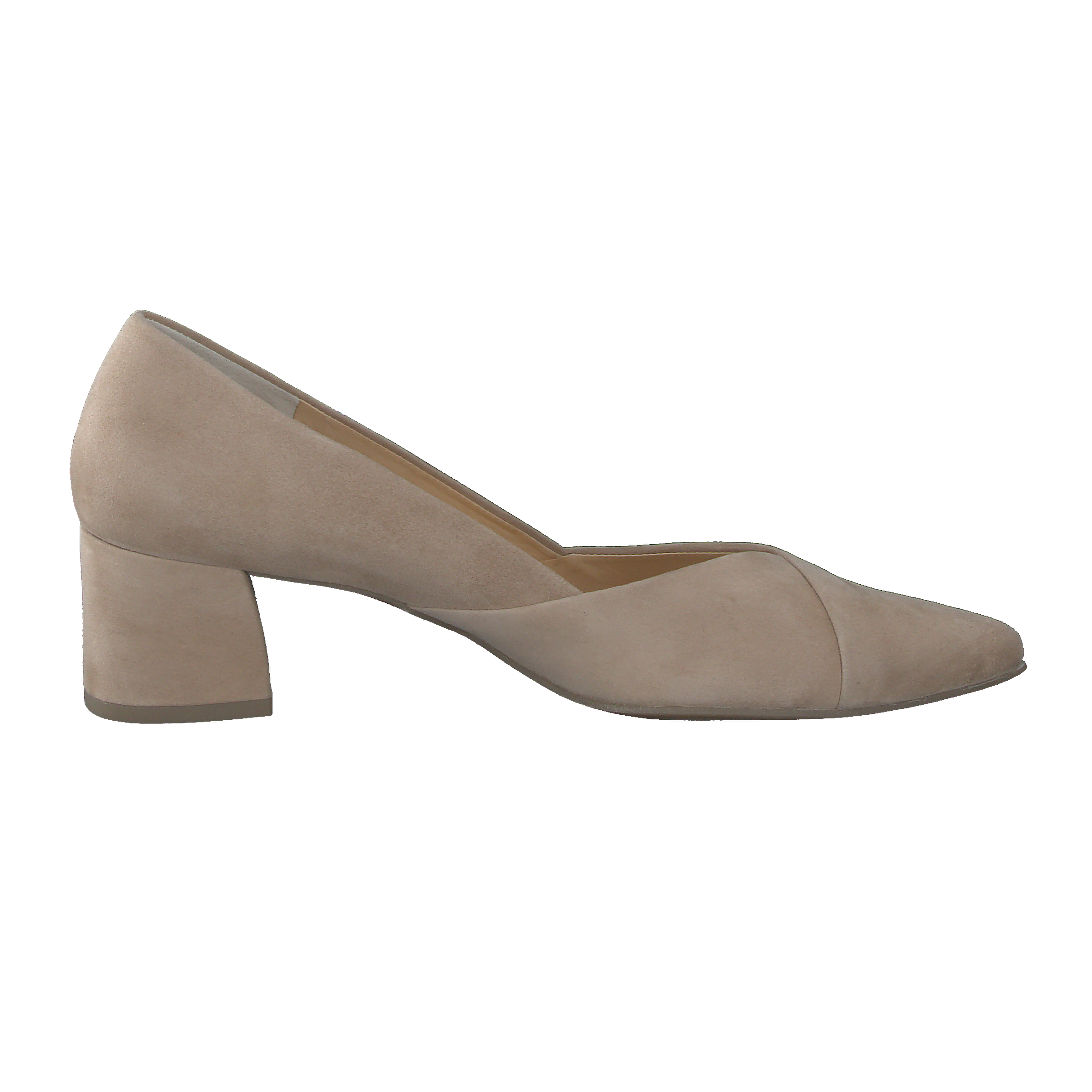 De Zandkleurige suede pump van Paul Green heeft door de v-uitsnede op de voorvoet een slanke look. Het voorgevormde voetbed geeft een goede ondersteuning en een optimaal loopcomfort. De brede, beklede hak maakt dat de pump stabiel loopt.