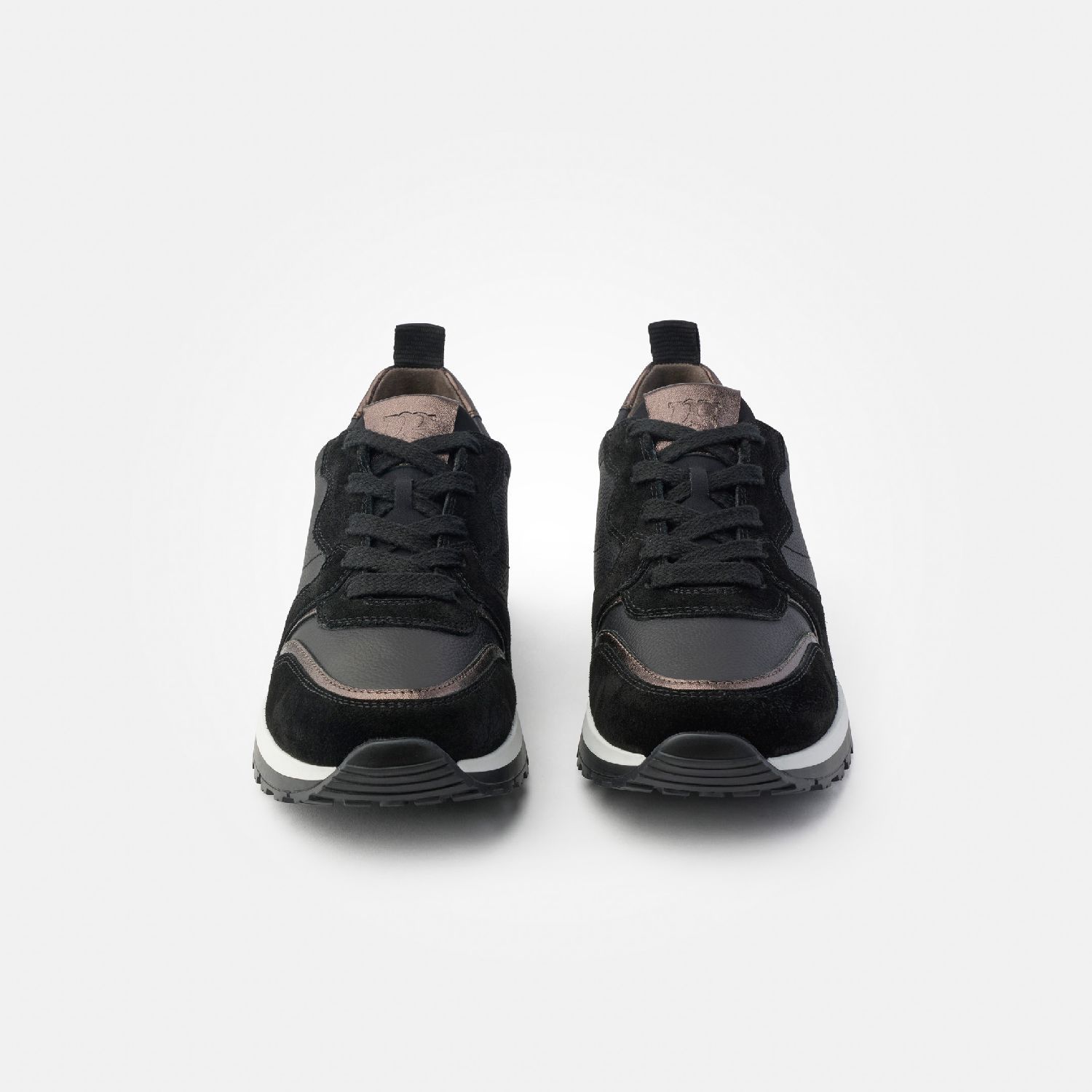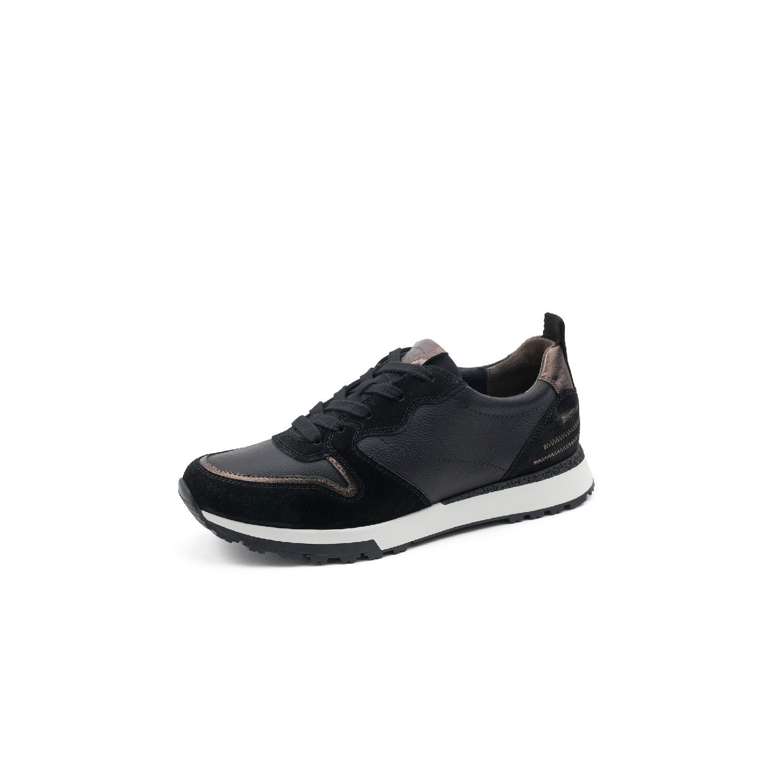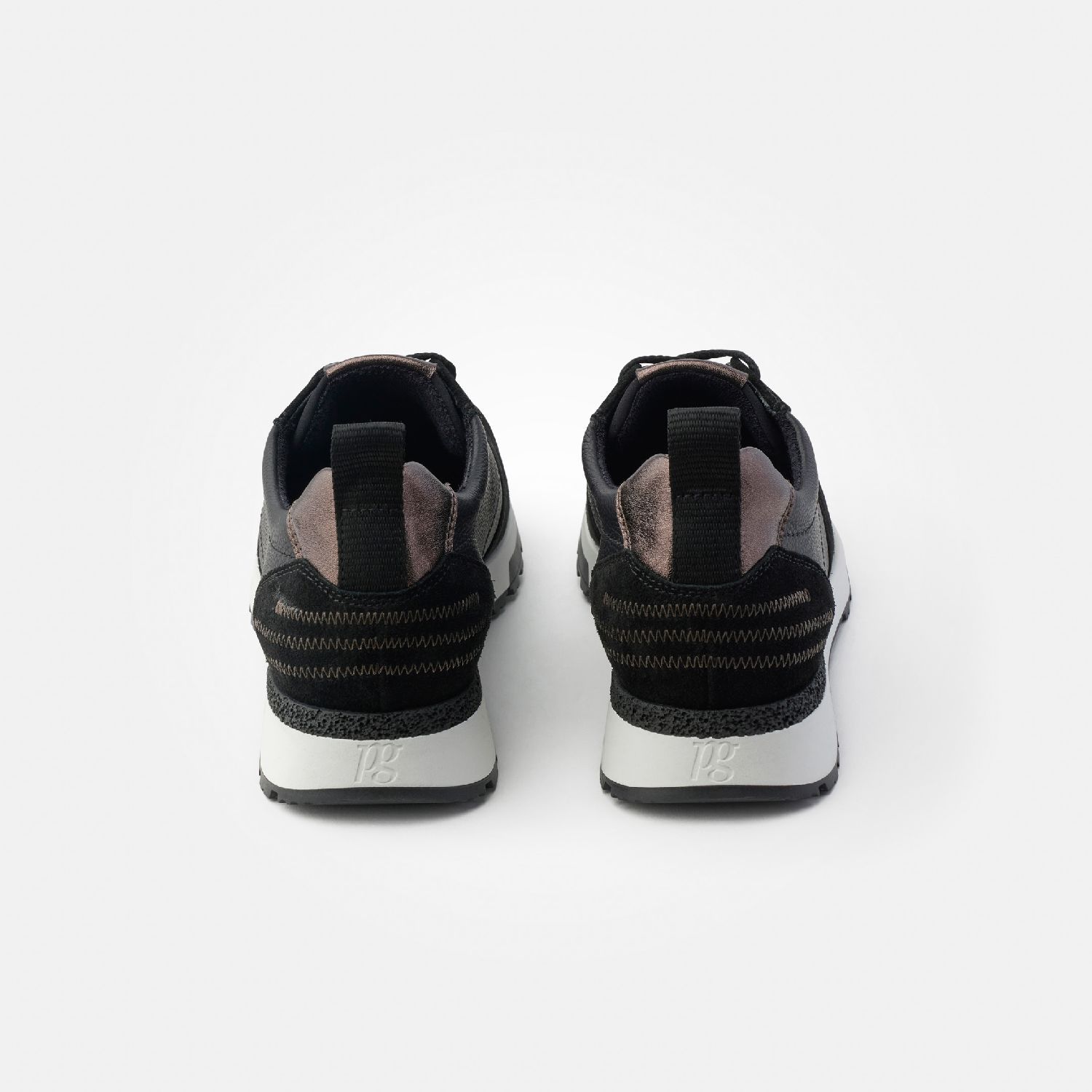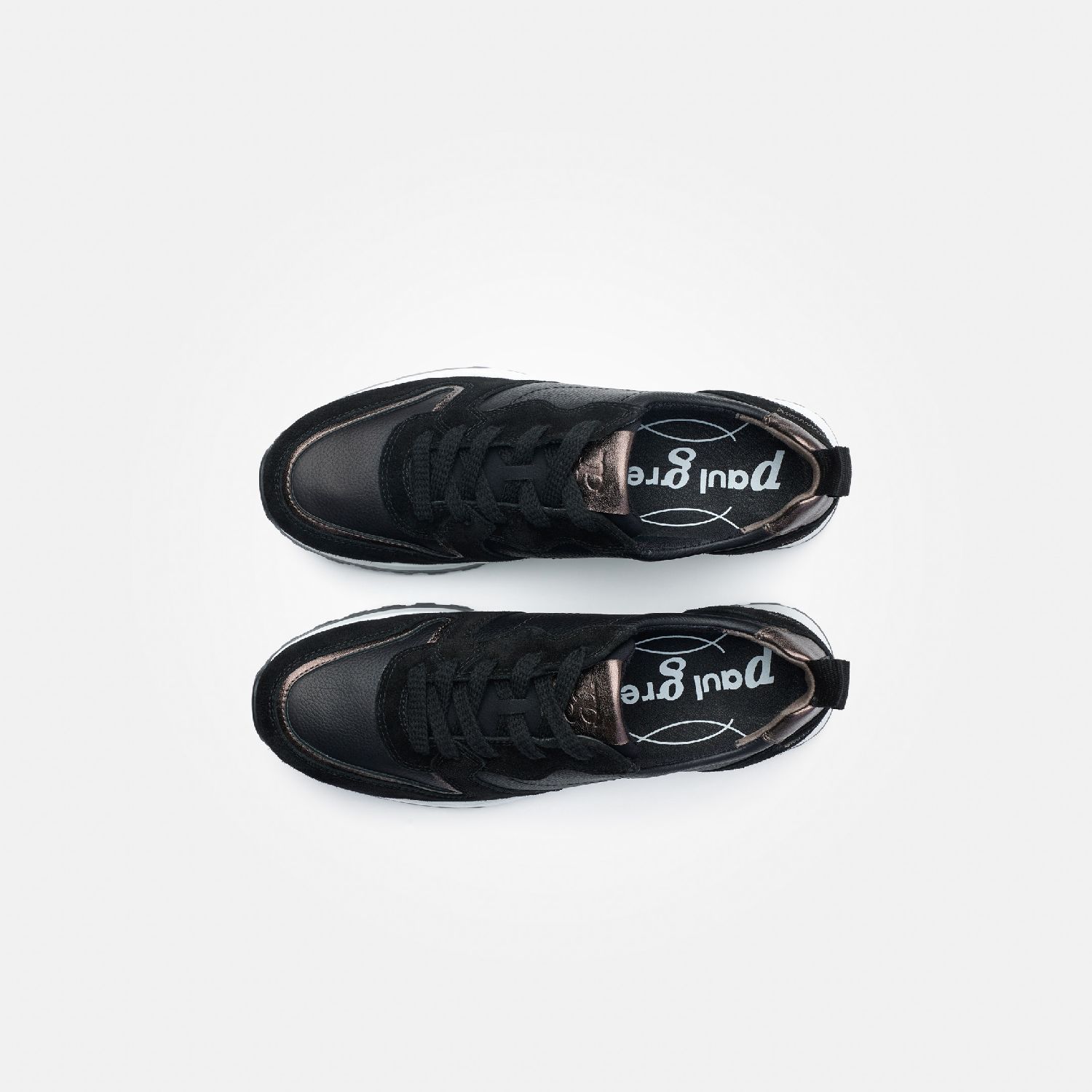 Deze zwarte sneaker voor dames is gemaakt van soepel zwart suede en kalfsleer met metallic accenten. De sneaker heeft een flexibele rubberzool met verende tussenzool. Paul Green sneakers combineren stijl en comfort optimaal door gebruik van mooie en comfortable materialen, goede pasvorm en een uitneembaar voetbed zodat ook een eigen voetbed mogelijk is.