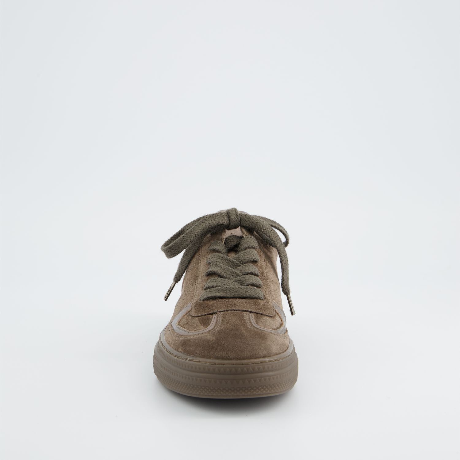 Suede retro sneaker voor dames gemaakt van zacht en soepel suede in de kleur Earth met metallic accenten. Deze sportieve veterschoen heeft een zachte badstof binnenvoering en een comfortabel zacht uitneembaar voetbed. De soepele rubberzool geeft goede grip en een elegant sportieve uitstraling.