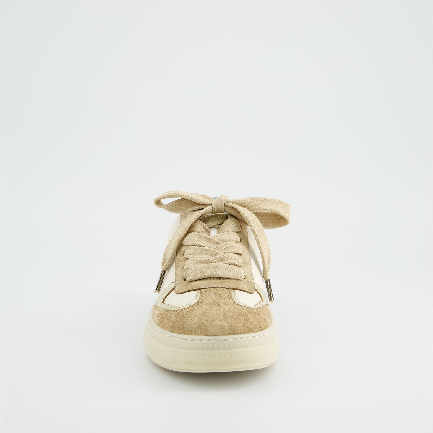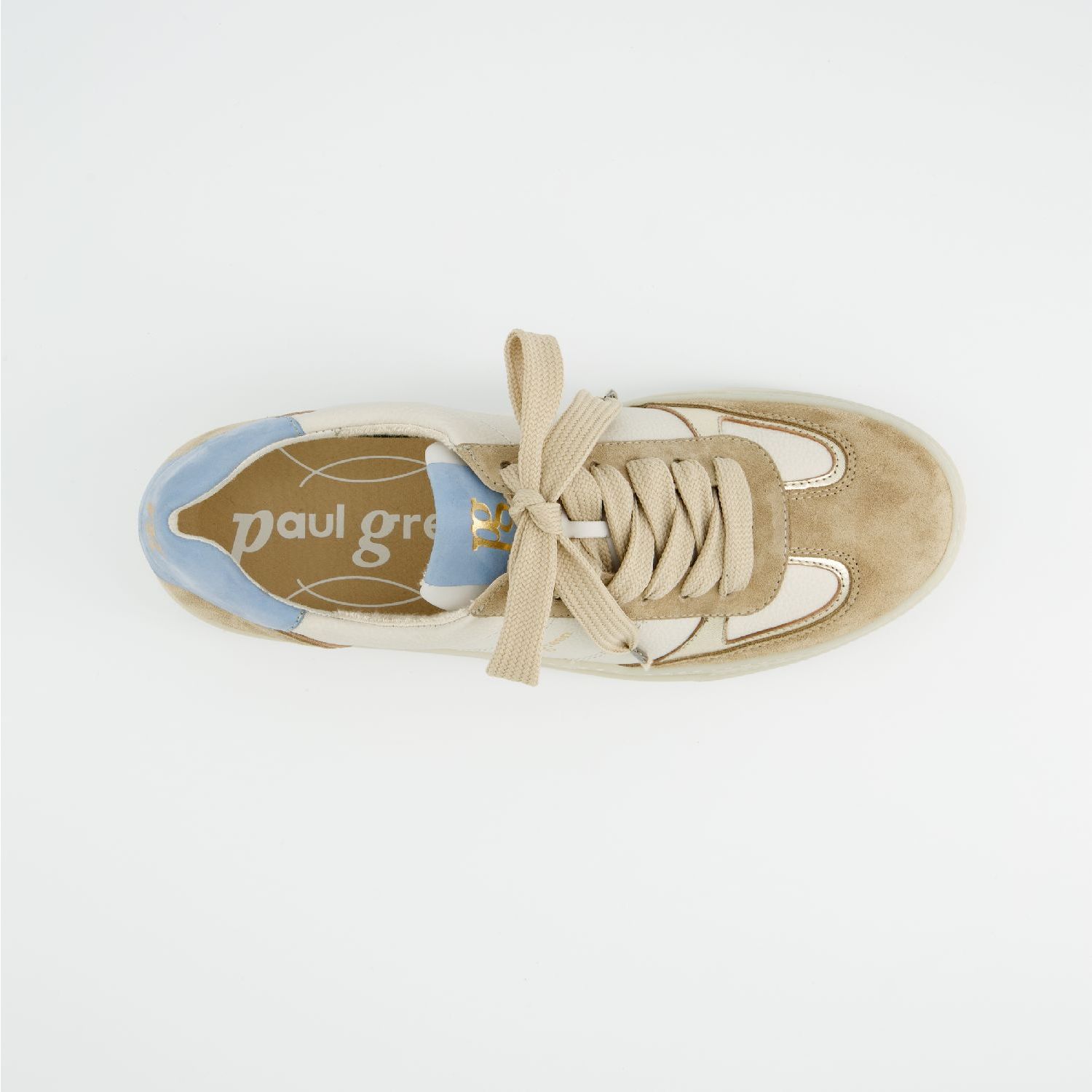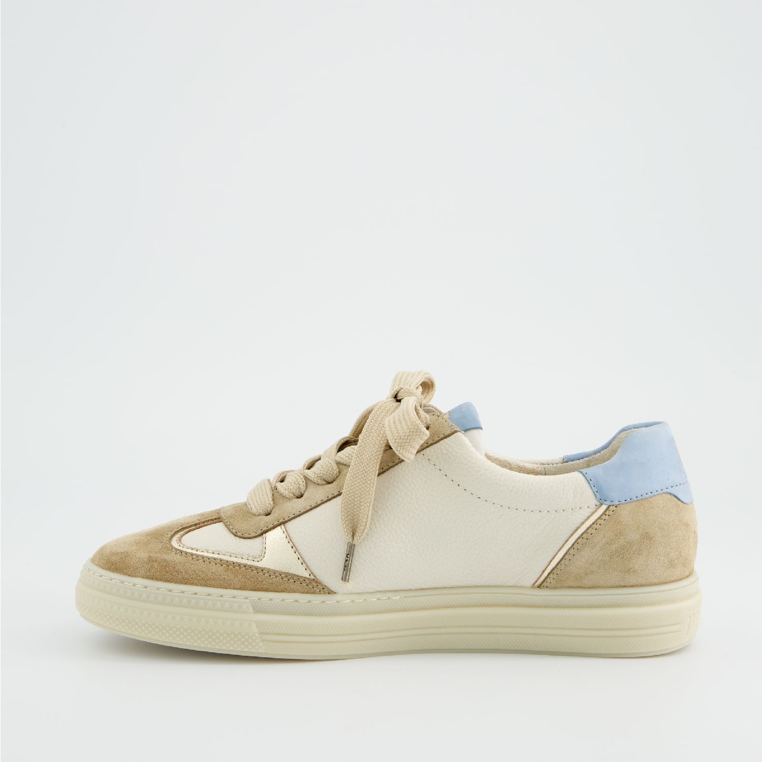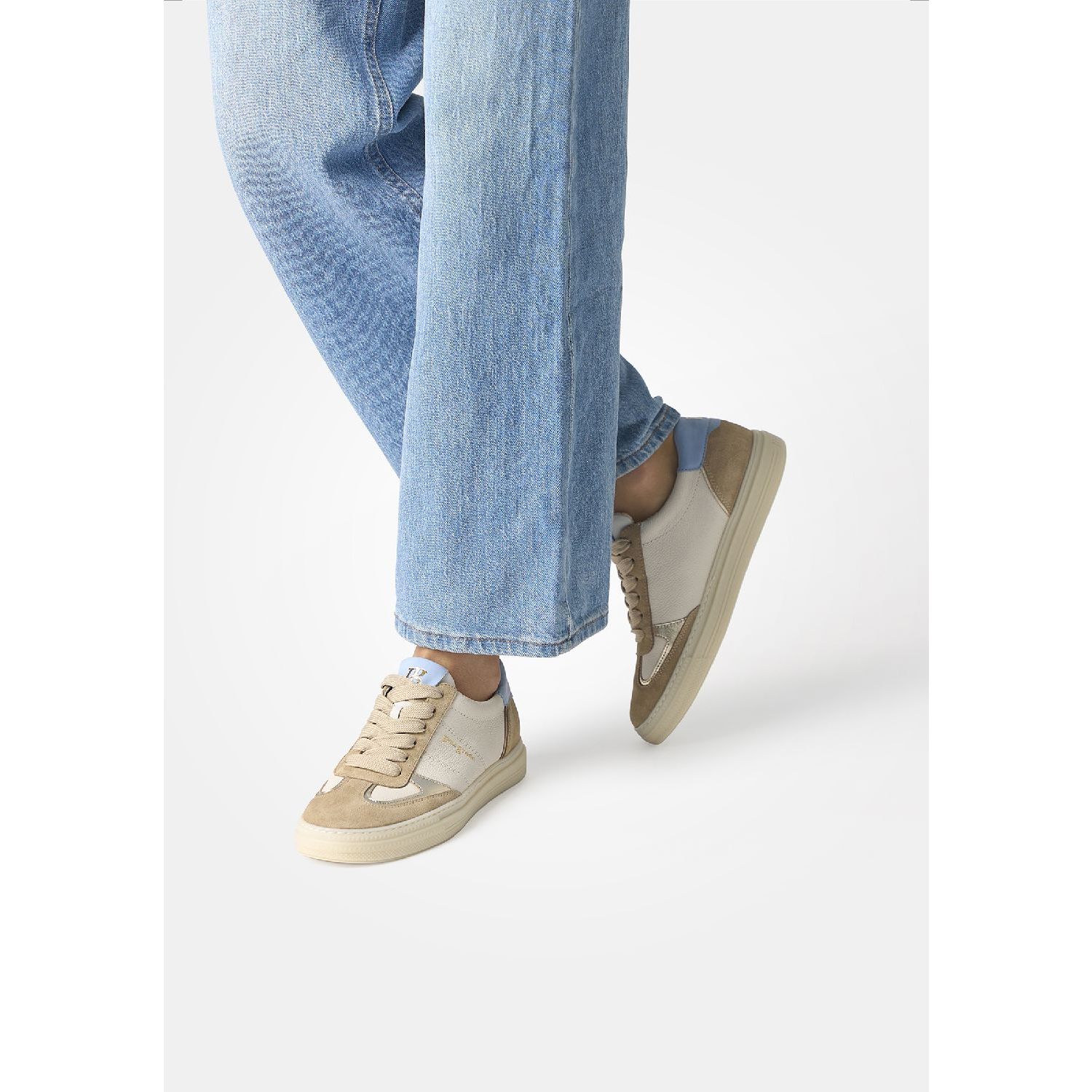 Deze supersoft gemaakte sneaker voor dames combineerd stijl en een trendy look met een perfekte pasvorm door het gebruik van alleen de beste materialen en een enorm vakmanschap. De sneaker is gemaakt van soepel en zacht offwhite leer in combinatie met beige suede, blauw nubuck en metallic gouden accenten. De zachte badstof binnenvoering en het uitneembare voetbed zorgen voor een fijn comfort de hele dag lang. De soepele rubberzool geeft grip en comfort en benadrukt de retro look van deze morderne sneaker.