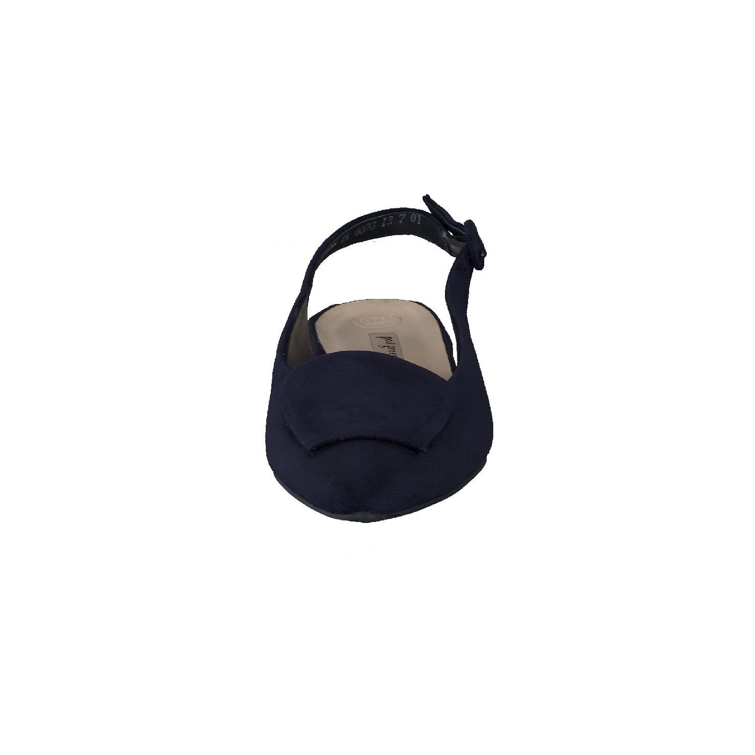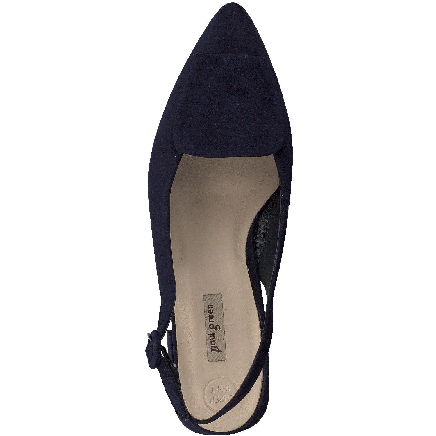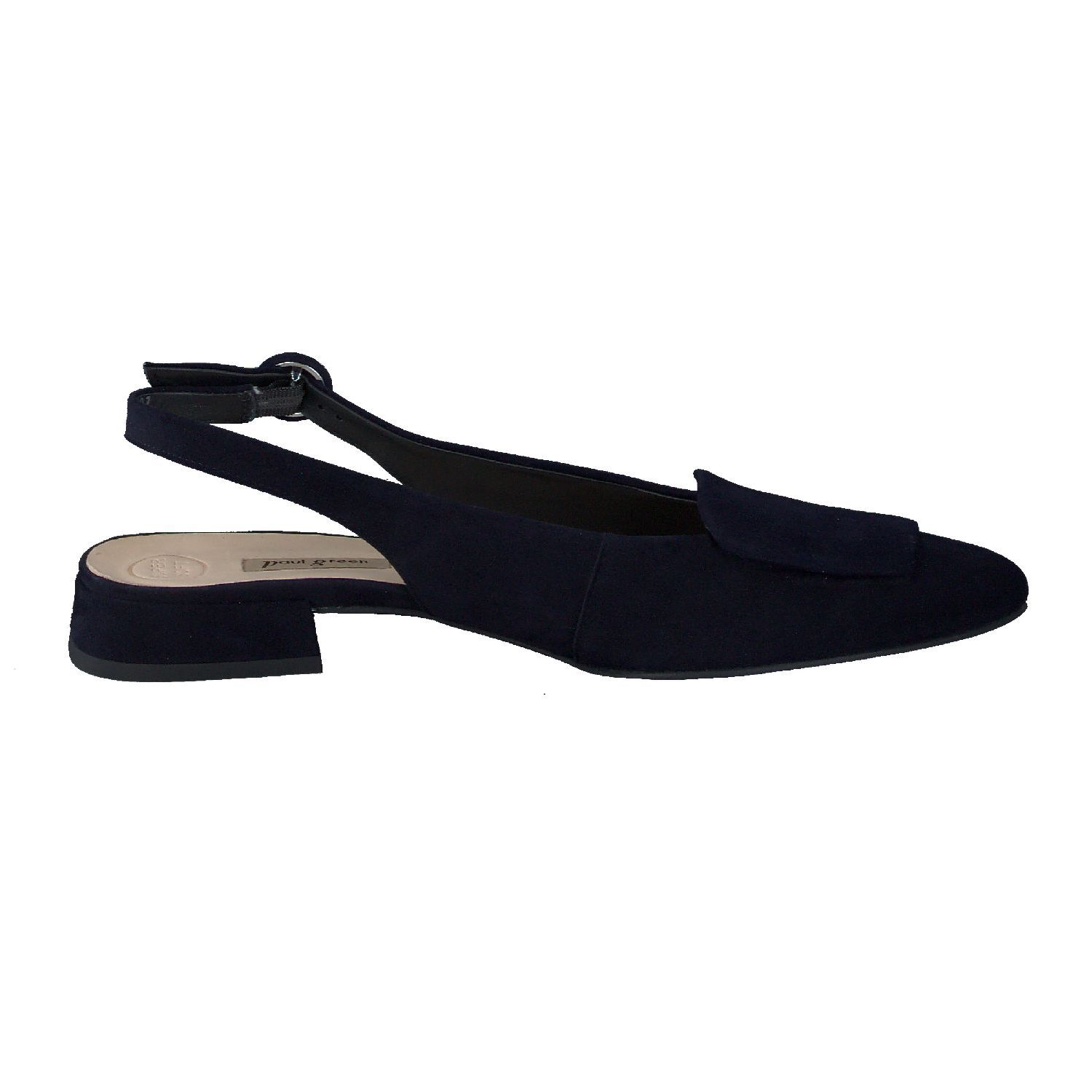 Deze elegante slingback van Paul Green is gemaakt van zacht suede in de kleur donkerblauw met een subtiele suede klep op de voorvoet. Met de verstelbare band in de hiel is de schoen makkelijk aan te trekken en blijft goed zitten tijdens het lopen. Het plattehakje loopt comfortabel en staat elegant in combinatie met het slanke leestje.
