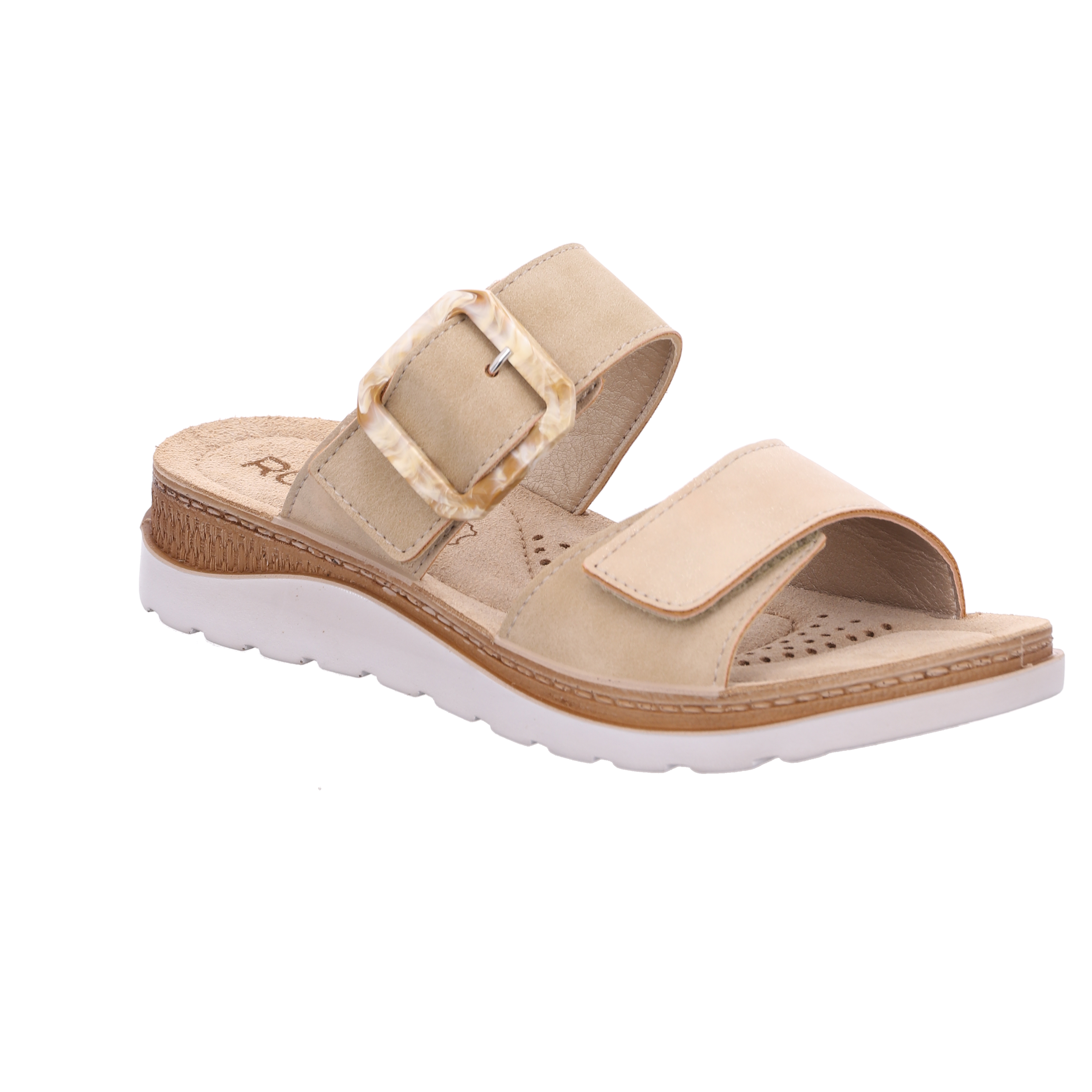 Beige zomerse slipper voor dames gemaakt van een combinatie van beige leer en suede met een metallic finish. Dankzij de twee klittebandsluitingen over de wreef past je deze comfortabele slipper perfekt aan de voet. Deze zomermuil heeft een zacht leren voering en voetbed en een soepele rubberzool.