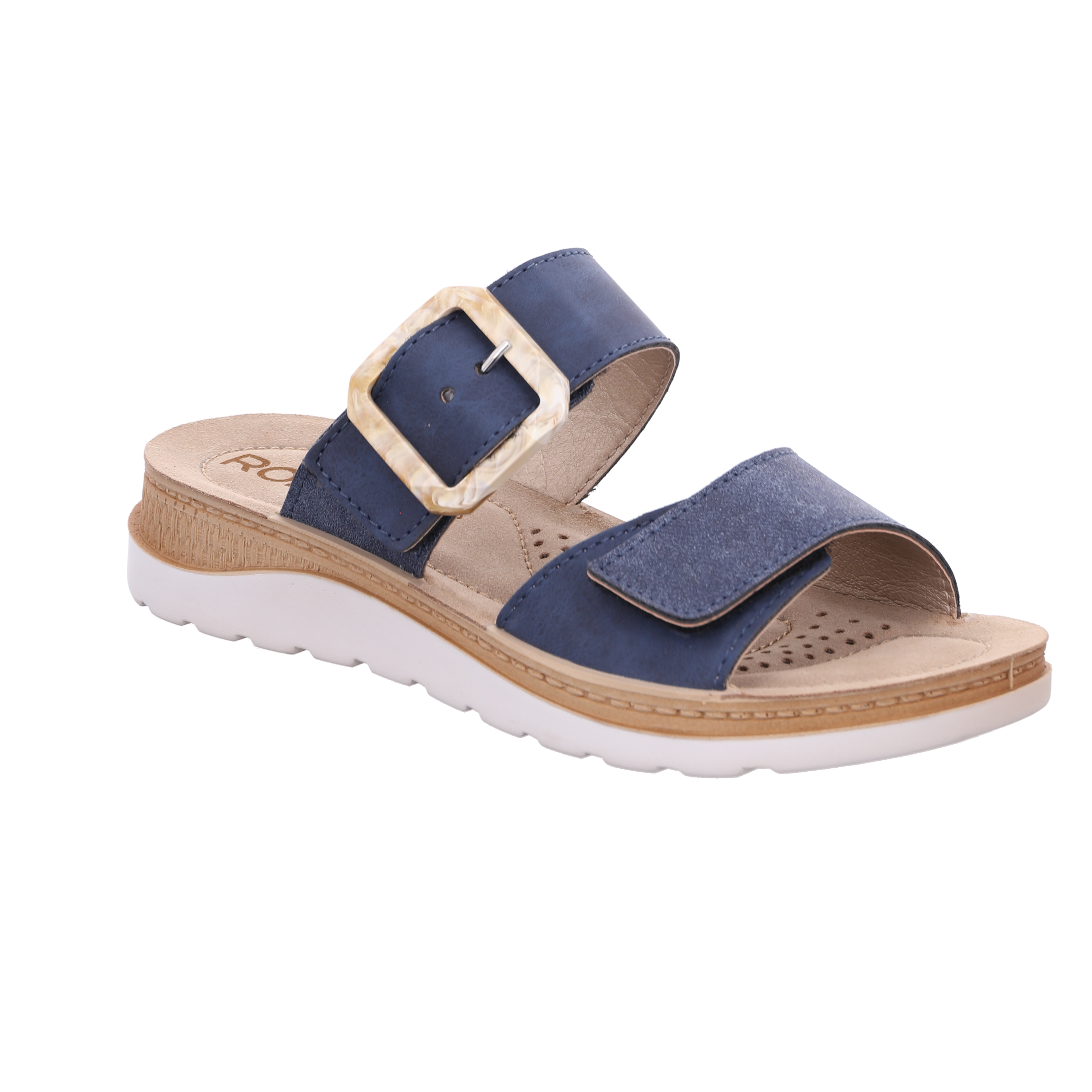 Blauwe zomerse slipper voor dames gemaakt van een combinatie van donkerblauw leer en suede met een metallic finish. Dankzij de twee klittebandsluitingen over de wreef past je deze comfortabele slipper perfekt aan de voet. Deze zomermuil heeft een zacht leren voering en voetbed en een soepele rubberzool.