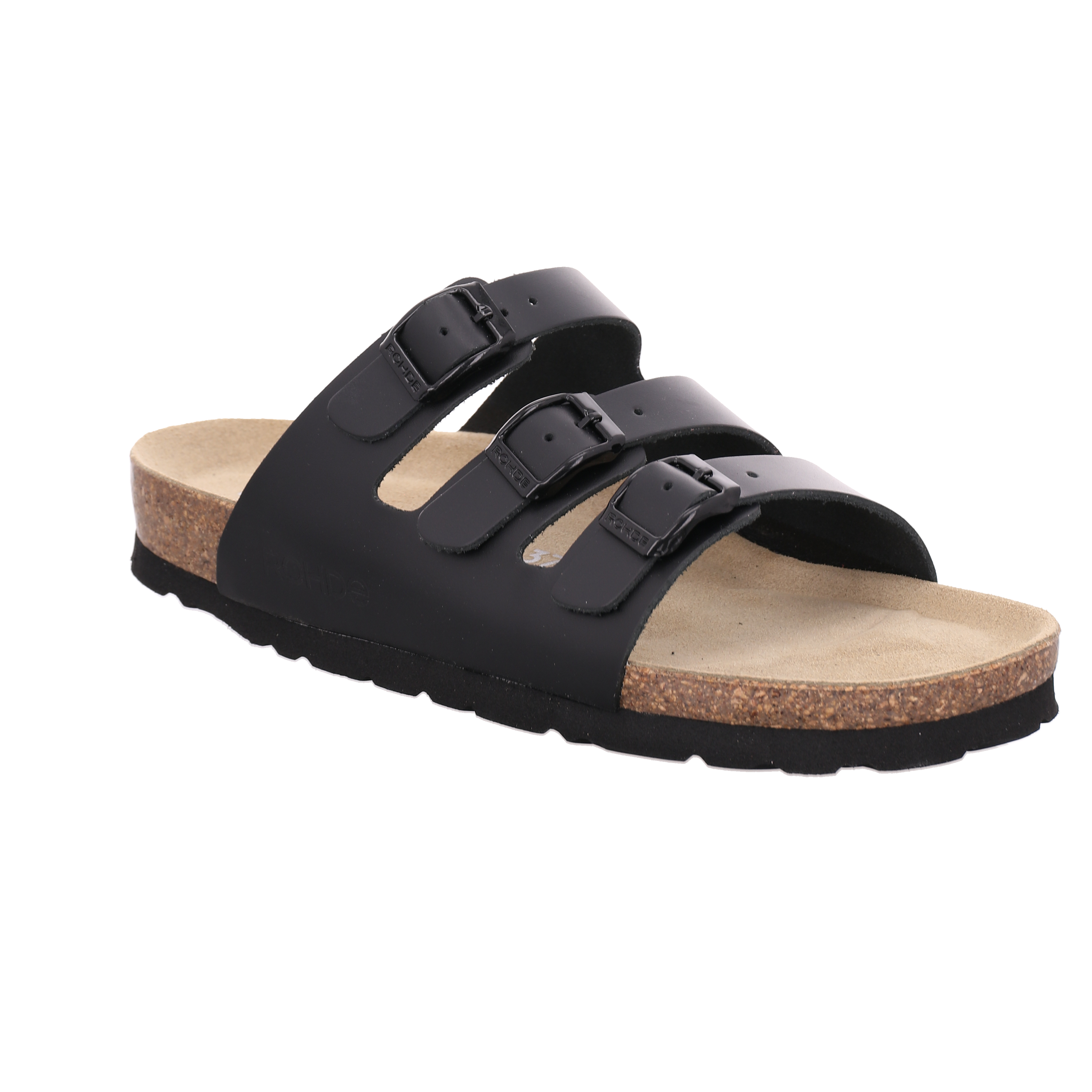 De Alba 5615 is een comfortabele slipper voor dames met drie banden met gespsluiting en een zacht en ondersteunend voetbed. De verende tussenzool van kurk en de stevige rubberzool zorgt voor veel comfort en grip bij elke stap. De 5615-90 Black is zwart leren slipper die prima te combineren is bij je zomerse outfit.
