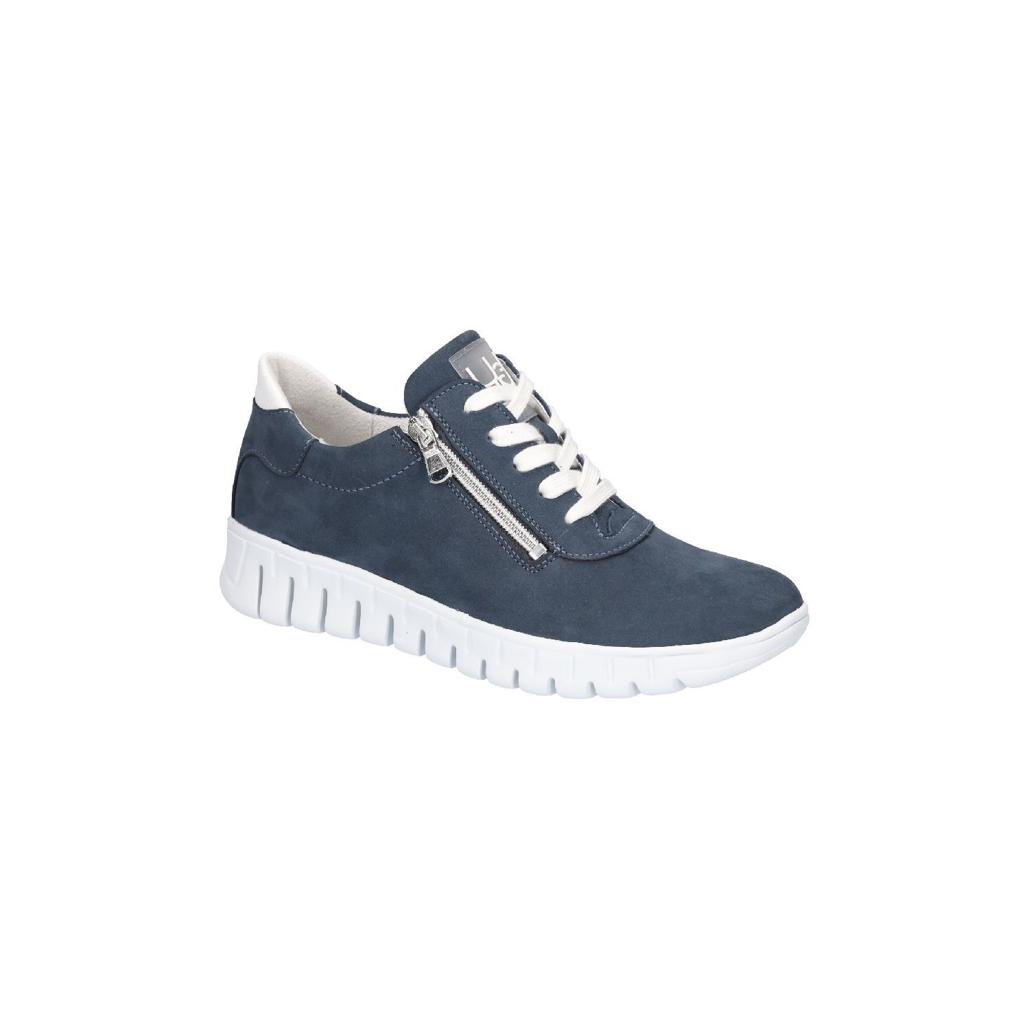 Trendy donkerblauwe sneaker voor dames gemaakt van soepel nubuck. Naast de vetersluiting heeft deze lichtgewicht sneaker ook een handige rits. De binnenvoering is van zacht textiel met een suede hiel voor extra comfort. Dankzij het uitneembare leren voetbed kan de sneaker ook met een eigen voetbed gedragen worden. De wijdte "H" geeft voldoende ruimte voor de bredere voet. De witte sneakerzool is zeer comfortabel en soepel.