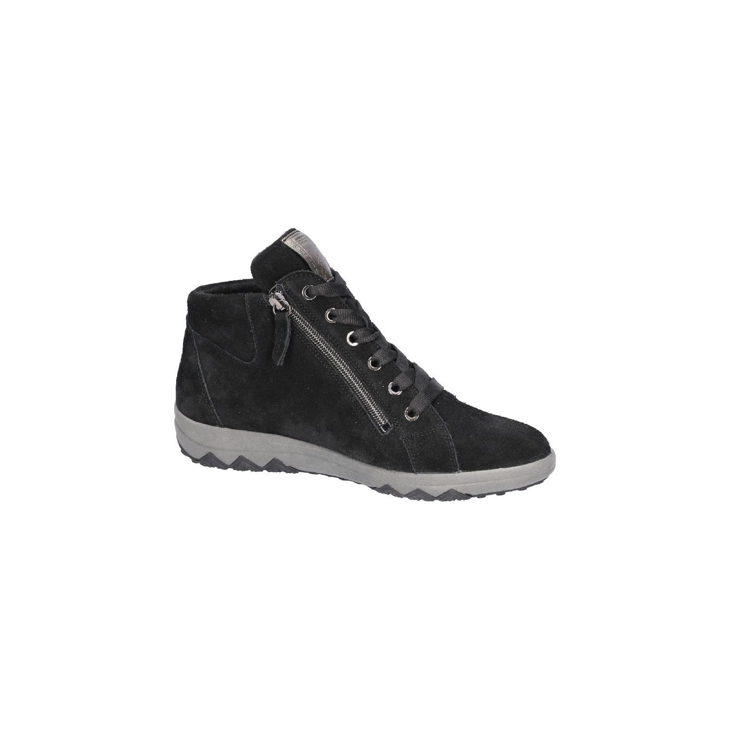 Halfhoge sneaker voor dames gemaakt van zwart suede. Naast de vetersluting heeft deze sportieve veterschoen voor dames ook twee gemakkelijke ritsjes voor een ruimere instap. Het comfortabele voetbed is uitneembaar zodat ook een eigen voetbed gebruikt kan worden. De soepele rubberzool geeft goede grip en een optimaal loopcomfort. De wijdte van deze schoen is 'H' zodat deze prima geschikt is voor een bredere voet