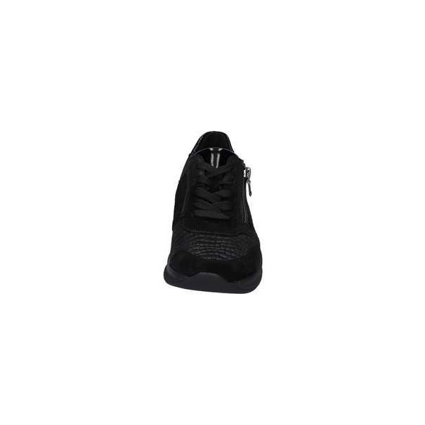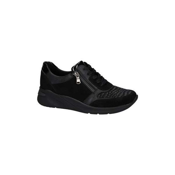 Zwart suede sneaker voor dames met een ritsje naast de vetersluiting voor het gemak. Deze comfortabele veterschoen heeft een zachte binnenvoering en uitneembaar voetbed. De voorvoet heeft zachte stretch die comfortabel zacht aanvoelt. Een eventuele hallux krijgt de ruimte in deze lichtgewicht sneaker.