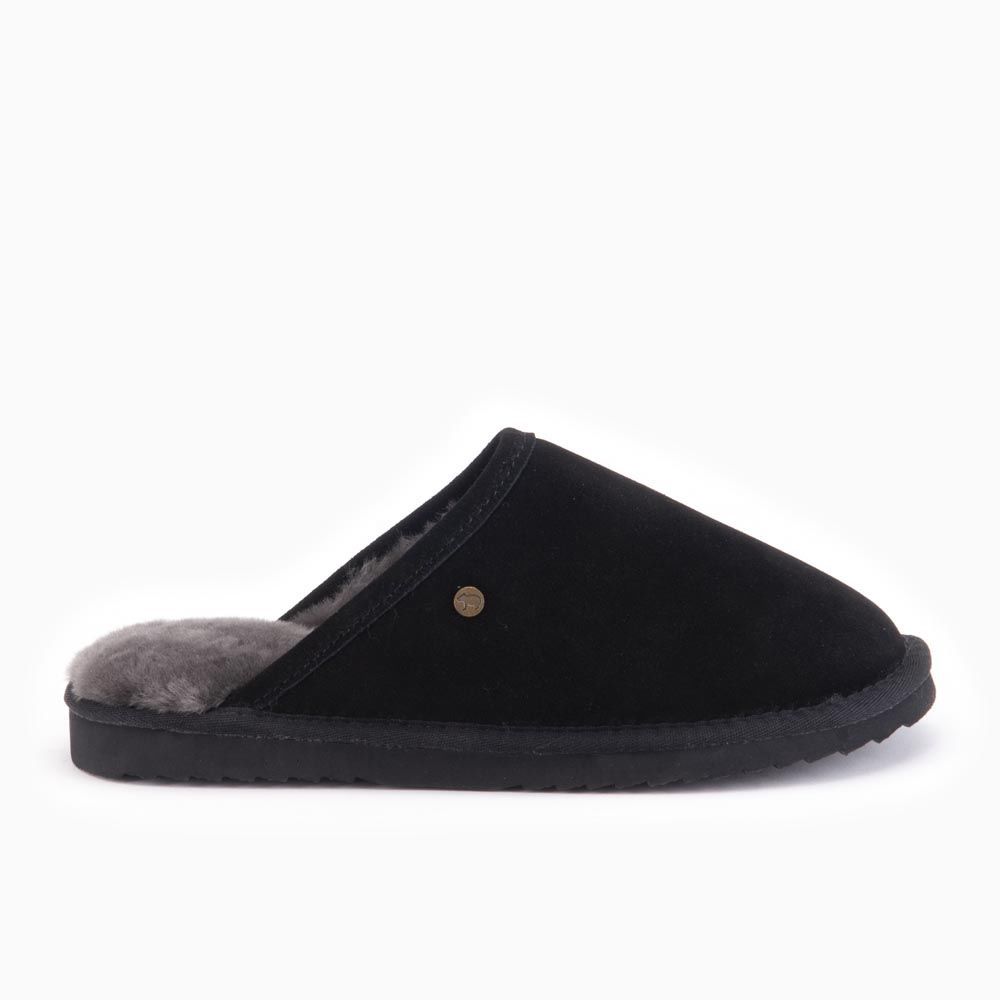 Heren slipper in zwart suede op een stevige zool met een voering van 100% Merino wol.