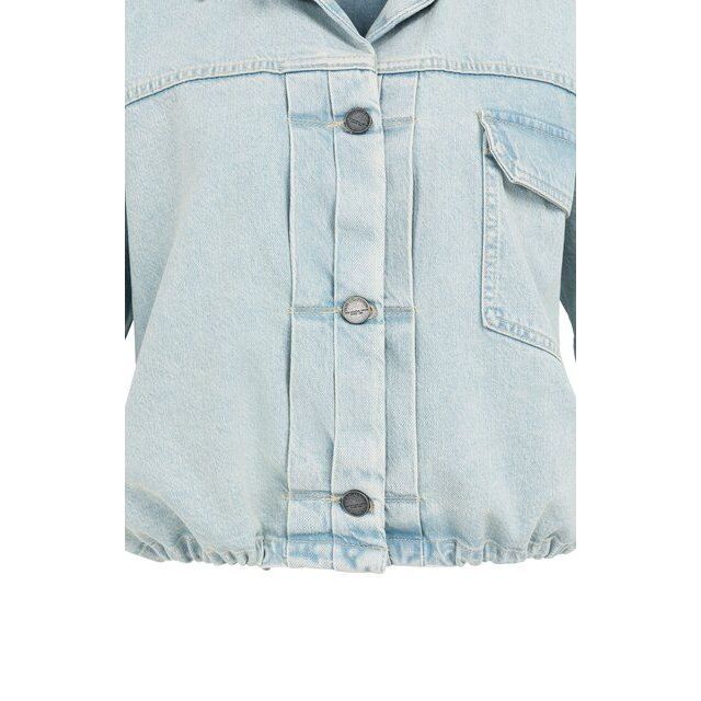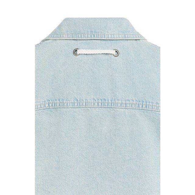Het 'worker' ontwerp herken je aan de karakteristieke opgestikte zakken op de voorzijde en de iets rechtere, boxy pasvorm. Dit geeft het jasje een moderne, nonchalante look die minder strak is dan een traditioneel denim jack. De subtiele details, zoals de knoopsluiting en de verfijnde kraag, zorgen ervoor dat het jasje zowel open als dicht gedragen kan worden als een stijlvolle tussenlaag of zomerjas.