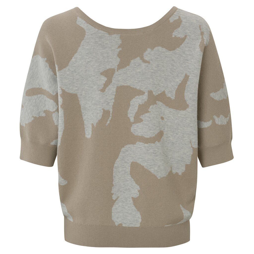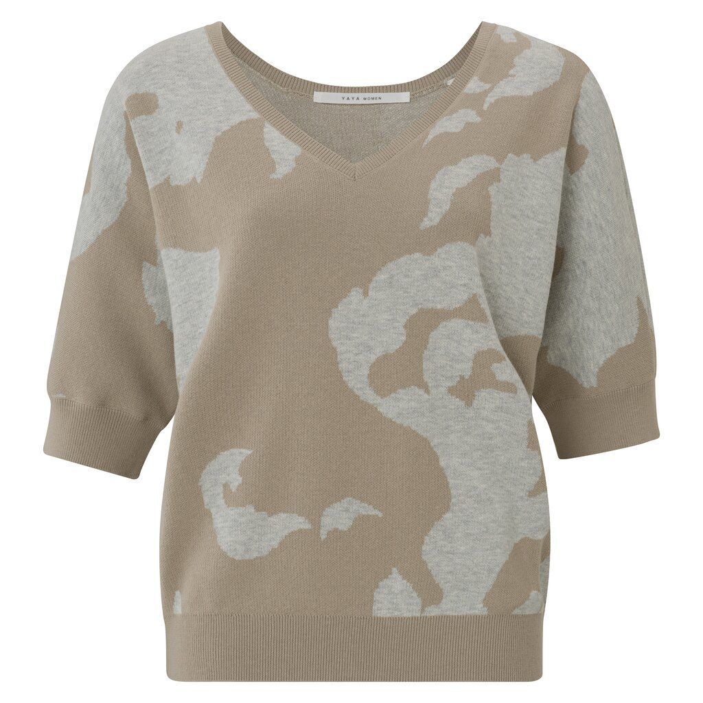 Deze trui van Yaya is bruin van kleur. De trui heeft een all-over print van beige en grijs. De mouwen zijn driekwart en de trui heeft een v-hals.