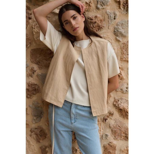 Het jack is vervaardigd uit een hoogwaardige, ademende kwaliteit die soepel valt en een luxe structuur heeft. De mouwloze snit en de subtiele details, zoals de verfijnde kraag en de minimalistische sluiting, geven het item een utilitaire maar vrouwelijke uitstraling. Of je het nu open draagt over een witte lichte sweater voor een nonchalante look, of dichtgesnoerd op een wijde jeans voor een krachtiger silhouet: dit item is een ware kameleon. Voeg dit Desert Beige zomerjack van YAYA toe aan je garderobe bij G-level voor een tijdloze en veelzijdige stijl die elk seizoen weer relevant is.
