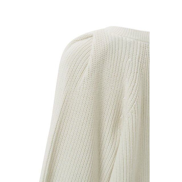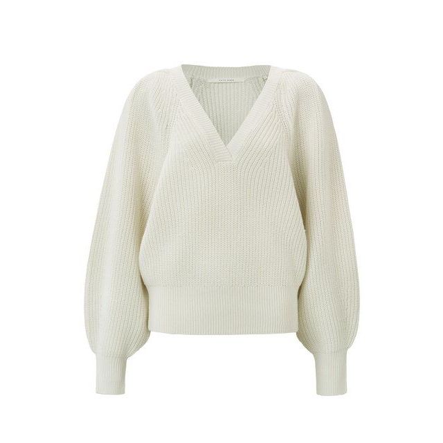 Deze trui van Yaya is wit van kleur. De trui heeft een diepe v-hals en is grof gebreid. De trui heeft pofmouwen en ribdetails om de hals en tailleband.